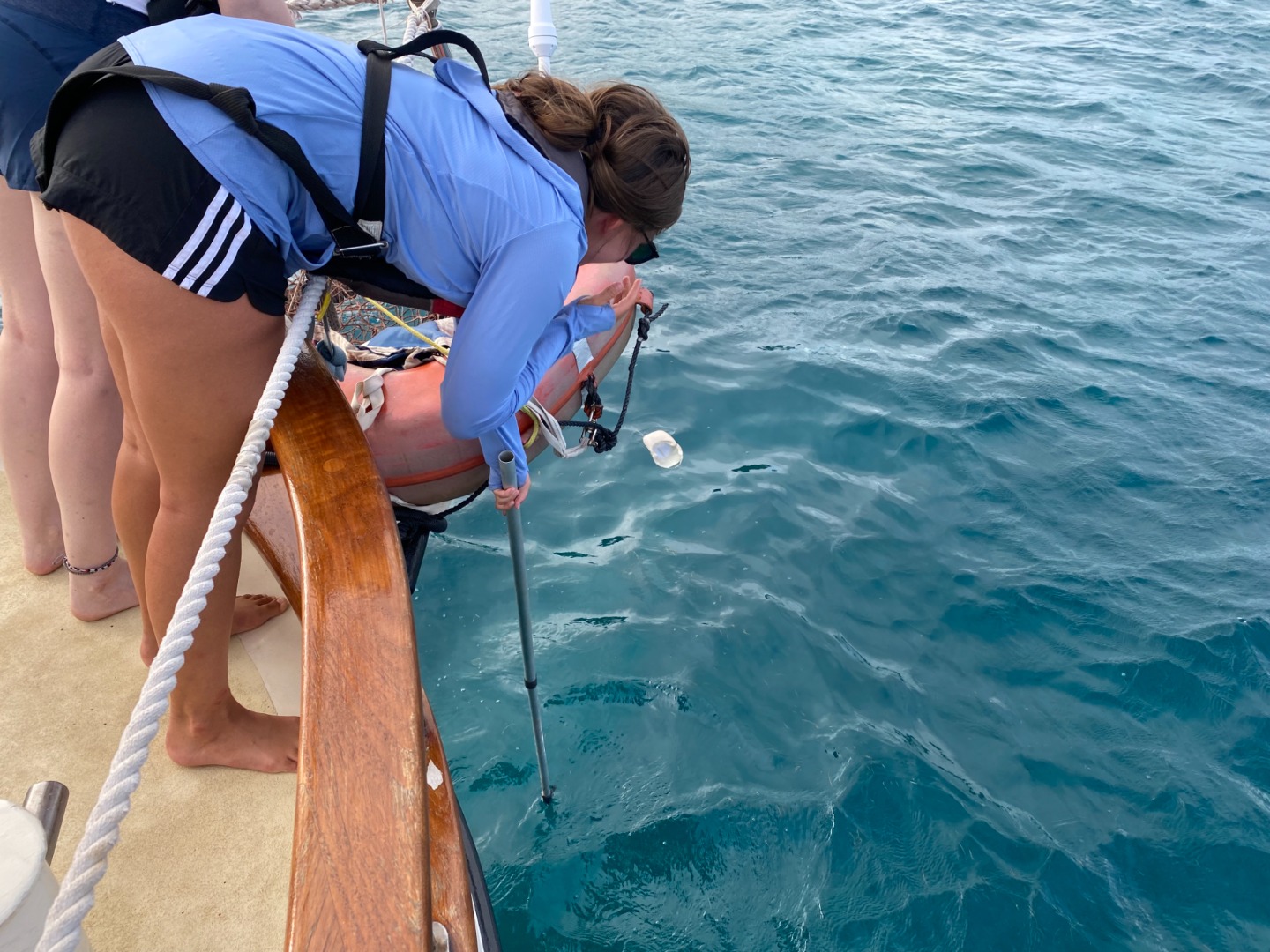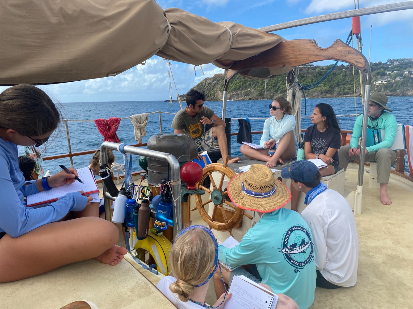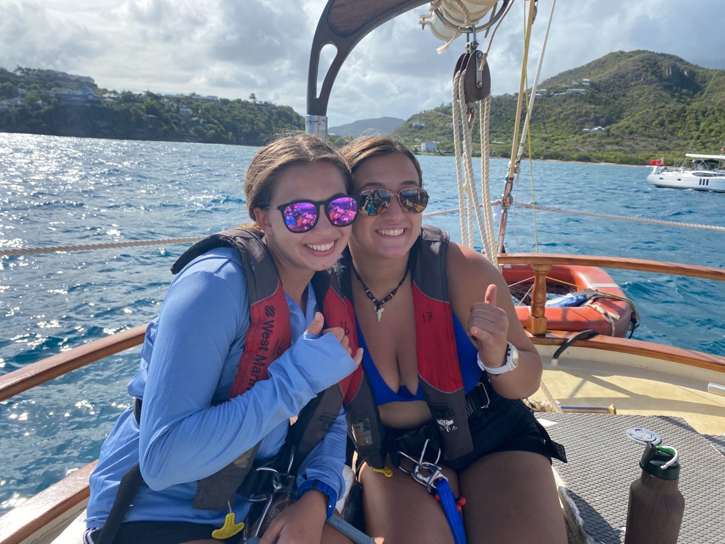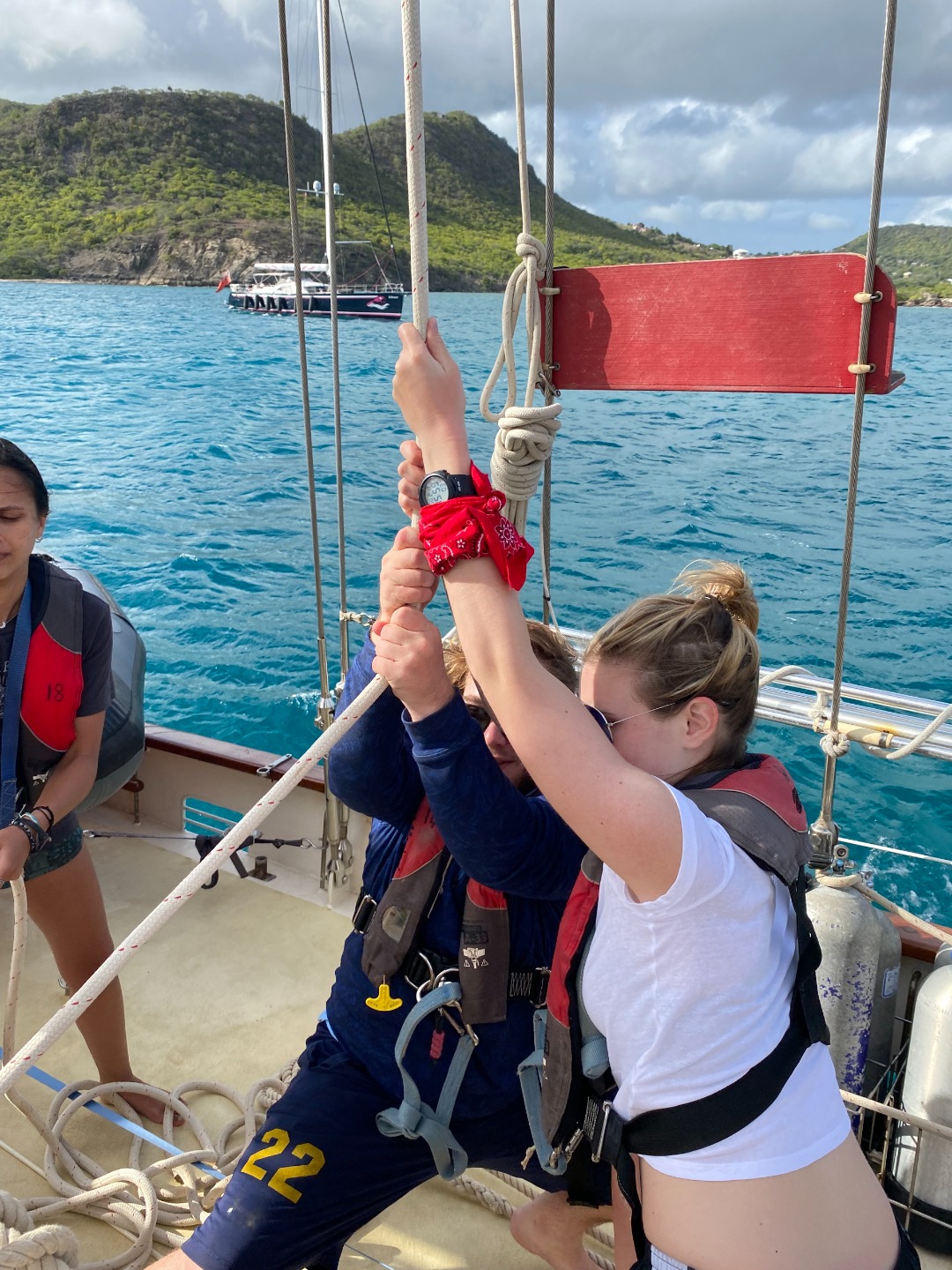 HAPPY PASSAGE DAY!! We woke up in the rolling seas of Falmouth in Antigua. After a long night of our first anchor watch, we were all super tired when 7 am came around. Right, when we got out of bed, Sierra, Ela, and I put our bathing suits on and jumped off the Martingale into the prettiest, bluest ocean we have ever seen. After a quick morning swim, we all gathered for breakfast. Mia made us baked oatmeal today, and it was SO good. Afterward, we cleaned up and gathered for seamanship class in the cockpit. Hedrek talked us through some sailing terms, and I even saw a turtle pop his head out of the water right next to us in the middle of class. After class, we worked a little bit on our essays that were due soon and started to prep for passage. Passage prep reminds me a lot of preparing for a hurricane.