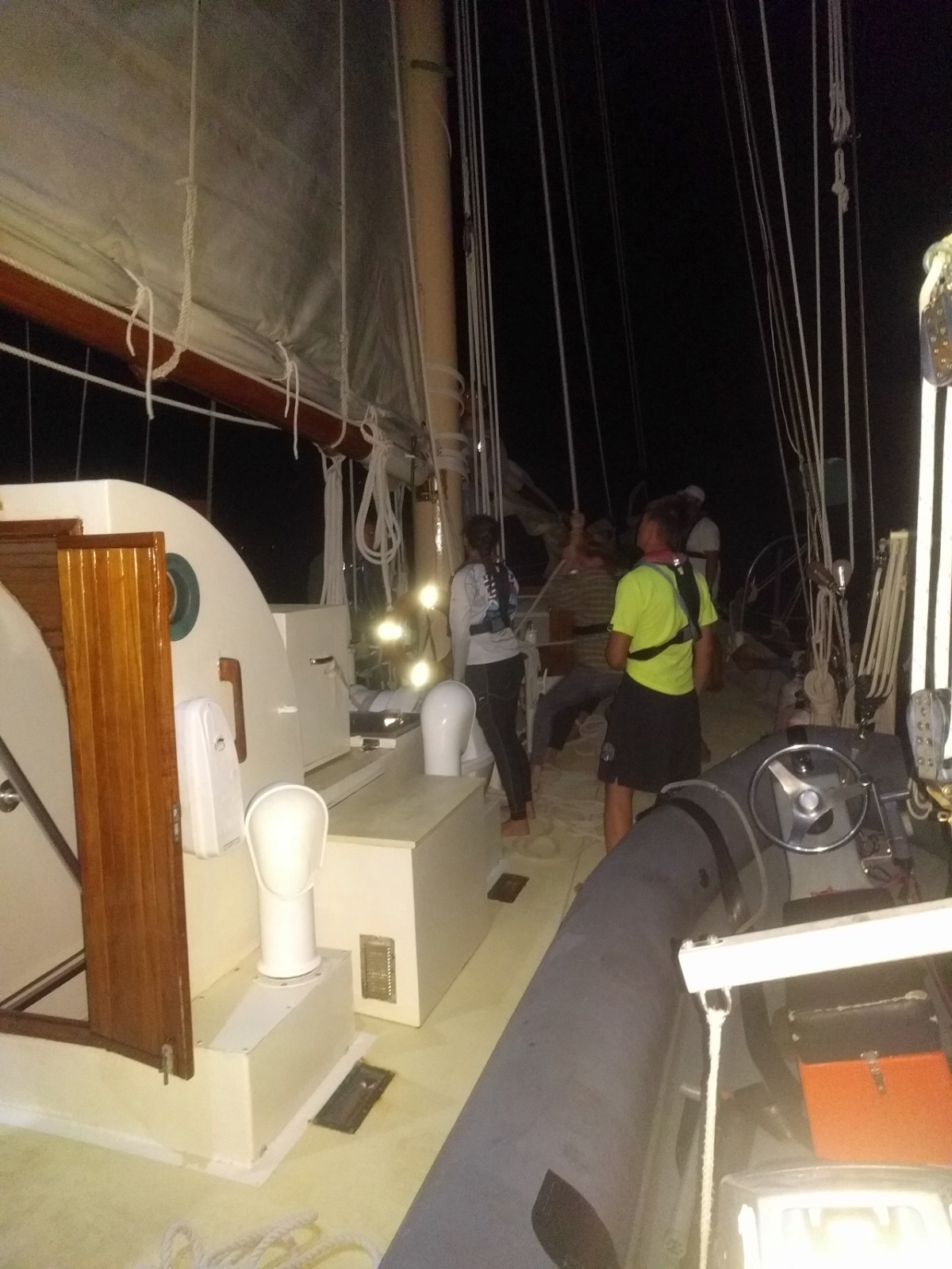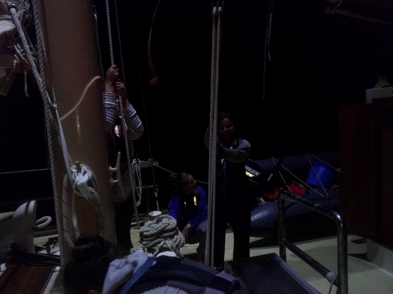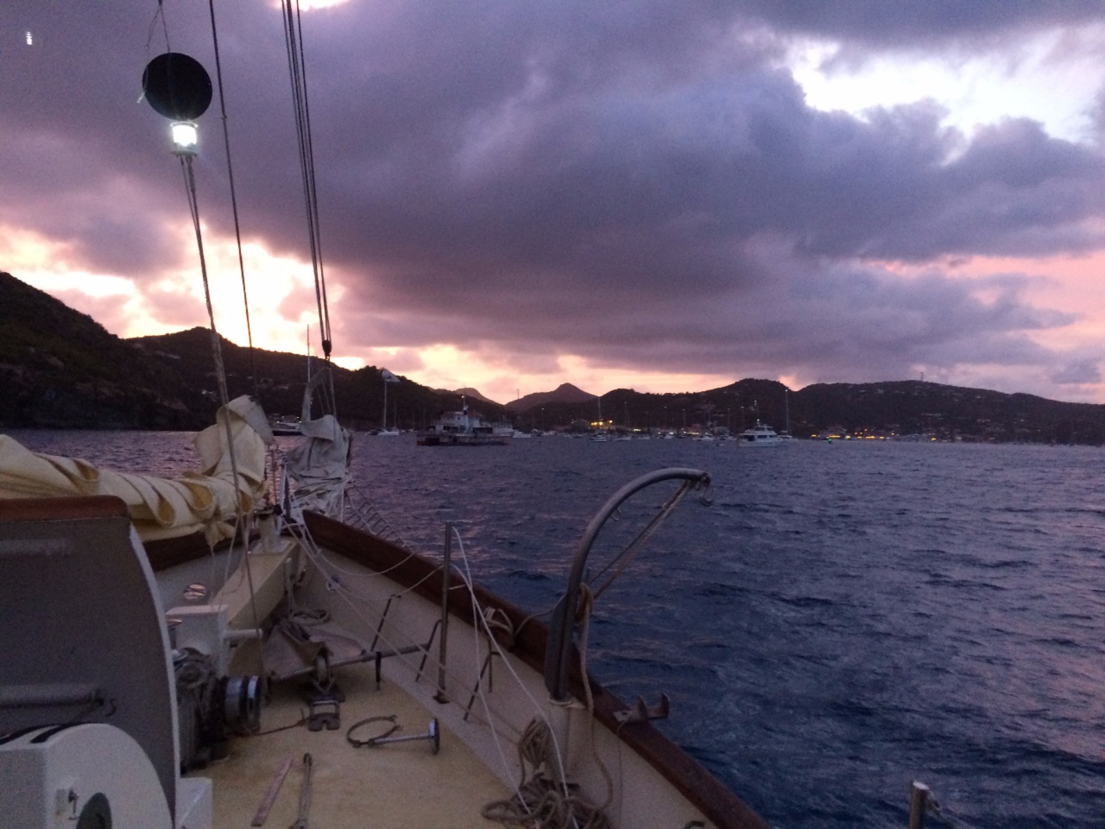 …with Watch Team One at the helm until 2300. Watch Team Two would then take over the helm until 0200. Set to arrive around 0500, Watch Team Three would man the final 3-hour leg of our passage. The sail to St. Barths was downwind, which meant we had to jibe Ocean Star once or twice each watch in order to stay on course (for those of you unfamiliar with sailing lingo, a jibe is when the stern of a boat is turned through the wind such that the sail switches sides and fills rapidly with the wind). Sailing at night is rather peaceful, and it was nice catching up with our watch teams for a few hours.