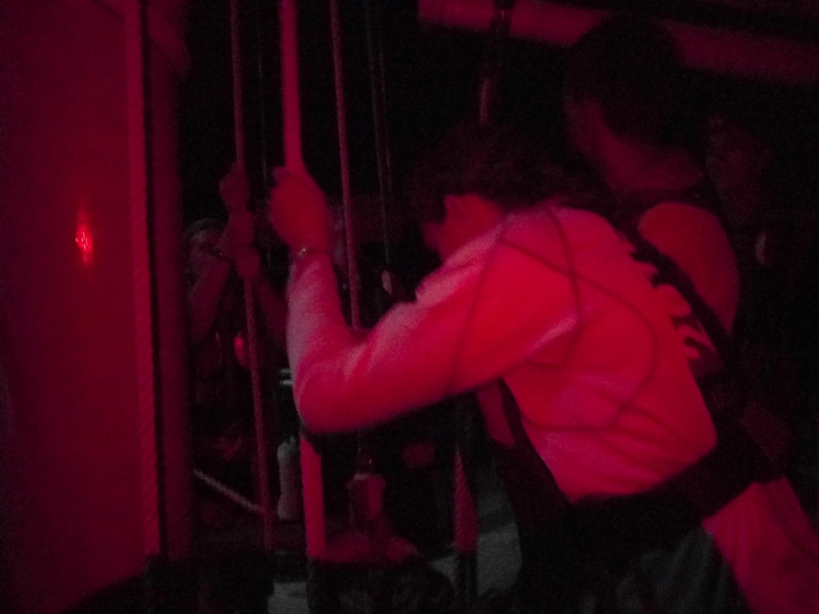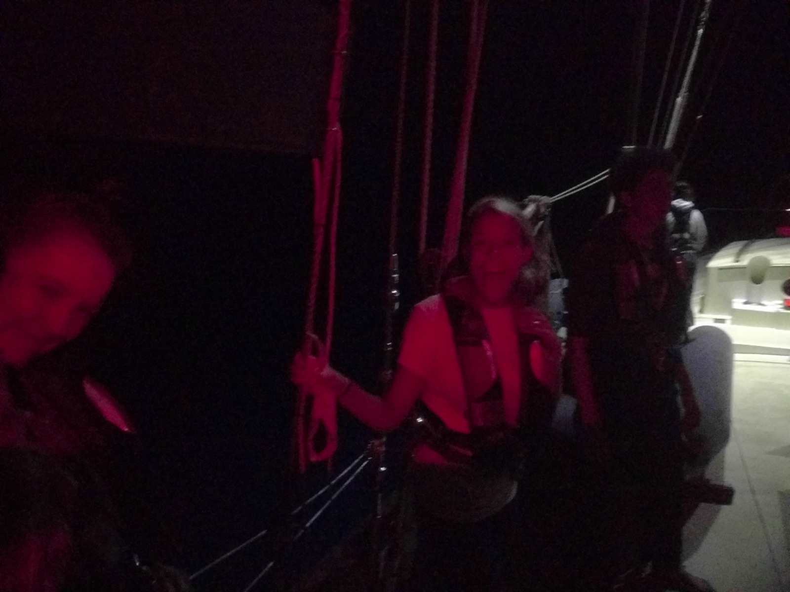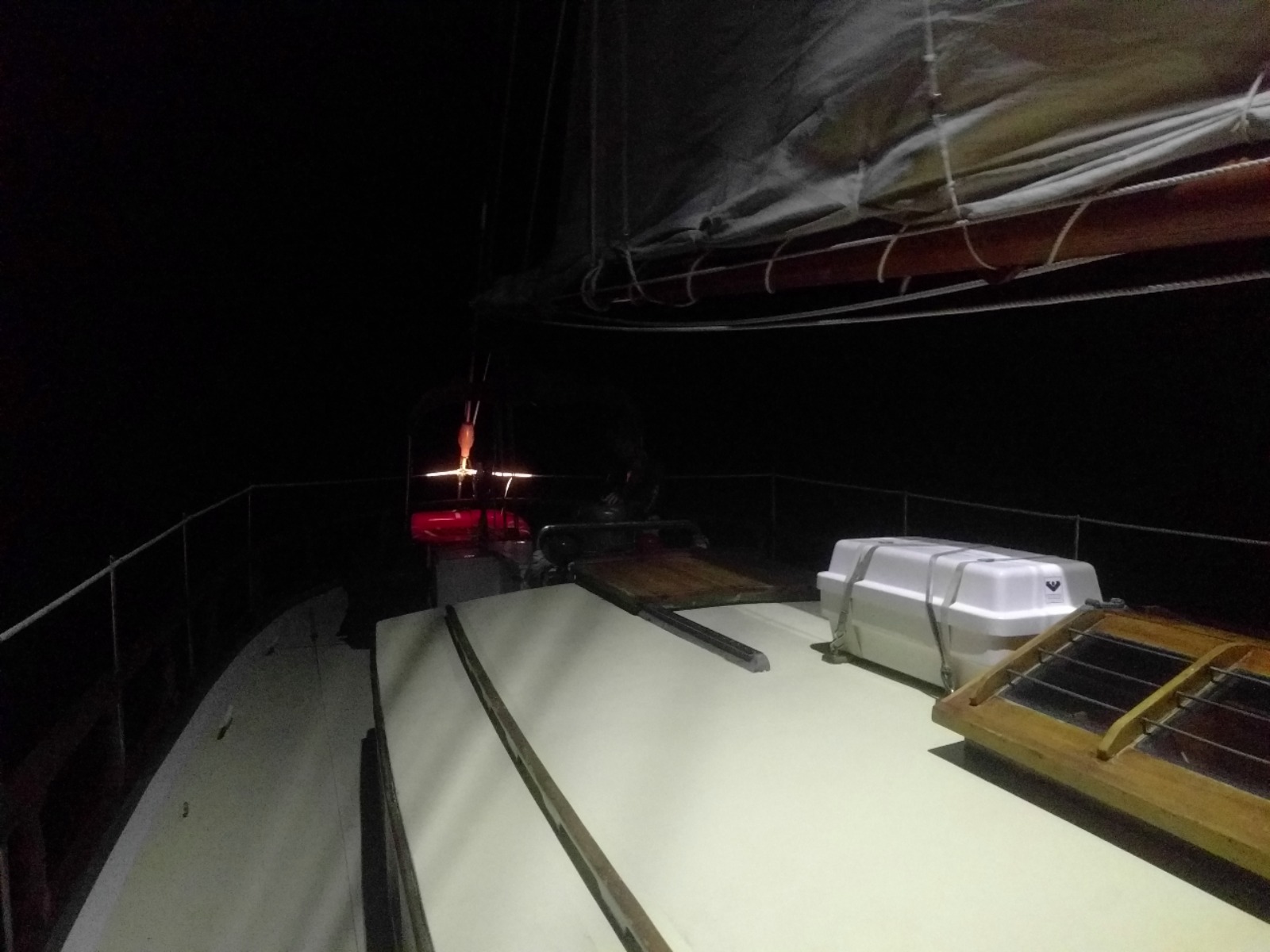 …with Watch Team One at the helm until 2300. Watch Team Two would then take over the helm until 0200. Set to arrive around 0500, Watch Team Three would man the final 3-hour leg of our passage. The sail to St. Barths was downwind, which meant we had to jibe Ocean Star once or twice each watch in order to stay on course (for those of you unfamiliar with sailing lingo, a jibe is when the stern of a boat is turned through the wind such that the sail switches sides and fills rapidly with the wind). Sailing at night is rather peaceful, and it was nice catching up with our watch teams for a few hours.
