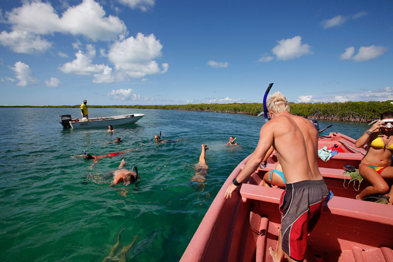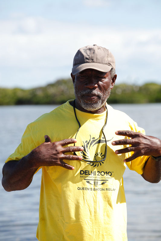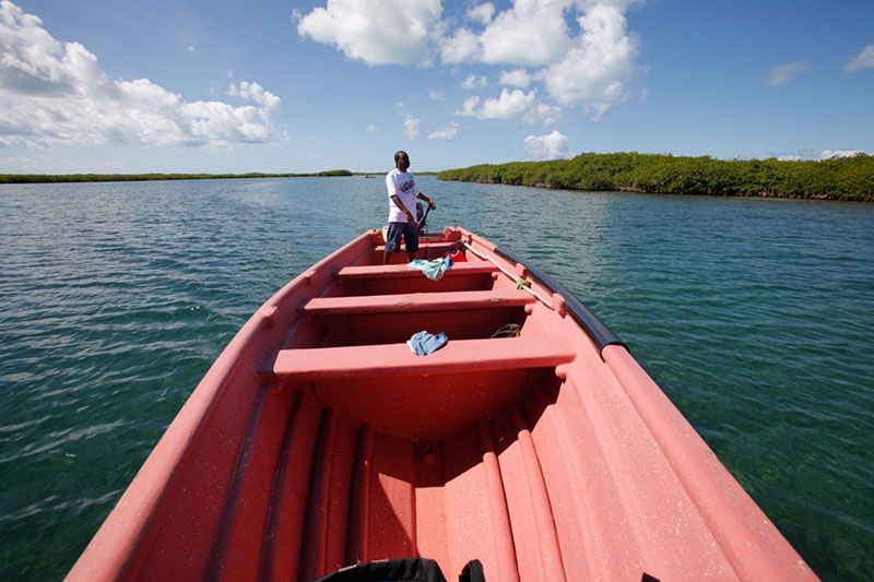 Today was an excellent day for Marine Biology. We began the exploration of Barbuda by crossing a small strip of sand and separating the shallow area where we were anchored from the Codrington Lagoon, a miles-long, shallow salt pond on the west side of Barbuda. We were met by our local contact, George (pictured below), who took us zooming off on the lagoon to see one of the island’s main attractions, a protected frigate bird nesting colony. As George explained in his deep booming voice and thick down-island accent how the colony had been established after an older nesting site had been wrecked by a hurricane in 1960, we watched thousands of frigate birds wheeling around in the sky above us. The males would settle down and puff up their large red chest pouch and drum on in with their beaks in an attempt to attract the attention of the females. We were even able to see the downy frigate hatchlings pokin’ their heads above the mangrove branches. From there, George took us to mangroves for snorkeling, where we were able to see juvenile fishes, lobsters, and even a hawksbill turtle, all taking shelter in the calmer waters of Codrington Lagoon. We headed back to the boat for lunch and spent the rest of the day windsurfing, playing beach games on the pink beach sands, and getting ready for our night passage to St. Barths.