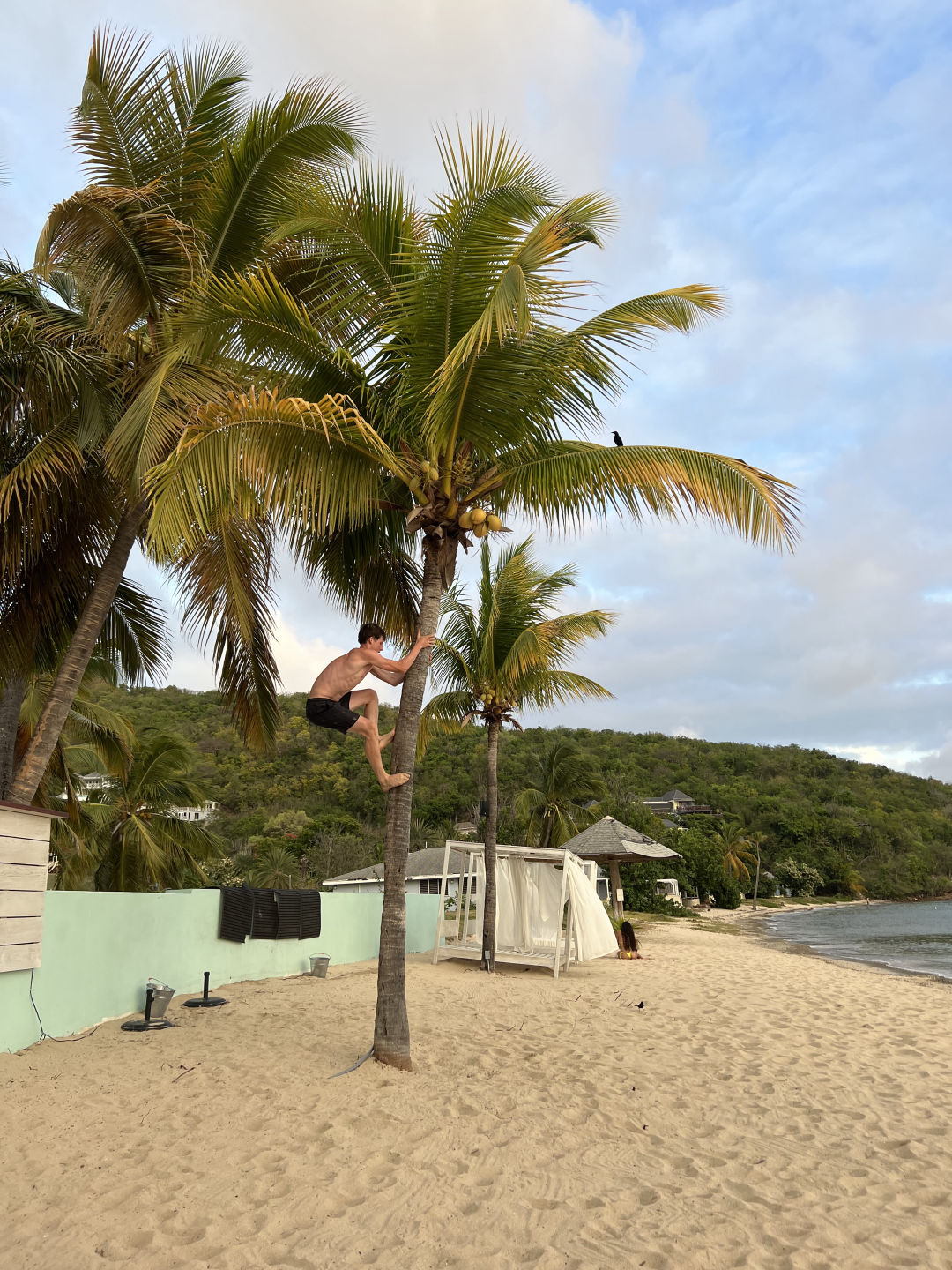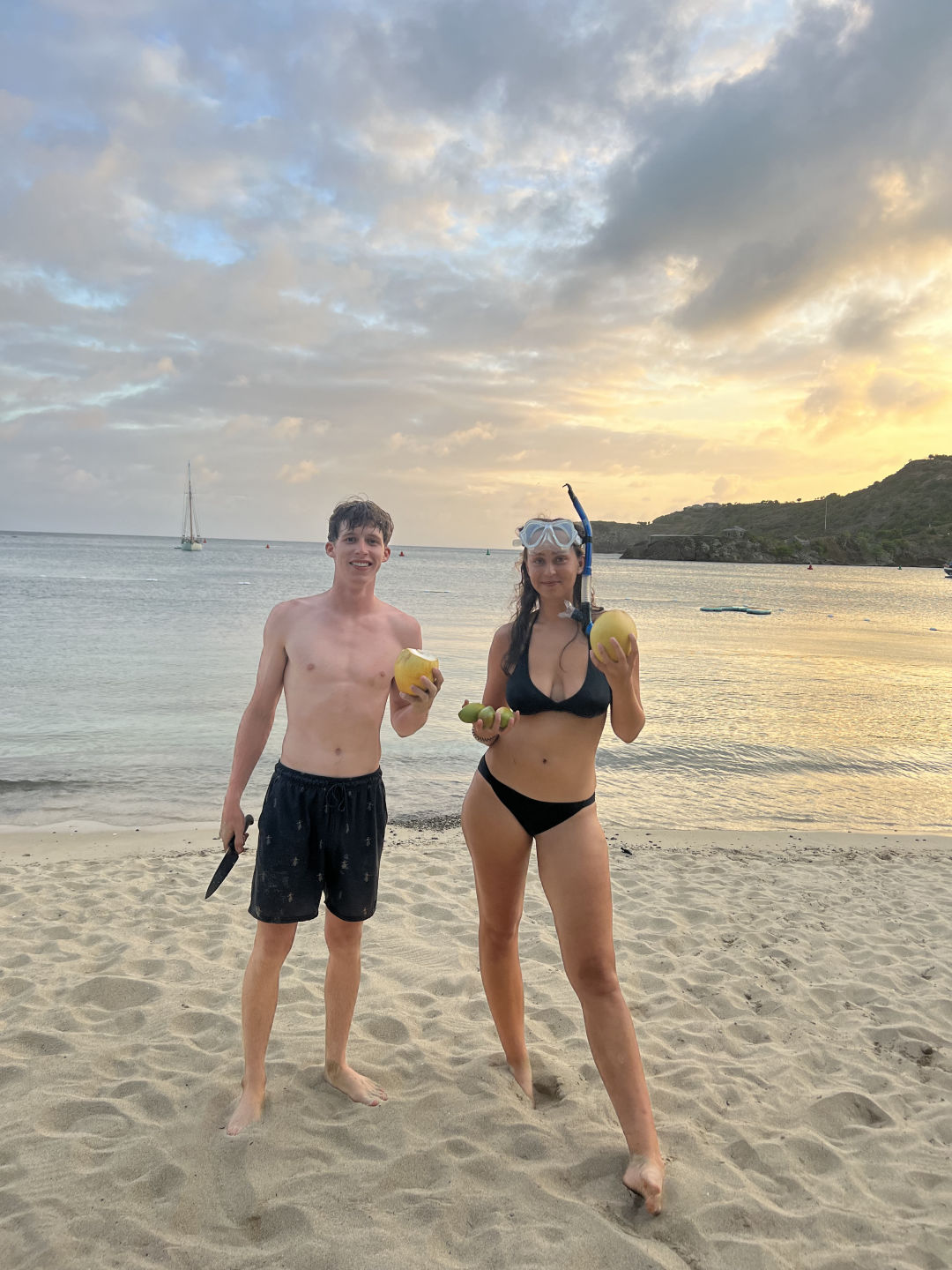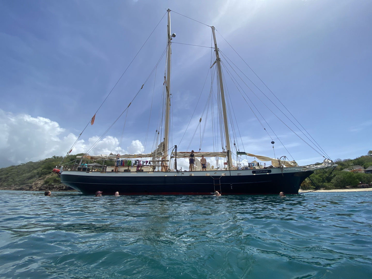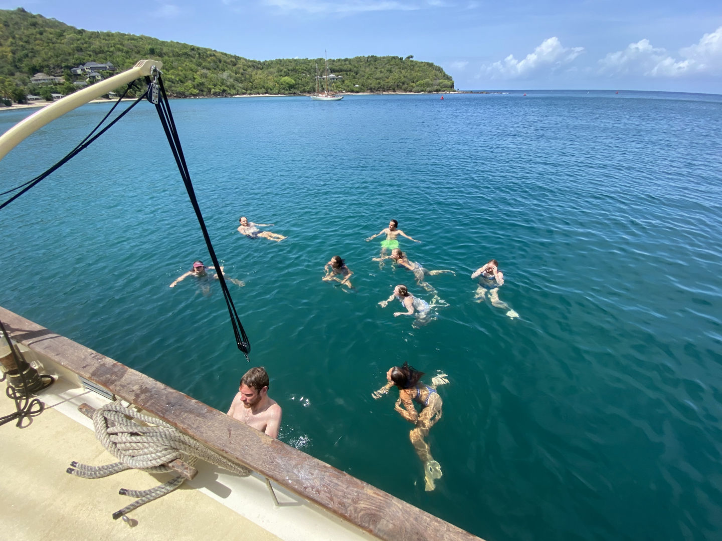 We rolled into “The Promise Land” (Antigua) at 3 am today. Upon arrival, we had about an 18-hour sail, so the crew was glad to finally be anchored. Waking up today in Freemans Bay was magical. This bay is one of the most beautiful places I have ever been. We all went for a morning shower and swim. After our swim, we had bagel sandwiches and rolled into boat class. The boat class was light. The exam was cake. Then we transitioned into EFR training which involved some scenarios the crew had to respond to. After that, we set up a rope swing off the boom and had a great time watching the crew case it. It was gnarly. Later on in the day, a group went to snorkel a wreck and saw some big turtles. After Ava and I harvested some mangos and met up with the rest of the crew to have a feast. I started climbing coconut trees and retrieving coconuts. Then we broke into em and enjoyed coconuts on the beach. Even the waiter had one. After our mango coconut feast, we swam back to the boat and showered up before dinner. For dinner, we have some mac and cheese in the pot that I cannot wait to absolutely demolishgoing to be a good one.