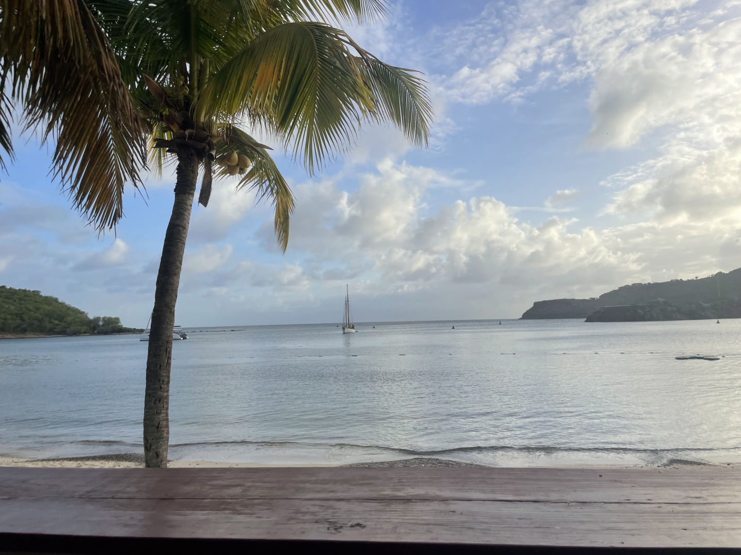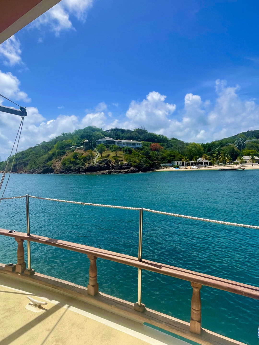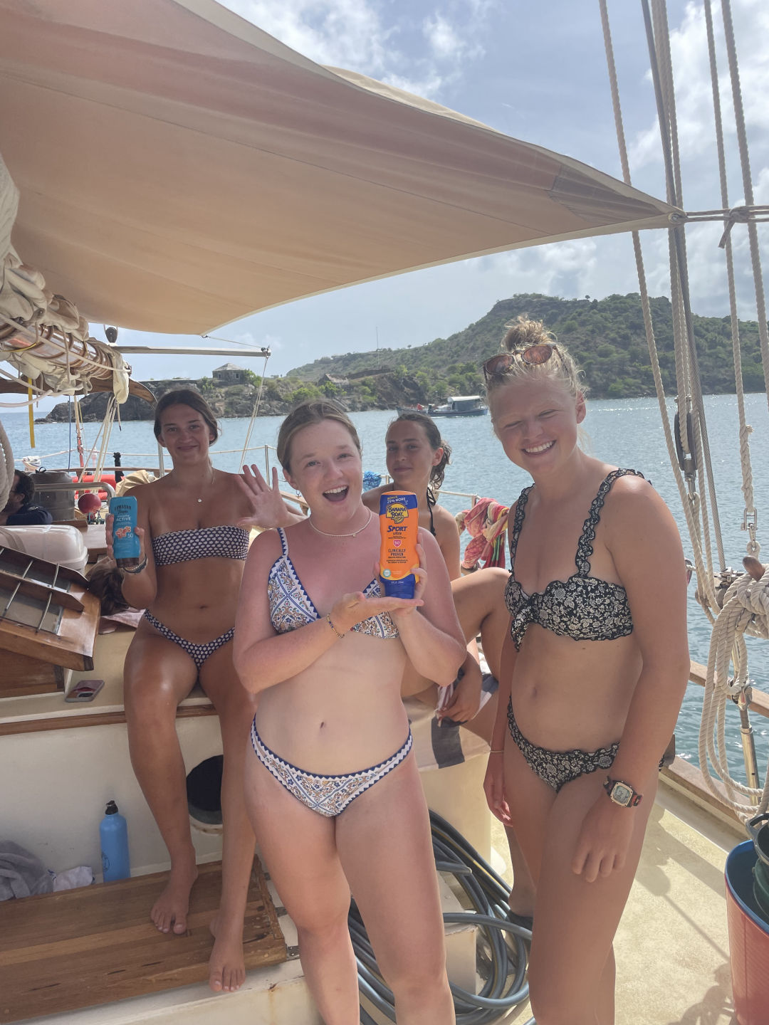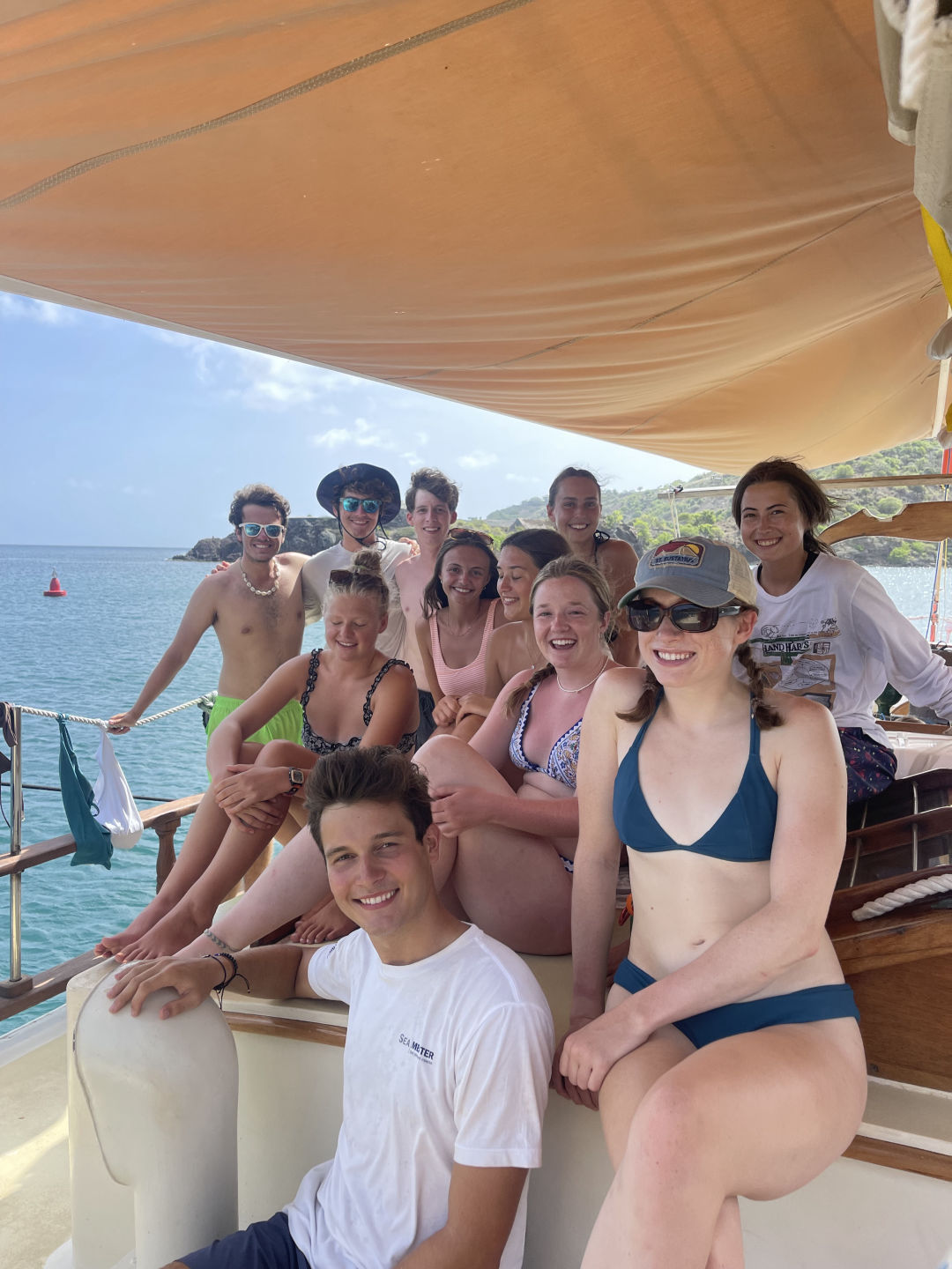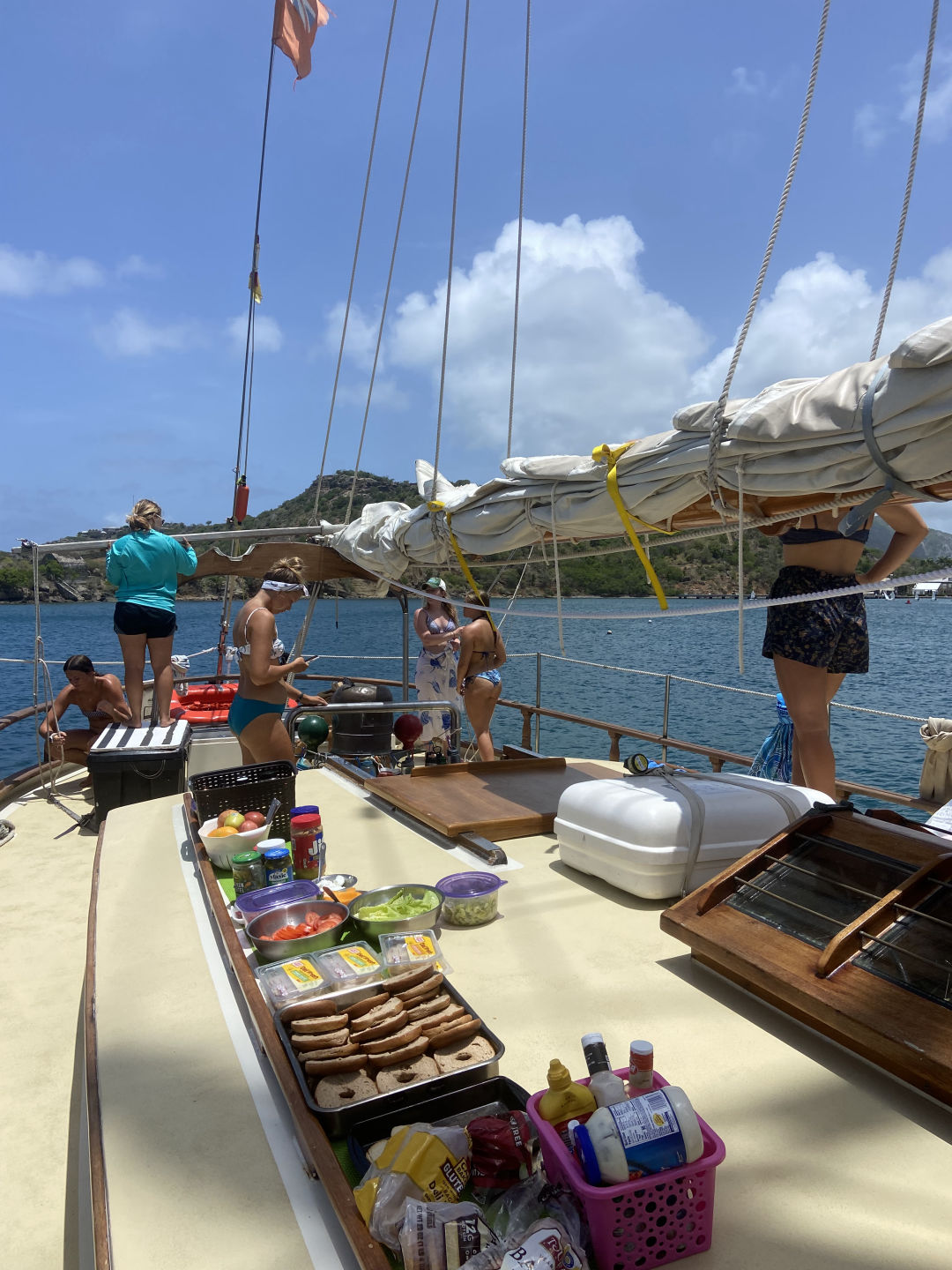 We rolled into “The Promise Land” (Antigua) at 3 am today. Upon arrival, we had about an 18-hour sail, so the crew was glad to finally be anchored. Waking up today in Freemans Bay was magical. This bay is one of the most beautiful places I have ever been. We all went for a morning shower and swim. After our swim, we had bagel sandwiches and rolled into boat class. The boat class was light. The exam was cake. Then we transitioned into EFR training which involved some scenarios the crew had to respond to. After that, we set up a rope swing off the boom and had a great time watching the crew case it. It was gnarly. Later on in the day, a group went to snorkel a wreck and saw some big turtles. After Ava and I harvested some mangos and met up with the rest of the crew to have a feast. I started climbing coconut trees and retrieving coconuts. Then we broke into em and enjoyed coconuts on the beach. Even the waiter had one. After our mango coconut feast, we swam back to the boat and showered up before dinner. For dinner, we have some mac and cheese in the pot that I cannot wait to absolutely demolishgoing to be a good one.