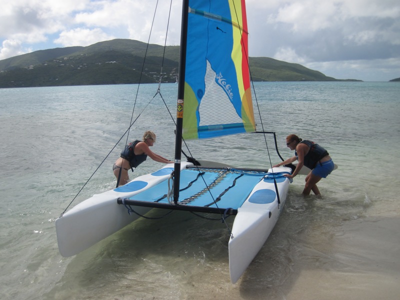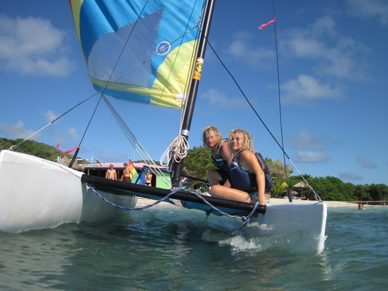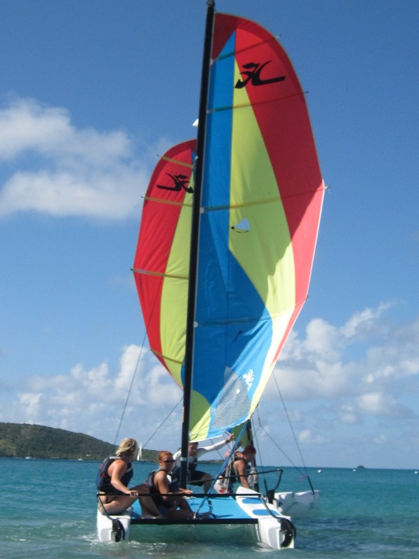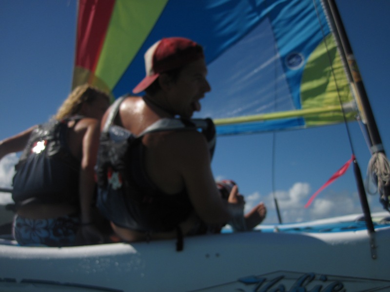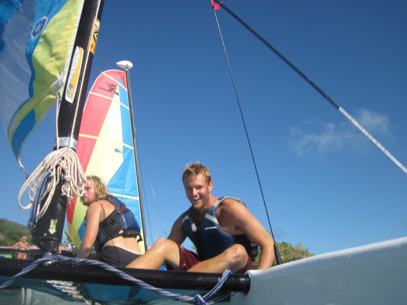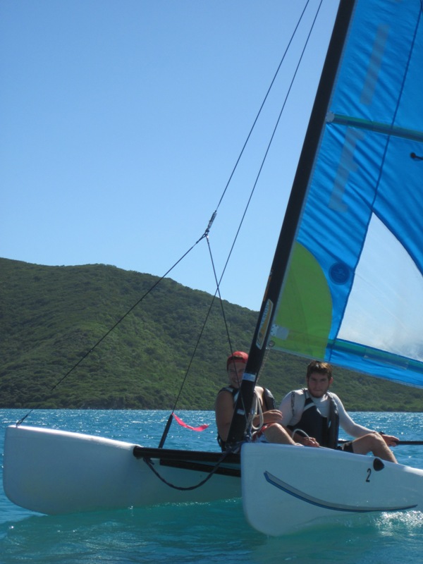 “What a day! What a day!” I stood in the shadow of the companionway, licking my finger and letting the breeze roll over its moist surface. It was to be an exceptional day of small boat sailing, I thought. I meandered over to the hose and proceeded to brush my teeth in my normal orderly manner- the way a gentleman mounts a horse or tends to his flower patch-with a strategy. The day progressed, and after a brief bit of lounging and studying, lunch rolled around. The crew and I ate while enjoying cool drinks and polite conversation. Then, it was time. The curtains were drawn, and with the parting of their smooth, ethereal silk came the glimmer or the blunt glow of two Hobie Cats. Their masts shot straight into the sky donned with pink sails. OH, HOW THE WIND BLEW! BOATS CARVED THROUGH COOL BLUE WATERS, AND THE WIND RAGED!
