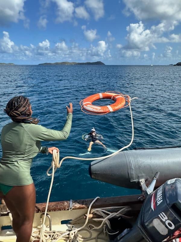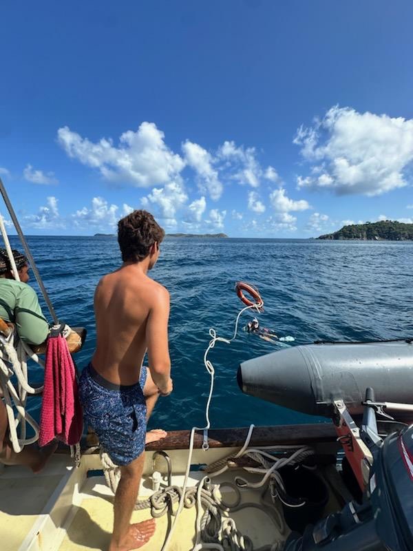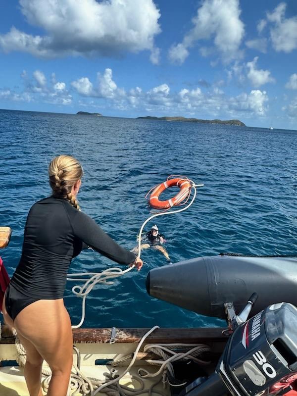 Today we woke up to the smell of Mollys coffee cake, and in my opinion, it was one of the best breakfasts yet. We then put together our dive gear and began our rescue diver skills while the first group of students took their Navigation Master exam. We learned how to save Zoe by throwing a floatation ring, and then we practiced saving panicked and tired divers. Once we dried off and were about to relax, we had a surprise drill run by Aidan and Zoe as they jumped in the water, panicking and screaming from each side of the boat. Aidans team was successful with their efforts, while Zoes team left her drifting away in the water with a flotation device that, unfortunately, wasnt attached to the boat. After Zoe and Aidan were safely on board, I lay down and quickly fell asleep until lunch. Naps are scarce on this boat, so we are always lucky when we get the chance. Then it was time for my nav master exam. Although I had some difficulties with reading the directions, I believed I managed to pass. We also went through 4 lectures of oceanography today, before and after dinner, but during dinner, we were joined by our 19th crew member on our ship, the ravenous seagull. We sat down with our bowls of pasta as the bird flew in from the distance. He landed on the main boom and squeaked at us for some leftovers. As he swooped down for the food, Gabe stood guard as the protector of our second helping of pasta. With the bird agitated and hungry, it retreated to the boom and had a standoff with Gabe. Successfully, it flew off into the sunset, leaving Gabe and his mighty crew victorious. We all went to bed with full stomachs thanks to Gabe.