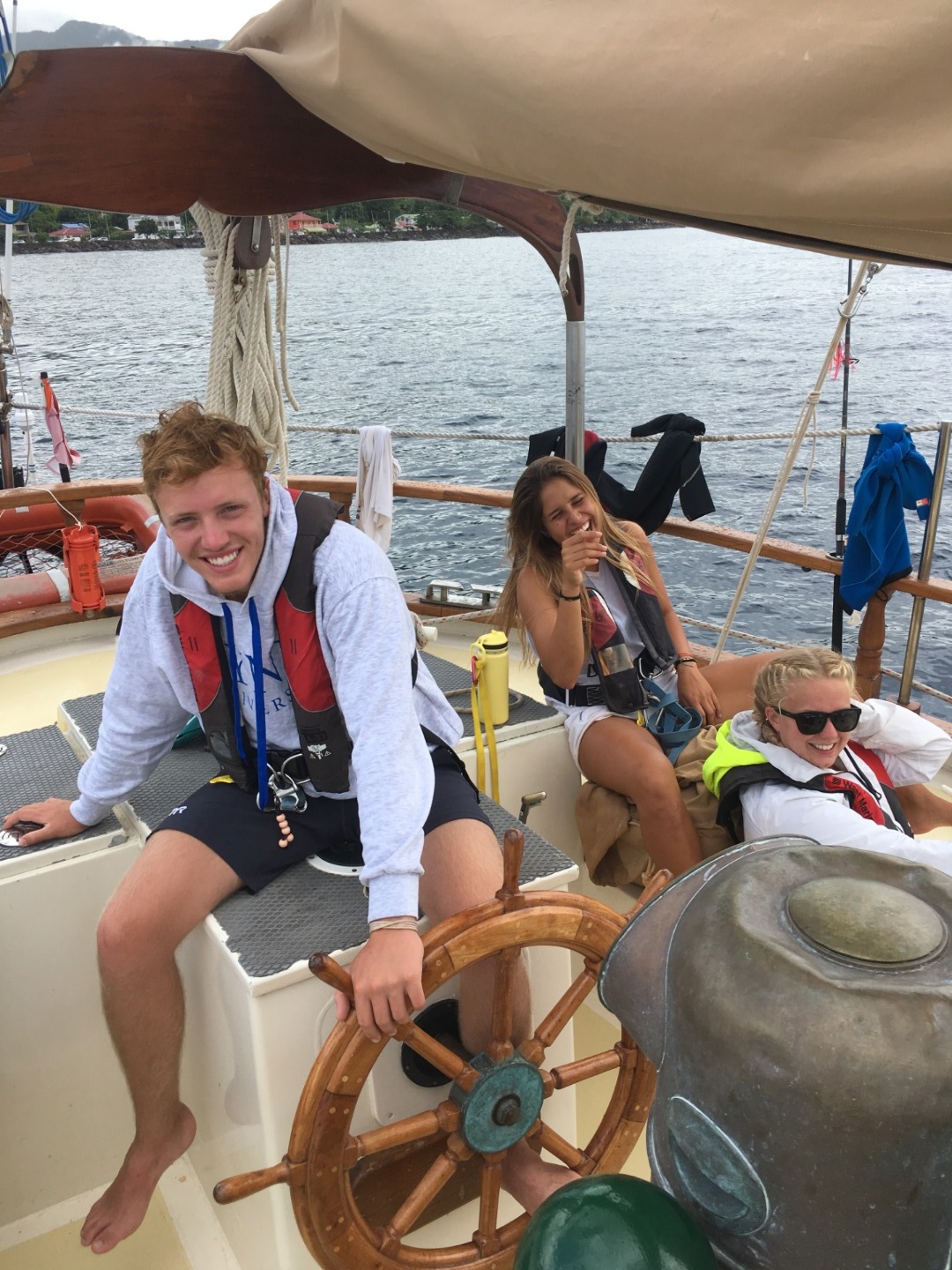 Pictured; Eli, Miranda, and Jill at the helm; Miranda and Kennedy taking in yet another amazing sunset; The whole crew during shower time turned water activity session; Ridge, Brit, Josh, and Nate return to the mooring after their dive, then pictured enjoying the underwater world; our fabulous dive instructor and marine scientist Amanda pictured with the statue of Jacques Cousteau; Josh leading Brit, Ridge, and Nate as part of his Dive Master training, The pristine reef and abundant life surrounding Pigeon Island; Rescue divers learning how to administer oxygen.
