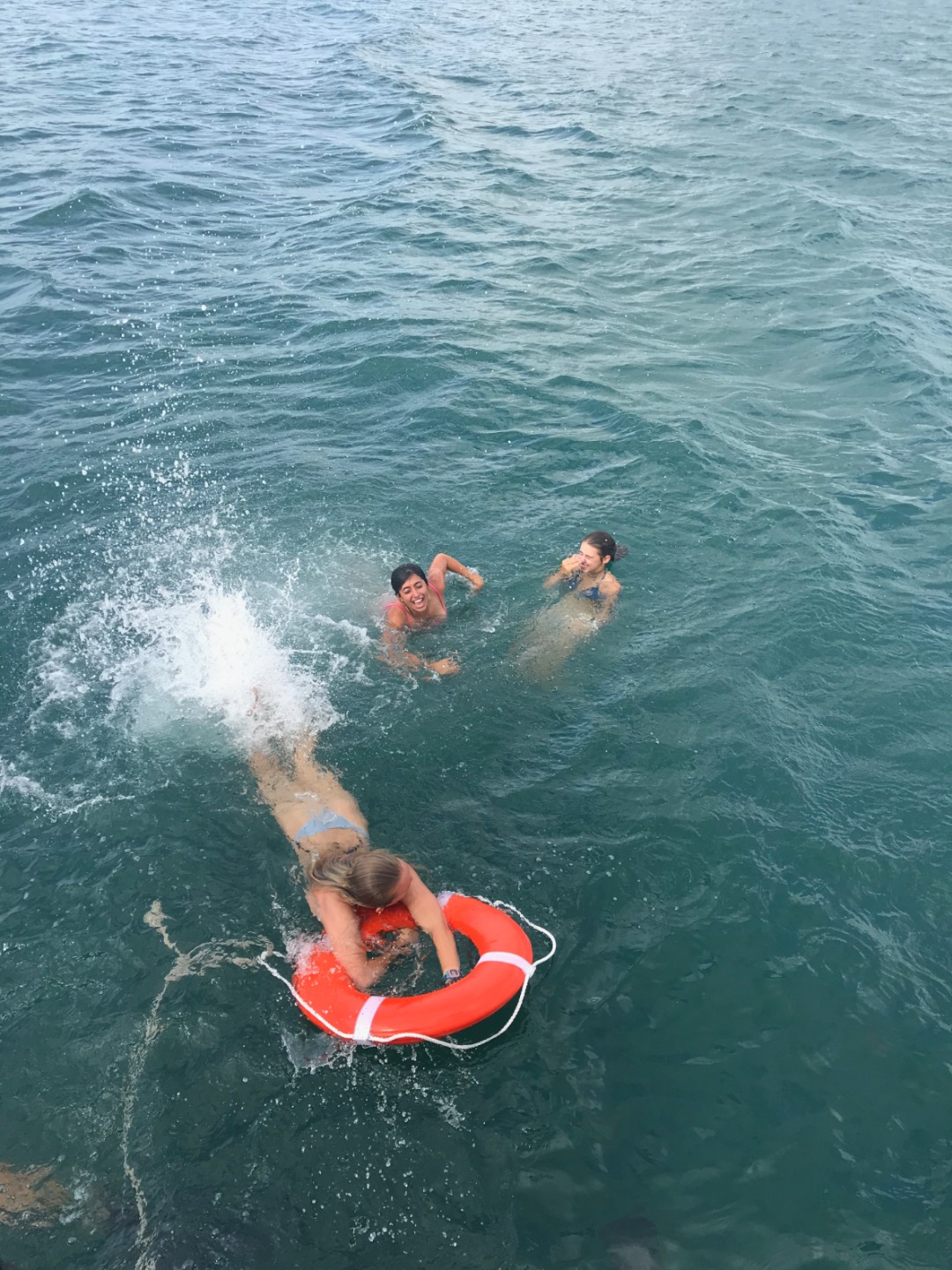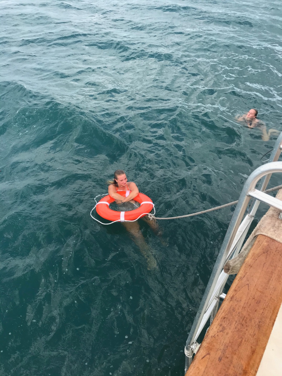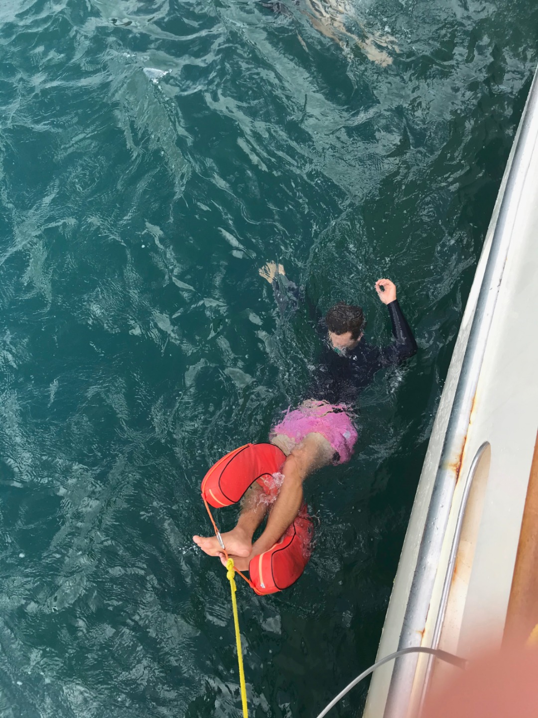 The afternoon consisted of the rescue students practicing throwing life-saving devices in and how to approach a panicked diver in the water. We had people constantly jumping in, throwing life rings, using the boat hooks to pull people back in, and calling out words of comfort to those panicking – it was action-packed!. At the other end of the boat, Bella volunteered to be Niko’s ‘victim’ as we practiced another rescue skill – giving rescue breaths to a diver while towing them back to the boat – again and again perfecting techniques. We then practiced demonstrating some of the surface skills for his skill demonstration assessment until it was nearly time for dinner.