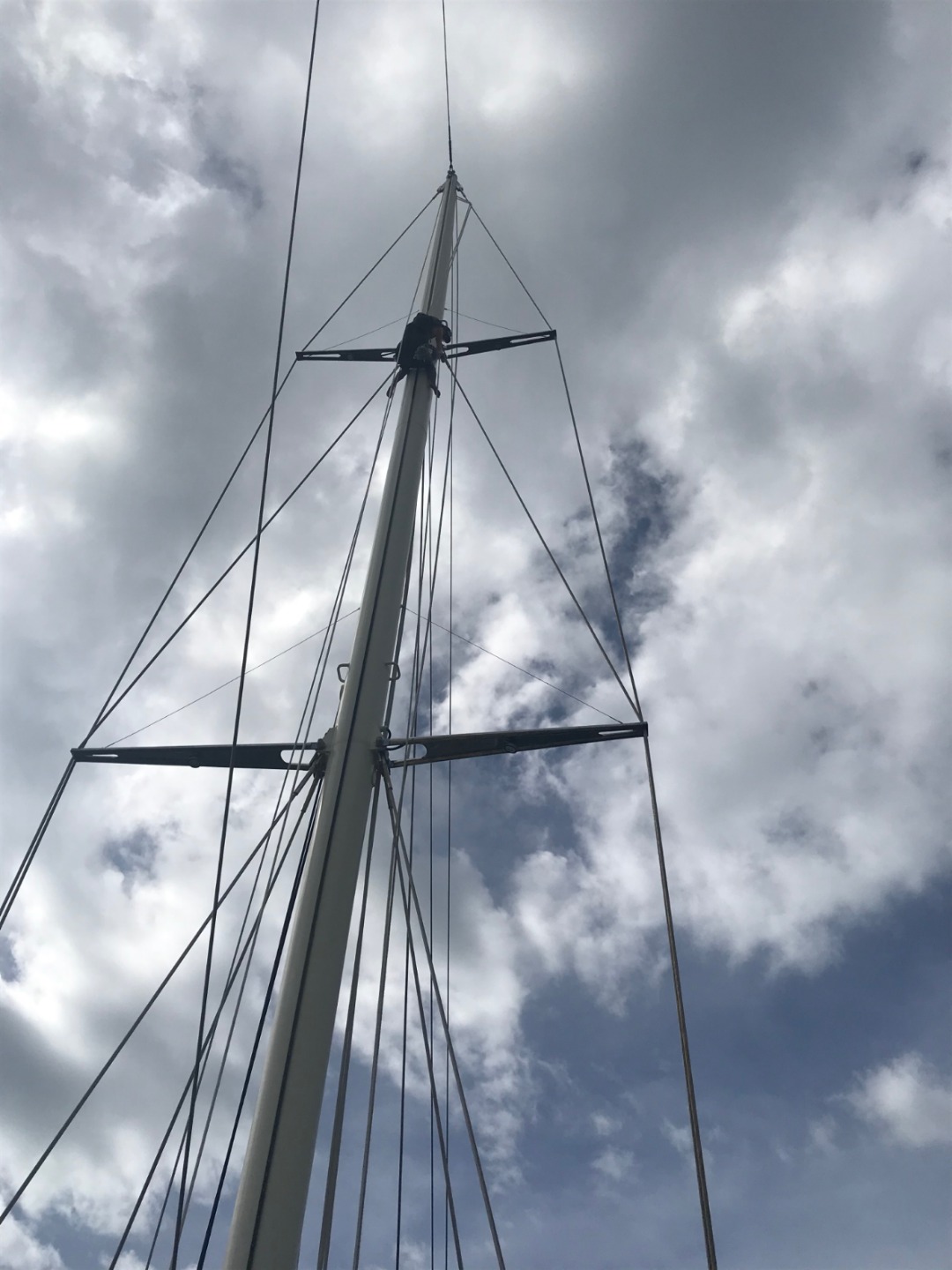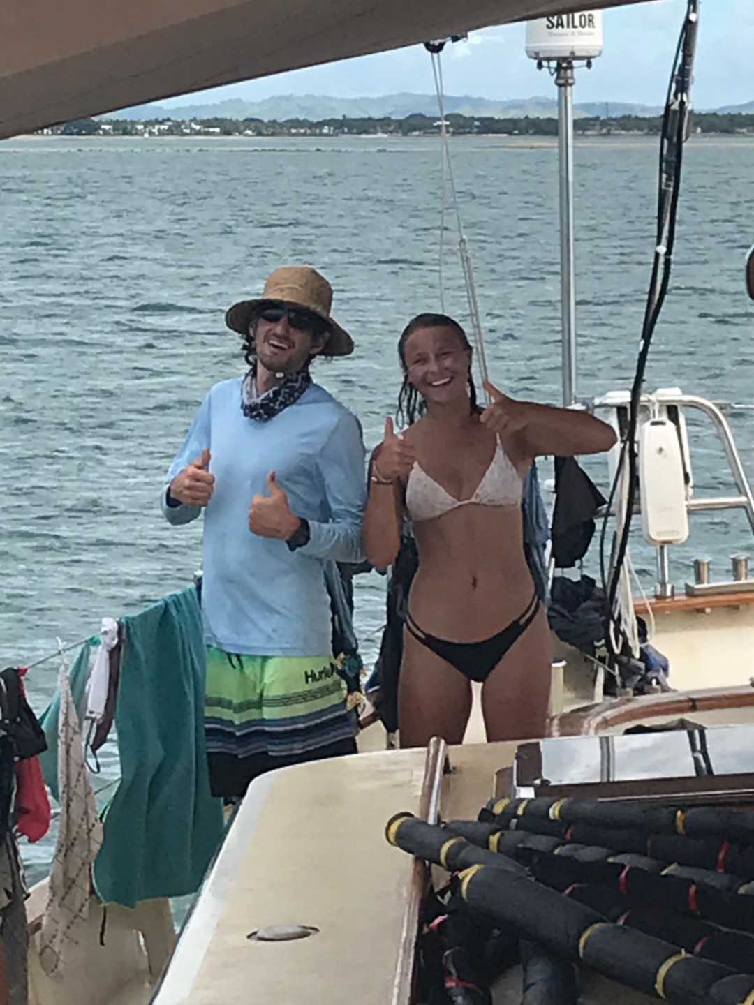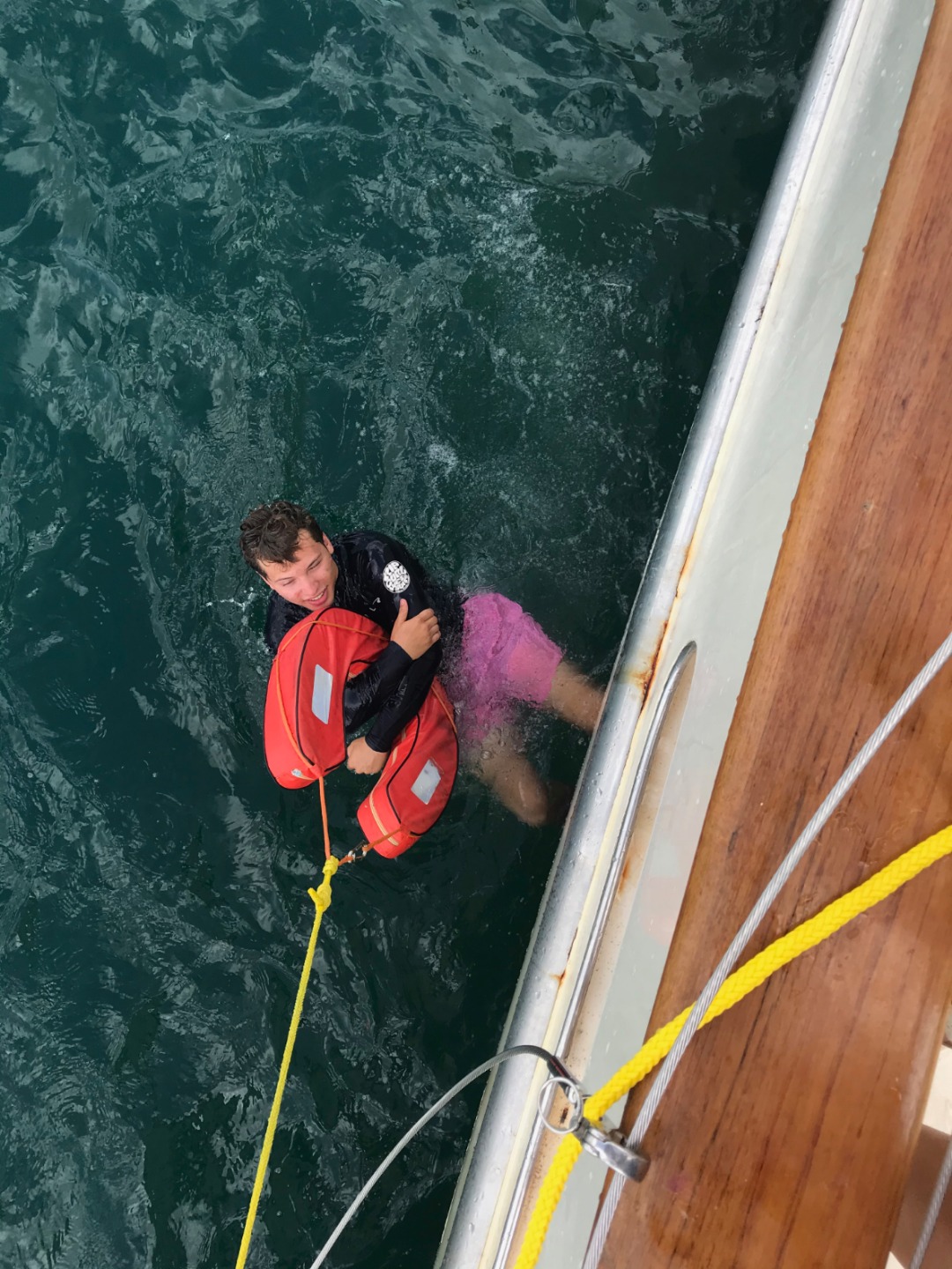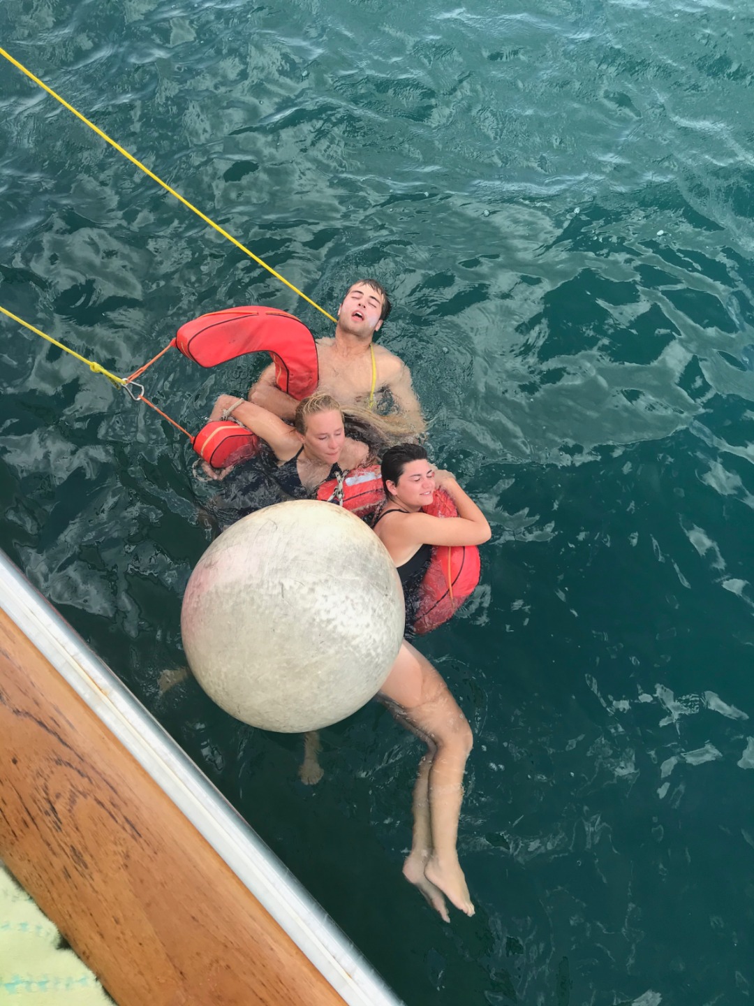 Pictured: Last night’s awesome sunset; Lolo up the mast; a beautiful setting for a day of rescue fun; Gabe and Thea excited about rescue; Izzy preparing to do a throwing assist; Felipe demonstrating the wrong and right way to be towed by a life ring; rescue chaos; Riley, Marina, Frankie, Sam, and Amanda after our first day of rescue training.