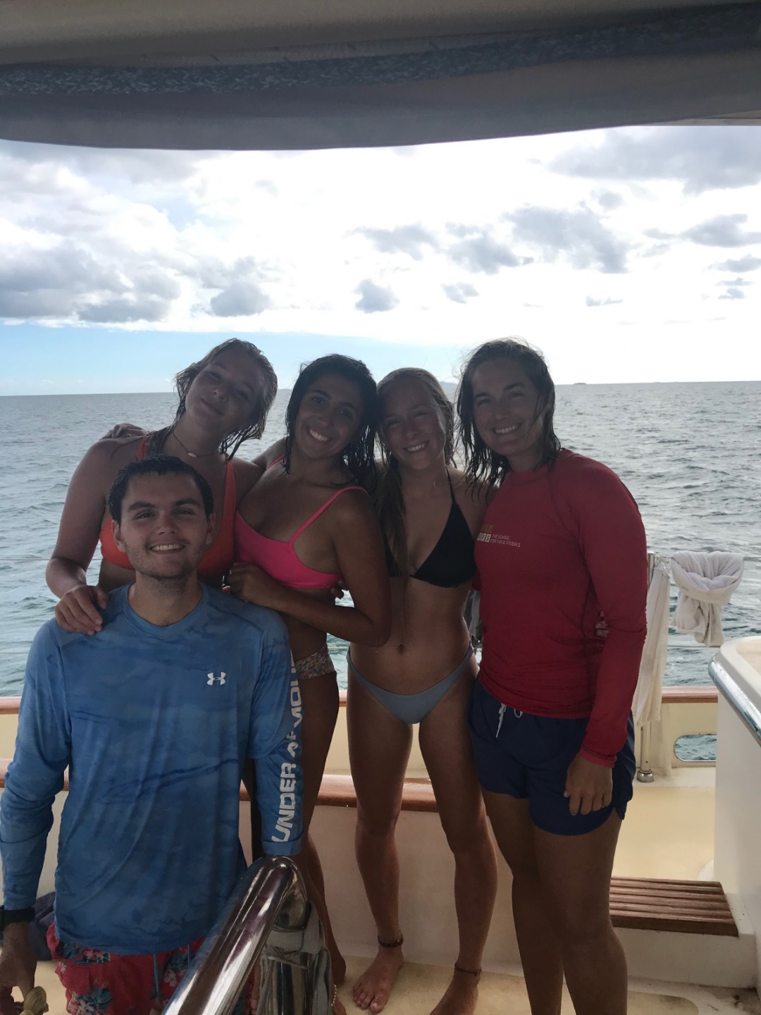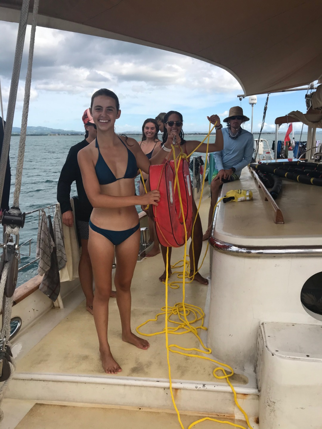 After lunch, some of the staff decided to show the students what the rescue program is really going to be like – we pre-warned them they must be ready for anything at any time – so Tim and Lolo jumped in and started simulating a panicking diver right in the middle of clean up. A bunch of people jumped into action and jumped in the water to save them. We had others throwing life-saving devices in and others standing by on deck to help out once the panicking divers were out of the water. Lolo (simulated) becoming non-responsive, and Giselle expertly swam her back to the boat, where Mac assisted in lifting her up the ladder. Amanda (simulated) fainting and becoming unresponsive from seeing her friend lying on the deck, so Marina and Elie took action and began helping Amanda. I became panicked and ‘fell’ into the water and was rescued by Izzy, Marina, and Trevor. It was a very interesting and eventful clean-up!