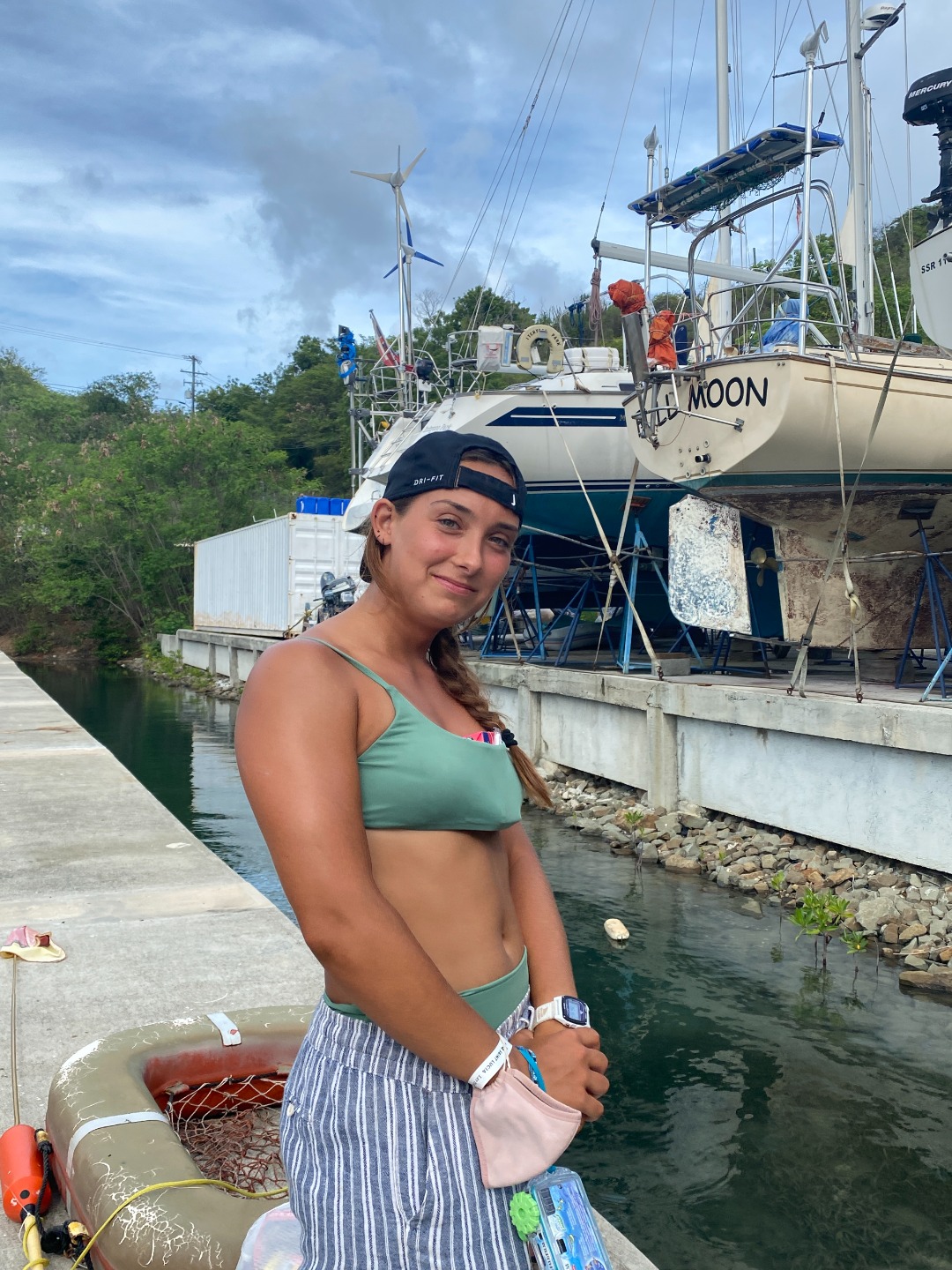The crew then unexpectedly prepared to motor over to Slipway to dock Ocean Star in light of the upcoming tropical depression. Docking Ocean Star called for precision, cooperation, and communication between everyone. While some prepared to throw out the docking lines, others hurriedly scampered about with fenders to protect the vessel during her tactical maneuvers. With our dinghy Irv in the water giving blows at midship and the bow, Ocean Star was safely returned to her marina.