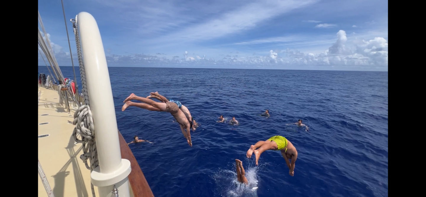 After going to sleep for a little bit, we woke up to one of the hottest days we’ve had yet on passage. Maya, Charles, and Emma made a wonderful lunch which was a make-your-own burrito. Following lunch, we did our first safety drill since starting our passage. The man-overboard drill allowed us to see how our watch teams split up to make the rescue as efficient as possible. To start the drill, Santana maliciously threw our friend Cedric overboard, who was a little difficult to keep eyes on, even in the calm waters. Maya and Leo kept their eyes and pointer fingers on Cedric while the rest of the watch teams fell into position (or, as Gabe likes to say, our battle stations). Sammy was leading the easing and taking in of the line that was connected to Tim, our rescue diver. Cedric was safely recovered, and our first MOB drill was a success.