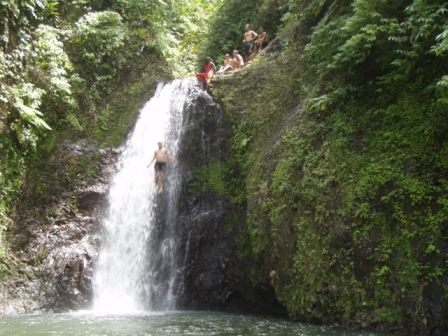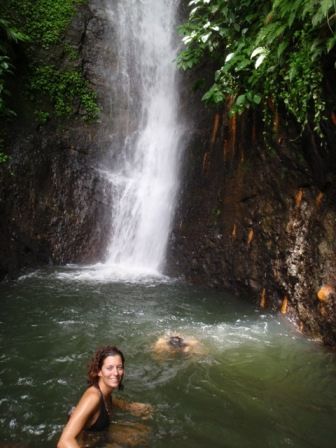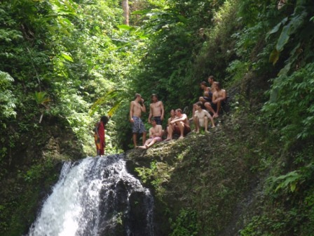 After a nice 07:30 breakfast, we worked quickly to clean up and get ashore for our island tour with Zebra. Our first stop was an old French/British fort that overlooks St George. Here, “Alice in Wonderland” graced us with a tour explaining how this fort had switched between French and British control several times, had tunnels that used to lead to all the other forts on the island, and had a well that still supplies much of the area with water. We then continued up the mountain to an elevation of 1910 ft through rainforest switchbacks. Next, the crew met up with a local guide named David, who took us to the Seven Sisters Waterfalls. Those of us who were up for it climbed a steep, muddy trail where David helped us safely jump from the seven different falls. The 2nd to last of which was about 40ft high. After this, we made it out of the rainforest. We enjoyed a PB and J lunch followed by an exhilarating romp down the mountain with Zebra. Once back aboard, we enjoyed some showers and study time. Tina made quesadillas for dinner and for dessert, which was a good help to the marine biology class.