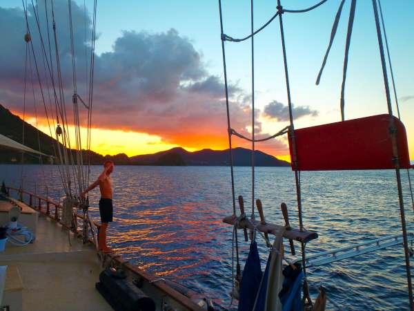 Today started out with another wonderful breakfast by our French chef, Edouard; waking up to the fresh smell of crepes and fruit reminded us of our next voyage to Les Saintes, a tiny French island where most of the local people are kicking back on the weekend from Guadeloupe. We made a quick and painless effort to get the boat ready. Our sail north was thought to be stress-free, but as soon as we got closer, we were welcomed by a narrow channel we had to squeeze through. After that, we had more obstacles, and I had to have three people on bow watch helping me steer through handfuls of fishing traps scattered around between the islands. We practiced our tacking up through the narrow bay and unfortunately had to fire up the engine when I got us into irons and were close to shore. We made it to our anchorage safely and got sails down in a timely manner, pulling up to a new and beautiful island town with awesome greenery and pink and orange roofs scattered all over. We then got some Boat Appreciation going and gave O-Star a good scrub on the whole deck, organized our food supply down below, and had an interesting time cleaning the hull with all of the ferry traffic and people passing by. After our boat appreciation session, we got a pleasant compensation for learning how to drive Exy, the smaller tiller dinghy we have on board. We showered and then had some downtime before dinner. We wrapped up our day by sharing our hopes of where we’d be in our 70s and had a slice of India with one of our best curries yet, made again by Edouard and Albert. After our awesome biological Oceanography class, we all got ready for anchor watch shifts and some much-needed sleep.
