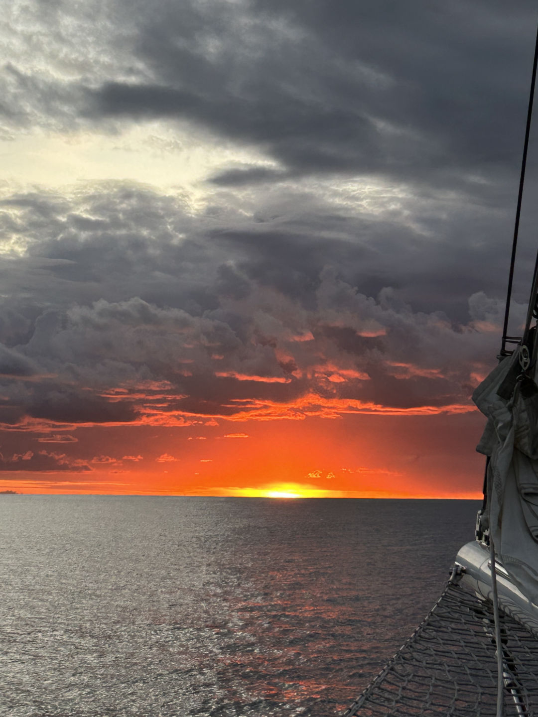 🤤 Not too long after lunch, we met up on deck for a color exercise to depict our different leadership styles. Im yellow, which is exactly what youd think I would be, so you can look it up or use your imagination; youre probably spot on. During the exercise, Tom came riding in on the dingy with two guys from Fijian customs who cleared us out of the country. Next thing you know, were underway and heading for Palau! In the midst of a deep study sesh, everyone frantically ran up on deck in response to a Man overboard call. We all quickly realized we were having our first emergency drill, but man, even the drills get your heart rate up. After a successful MOB drill, we had dinner underway with one of the most unreal sunsets over the water. I wish you guys could have been here to see it. Then, since Im skipper, I had to come up with a question to ask everyone, and I was touched to hear peoples answers to a piece of advice or quote someone had told them that has been engraved on their hearts as a piece of advice or motto that has helped shape their lives. Then we cleaned up, and here I am now, writing to all of you people very, very far away.