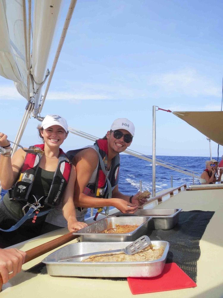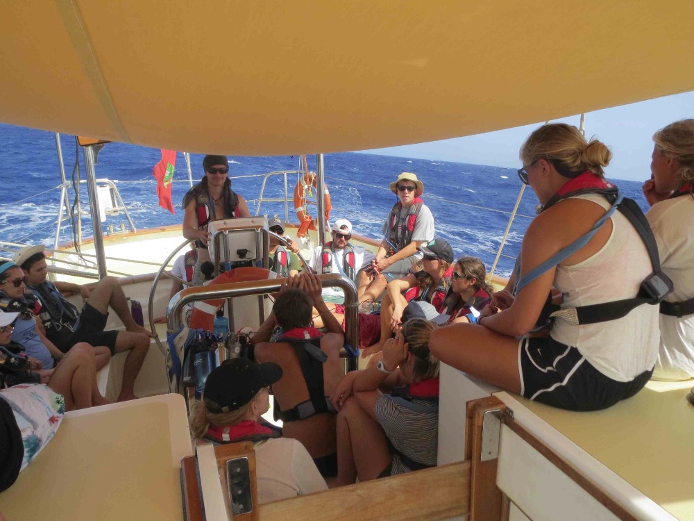 When watch team one relieved watch team four at 6 am, it was still dark out, with some clouds hiding the stars here and there. We settled in for another watch full of listening to Chloe’s dorm room decorations and Coldplay when the bow watch heard something out of the ordinary. They heard something smack into the forward staysail and fall onto the deck. After a minute of investigation, they reported back to the cockpit that a bird had run into our sails and was now lying on our deck. Alex, as we named it due to popular vote, was still alive but clearly shaken. We quickly filled a Tupperware with water and placed it and a bucket next to Alex in case he wanted some additional shelter from the wind. Later, we found a flying fish that had flown on board, so we placed that next to Alex as well. We were well on the path to making Alex our boat pet when the sun started to rise, and we became aware of its mate circling Argo from afar. A little later, Alex took flight and joined its mate and continued flying south. With that bit of adventure out of the way, watch team two eventually relieved us, and we got another couple of hours of sleep before waking up for a delicious lunch. After lunch cleanup, we had our oceanography quiz and then mustered in the cockpit for our leadership class with Ben. Today’s leadership class was set up slightly differently than previous classes: we read some short stories out loud and then followed by asking each other questions about our personal values. After classes, we had a special treat from Ms. Sydney B.- banana bread. After this delicious snack, everyone gathered for a shower and study time. Later, we mustered for a creative squeeze question (if you owned an island, describe what it would look like/ what would be on it?) and an amazing dinner of spaghetti and meatballs. Just as we were preparing for dinner clean up, someone shouted ‘Whale!’ and everyone ran to the stern to watch a huge whale breach multiple times. Two of the times, the whale was 90% above the water. We continued watching for the next several minutes before eventually continuing on our way across the Atlantic. From the features that we could distinguish, we think it was a humpback whale.