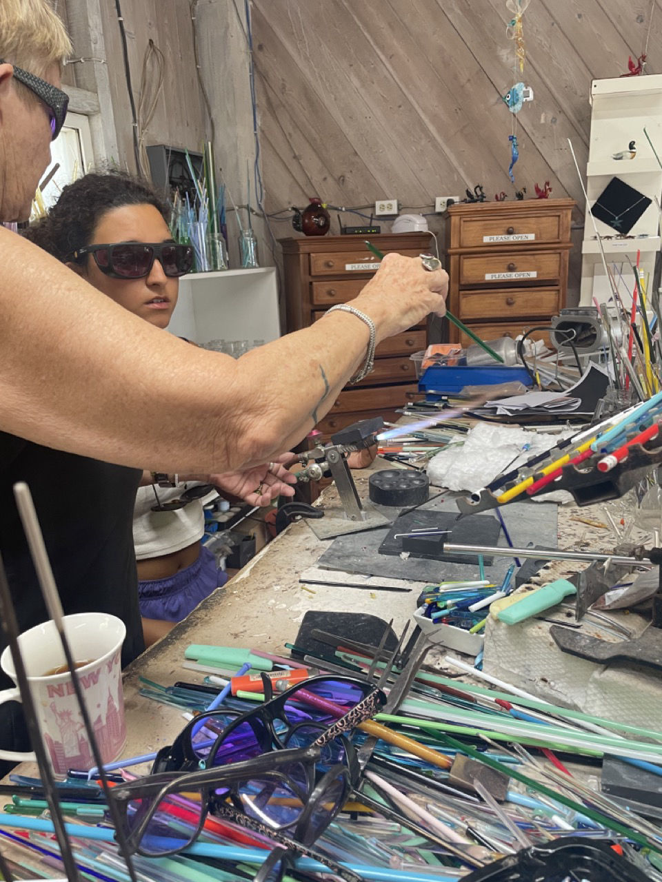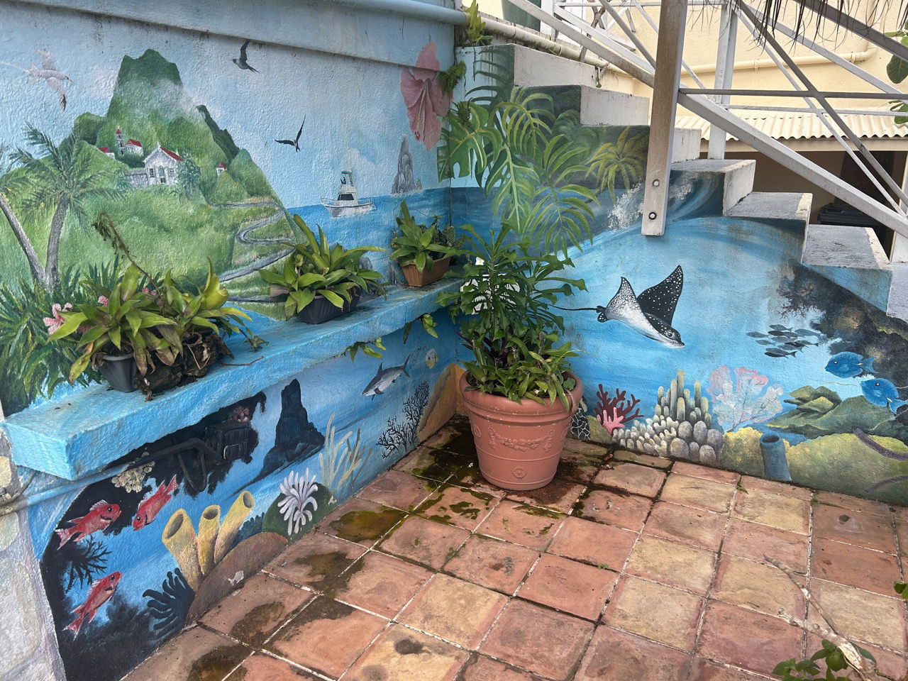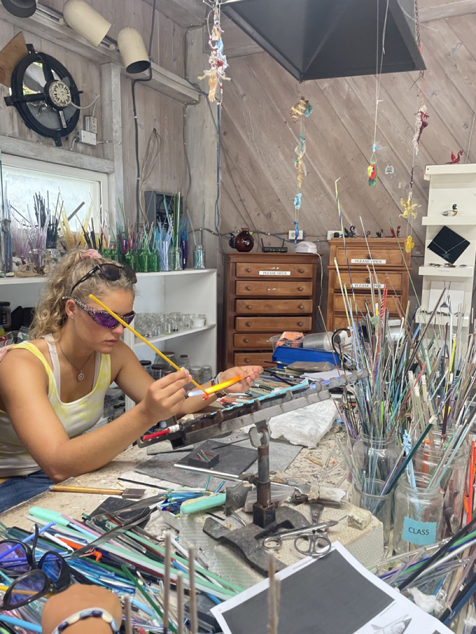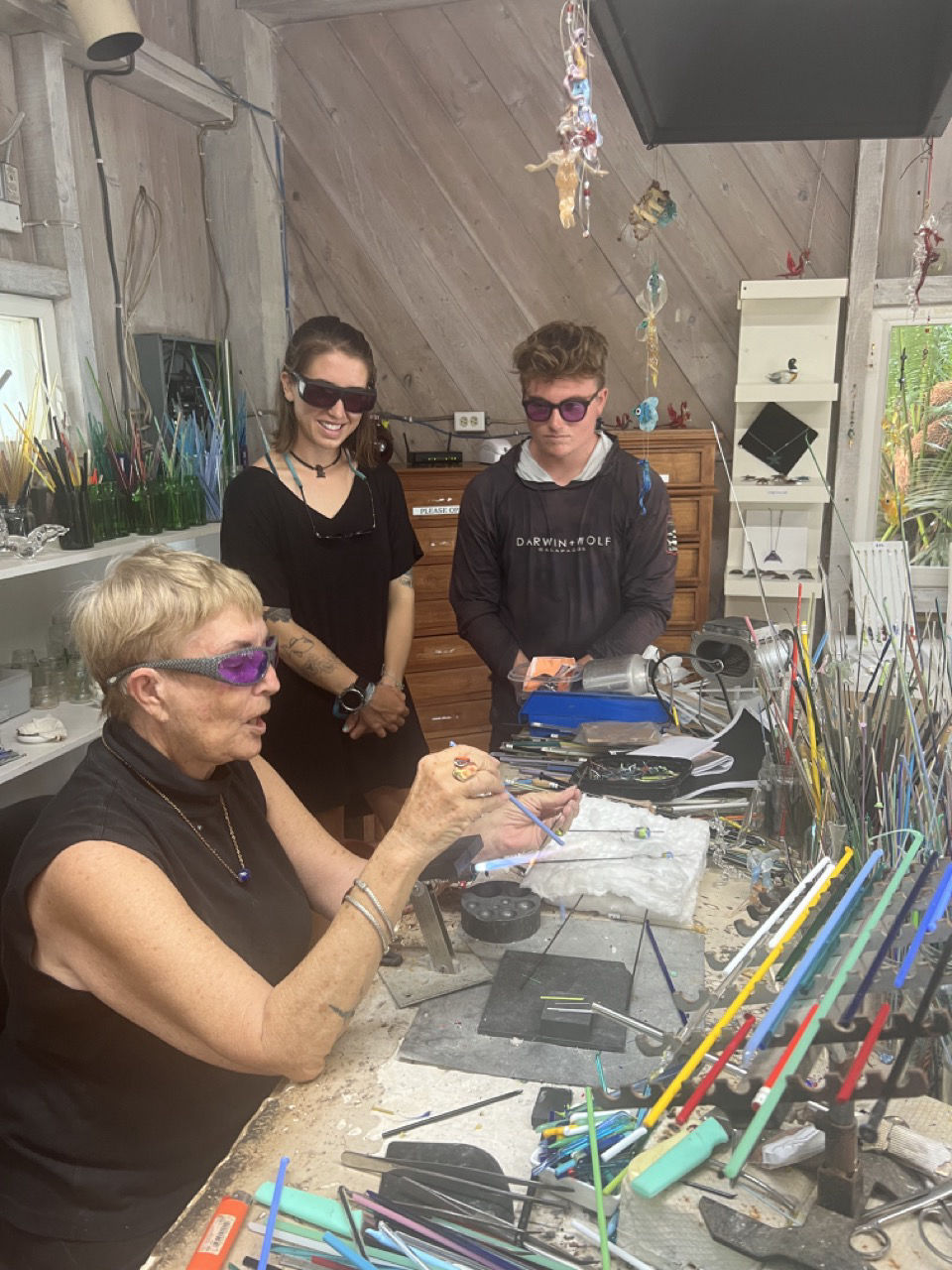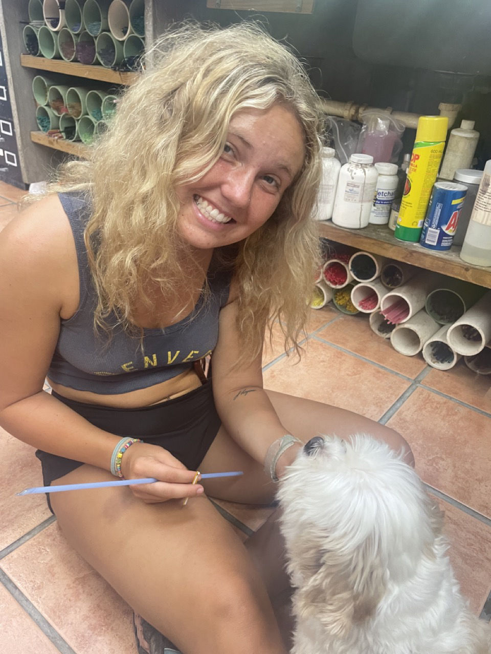 Close to the entrance of Windward two roads separated into the direction of town and towards the highest peak of the Netherlands (Since Saba is part of Dutchland). Allie K, Miguel, Lucas, and Thomas decided to take up the hike and become the tallest people in the whole Netherlands! Congrats guys! How’s the air up there? Meanwhile, the rest of the group took the path towards town past a lovely brown bull and an adorable pink house that was for sale! If anyone’s interested, let me know 🙂 As we went into town, we headed straight for a restaurant where we had some sandwiches, french fries, which Alaina was very looking forward to, and fresh juices. The mango juice I had was incomparable to anything that I’d ever had before. All fueled up, and with a little bit of time on Wifi, we headed off to Jobean’s Beads shop. Jobean is a lovely lady who has been living on the island for quite some time now and has a passion for making small glass sculptures, beads, necklaces, etc. Her store is right inside her atelier, so you can walk along her working station and see how all the crafts are made with just a torch and lots of colorful glass pipes that melt onto one another. Shoutout to Jobean for letting us all have a go at making our own beads and learning the roots of glass art. We all loved it, and I definitely want to do it again. She also showed us how to make little sculptures onto beads in the shape of a frog. I volunteered to be her teacher’s assistant for the demo, and as a gift, she gifted me the glass frog 🙂 I’m sooo looking forward to showing my friends and family. We also got to cuddle with her little dog, called Pirate, which only had one eye. Once bead class was over, it was time to shop, which we all took very seriously. With beads in our bags, we hurried over to the Saba Dive Shop, where we got some colorful stickers and some funny dive merch.