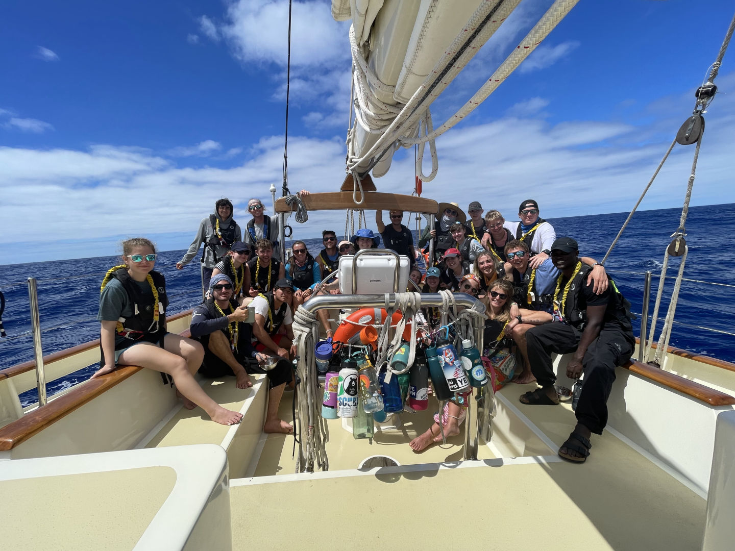 When our watch team finished our shift at 0800, we parted ways with Watch Team 1 (Gabe C, Elisabeth, Emma, Nat, Gabe D, Beau, Max, and Peter), who was taking over, and we headed down below for some breakfast, homework, or some rest before lunch. But not everyone rested because Tim was our first student head chef, so he, Elene, and Gabe G took over the galley at 1000 to make us some tasty and filling food. The sun made an appearance for a few hours in the late morning and early afternoon, and we enjoyed its warm rays. The wind had died down a good bit, so we dropped the jib and mainsail, and we turned on the engine for some motor sailing. Watch Team 2 (Claire, Amanda S, Elene, Ellie, Brina, MG, Will, Gabe G, and Nolan) helm us safely through lunch and clean up before the students headed down below for Oceanography class with Amanda S. They were learning about the layers of the earth, so Amanda had made yellow cake and brownies to represent continental crust and oceanic crust, respectively. They did a (very tasty) lab called “Cake Tectonics” to see how the two types of crust interact, and of course, everyone got to enjoy some yummy treats afterward. When Oceanography was finished, Amanda S, Ben, and I did a scientific reading and writing workshop to help the students get ready for their literature review and essays coming up soon.