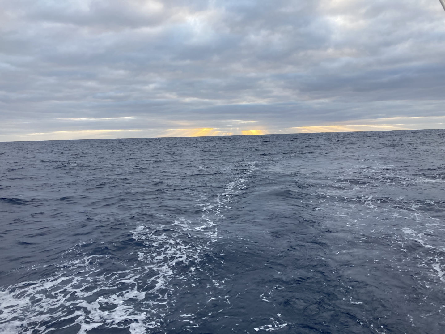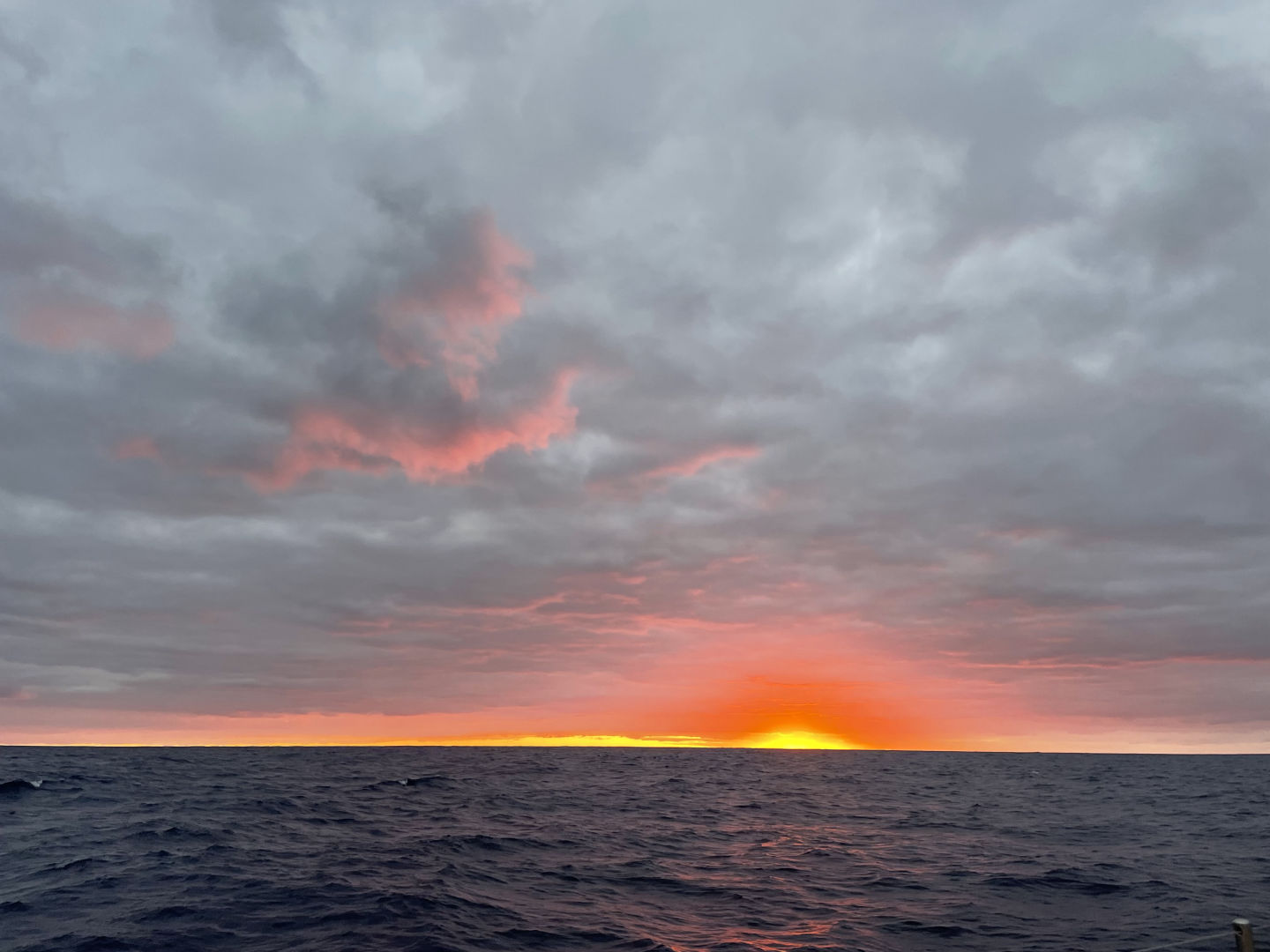 The clouds gathered in again around 1600, and the day once again turned chilly. We had another tasty meal cooked by Tim and the sous chefs, and my squeeze question was, “Why are you here?” There was a variety of answers, and it was really great to hear everyone share their motivations for being here aboard Argo this semester. Every group is unique and different, and we are having so much fun getting to know each other as we form a floating family of sorts. During our final cleanup of the day, the sun blazed brightly through the clouds for a few minutes, signifying the end of another great underway day on Argo.