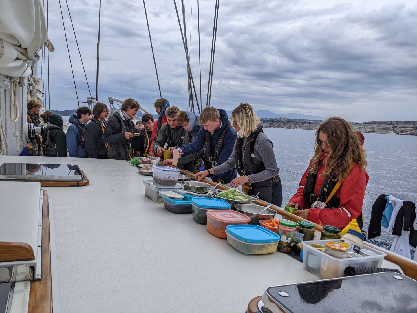 The group then moved on to an Oceanography class with Sam, where they learned about the history of oceanography and some of the key focus areas theyll be learning about this semester. While this was going on, the staff was in the process of moving the boat to a new site. We then had lunch which was set up by our wonderful chef team, a fantastic sandwich spread.