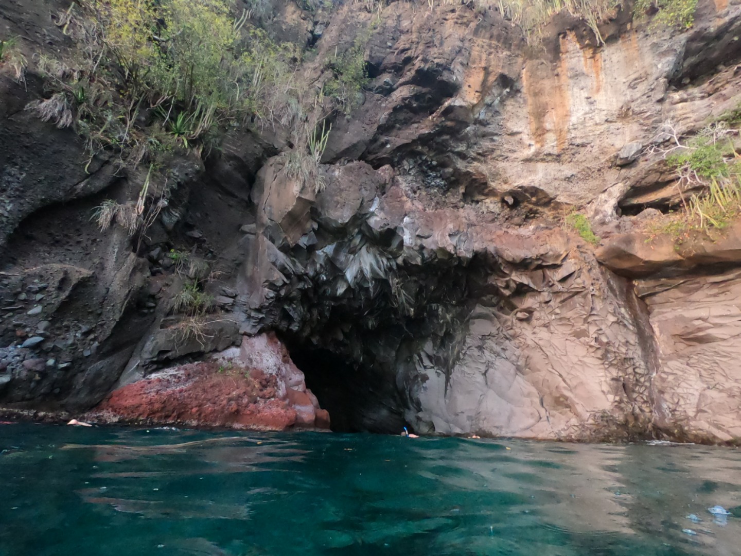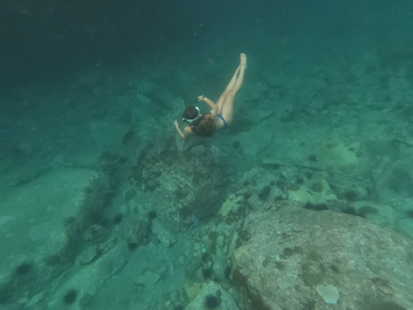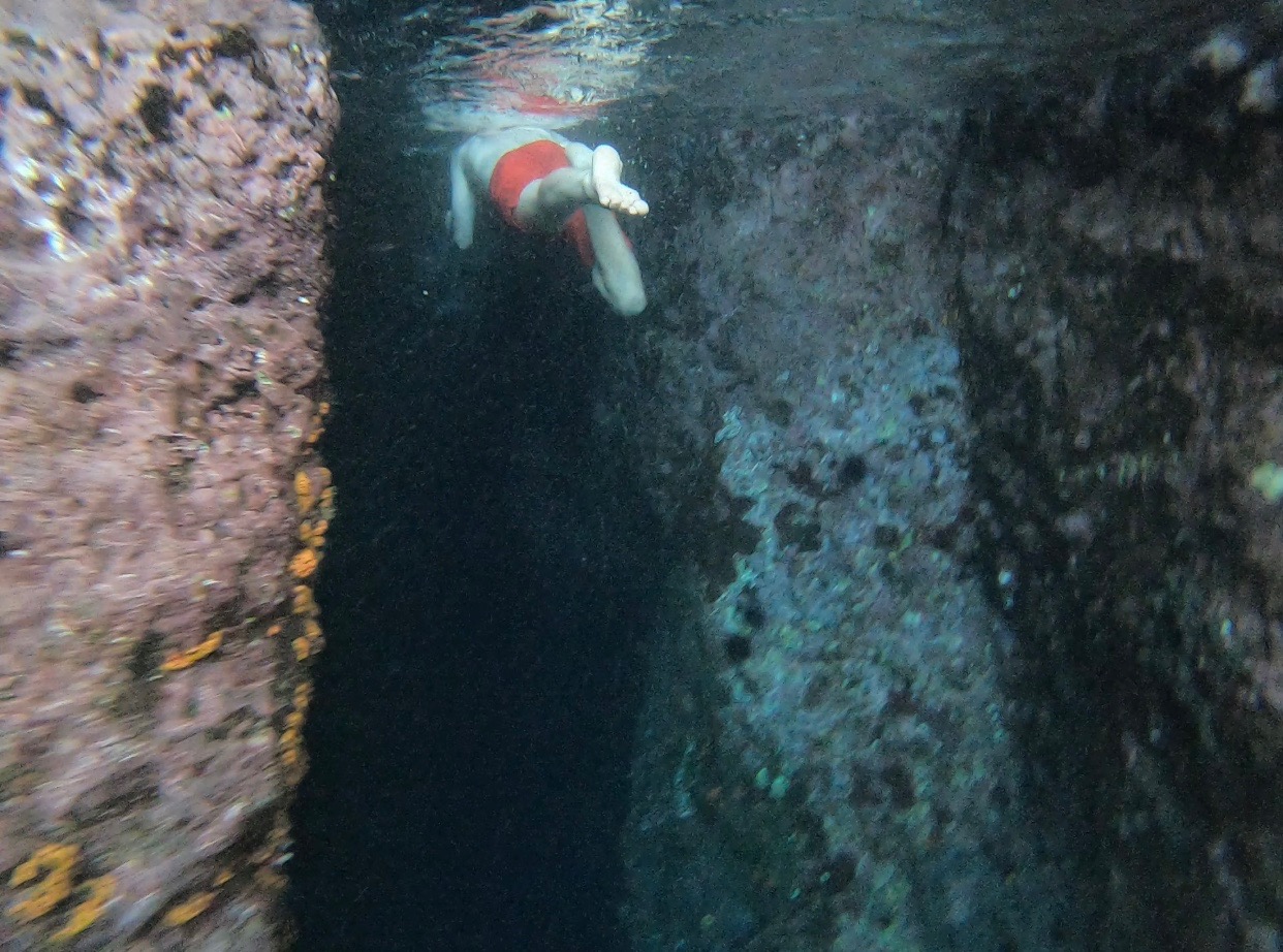 Half of the group went right into their deep dive and came back, telling us all about the lobster and fish they saw. The sun was going down fast, and we had planned a quick snorkel trip to a bat cave, so we hurriedly grabbed our snorkels and dinghied our way to see the bats. It was an otherworldly experience, as Giselle later described it; we first swam towards the entrance of the cave enthusiastically, not expecting a strong current to suck us into the darkness. Bats began to fly above our heads frantically, and all we could hear when we popped our heads out of the water were their screeches. We found a tunnel where we could see some light coming out the other side and decided to investigate. The saltwater river just swept us in, and whenever I thought I was about to hit a rock, I swerved and turned until it all stopped. The current had thrown us out through another entrance. I made sure to pay more attention to the details on the way back. There were some yellowy corals growing on the sides of the tunnel walls as well as sea urchins. When I looked down, all I could see where the two walls of the cave falling into endless darkness. I could barely see the person in front of me. We were once again thrust out of the tunnel into the main part of the cave and swam out to the dinghy. We made our way back to Argo while the sun quickly tucked in over the horizon, leaving her footprints in the sky.