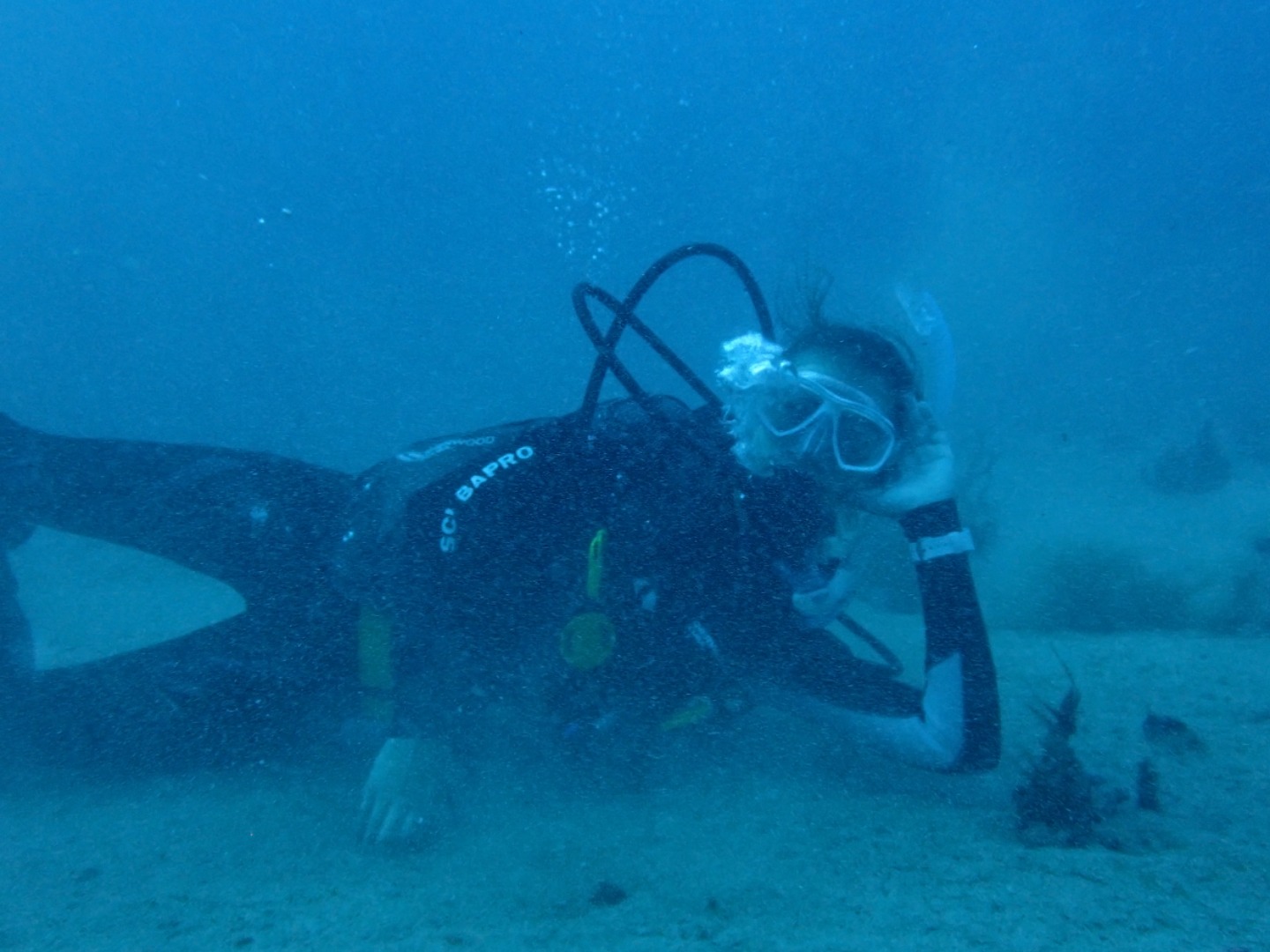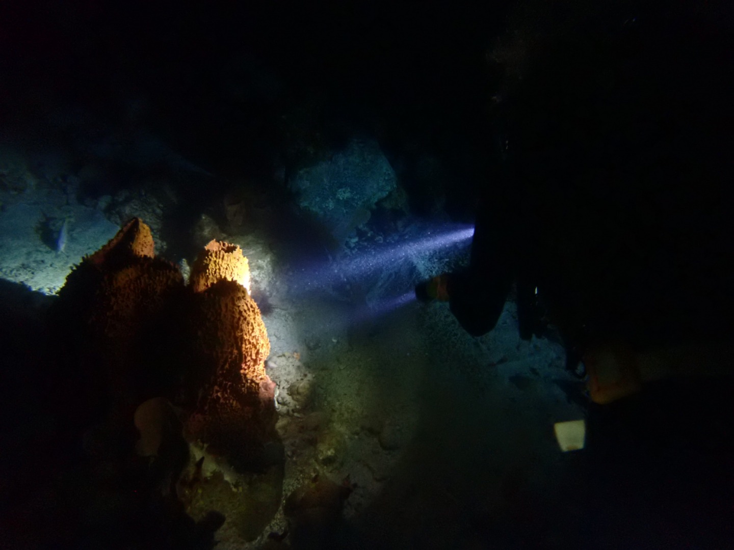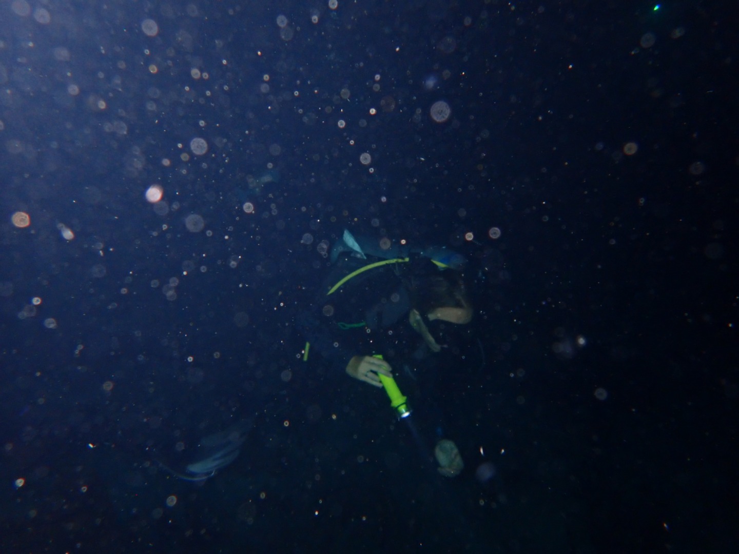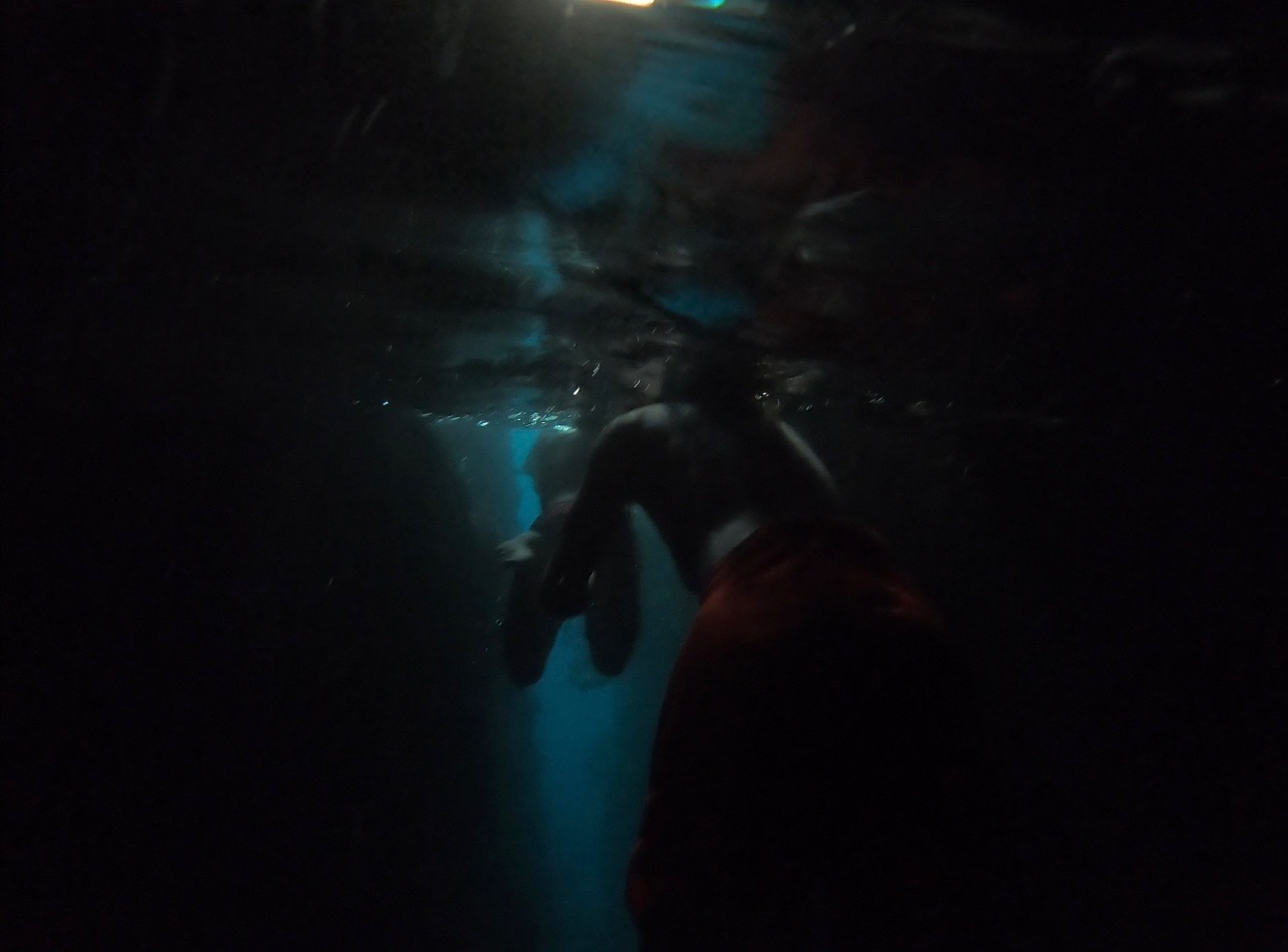 Everyone that had not gone diving in the afternoon set up their gear and got ready for the night dive. We did our “giant strides” from the port side of the boat into the pitch-black water and got into our buddy groups. My buddy was Bella, and Felipe also joined us even though he’s already certified. We reached the mooring line and made our descent into the nightlife of the ocean floor. There were eels, lobsters, shrimp, brittlestars, glowing corals, and countless different types of sleeping fish. I kept trying to get Bella’s attention by yelling her name underwater, and even though sometimes she heard me, I also resorted to pulling her fins towards where I was in order to show her something. On our way up, we all pressed our lights into our wetsuits so we could truly immerse ourselves in the darkness and see the bioluminescence. Once on the surface, we swam on our backs towards Argo and identified some constellations in the clear, starry sky.