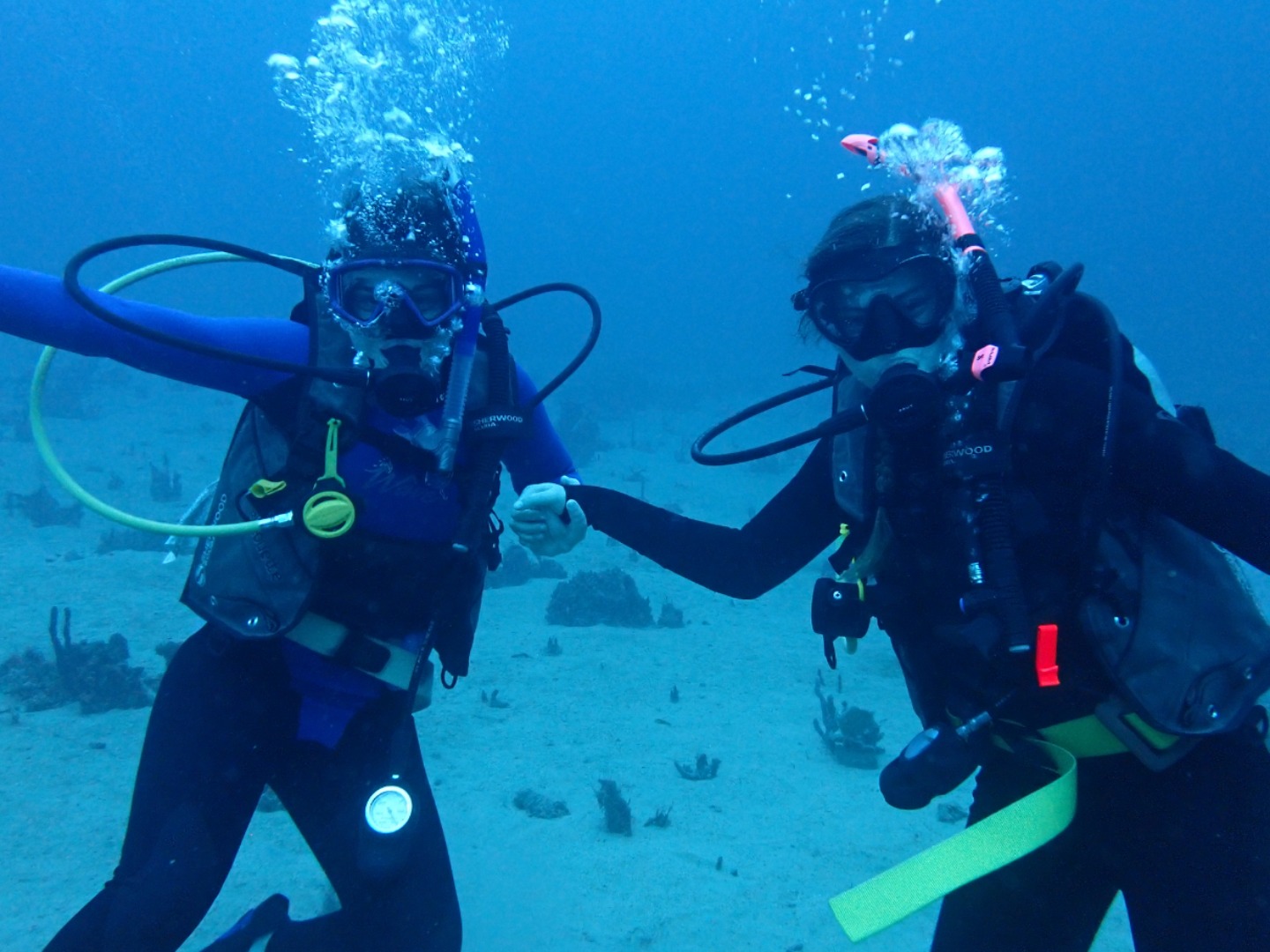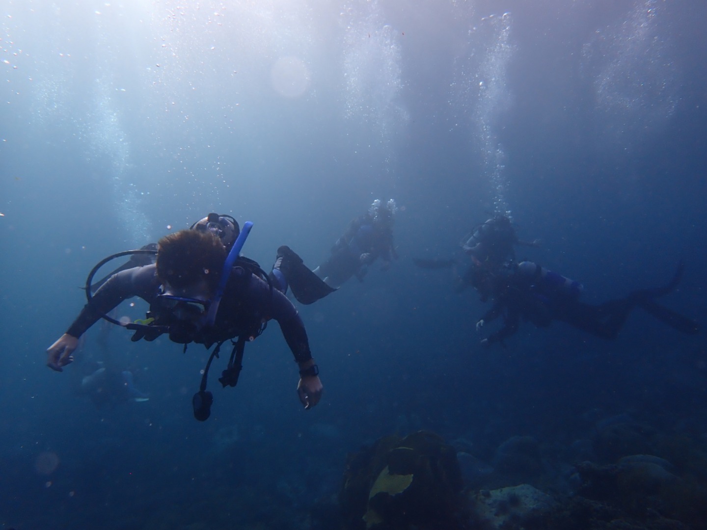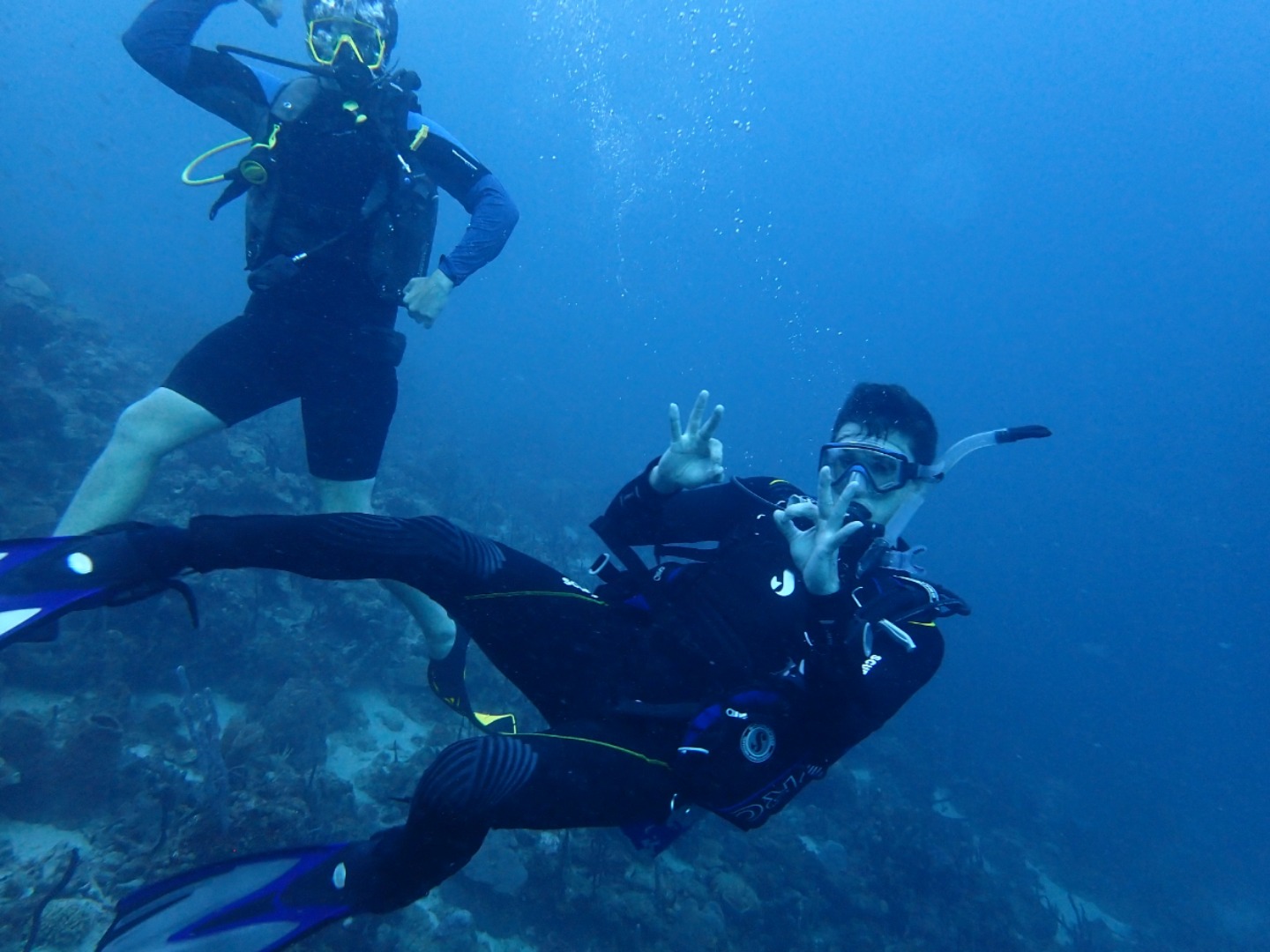 Everyone that had not gone diving in the afternoon set up their gear and got ready for the night dive. We did our “giant strides” from the port side of the boat into the pitch-black water and got into our buddy groups. My buddy was Bella, and Felipe also joined us even though he’s already certified. We reached the mooring line and made our descent into the nightlife of the ocean floor. There were eels, lobsters, shrimp, brittlestars, glowing corals, and countless different types of sleeping fish. I kept trying to get Bella’s attention by yelling her name underwater, and even though sometimes she heard me, I also resorted to pulling her fins towards where I was in order to show her something. On our way up, we all pressed our lights into our wetsuits so we could truly immerse ourselves in the darkness and see the bioluminescence. Once on the surface, we swam on our backs towards Argo and identified some constellations in the clear, starry sky.