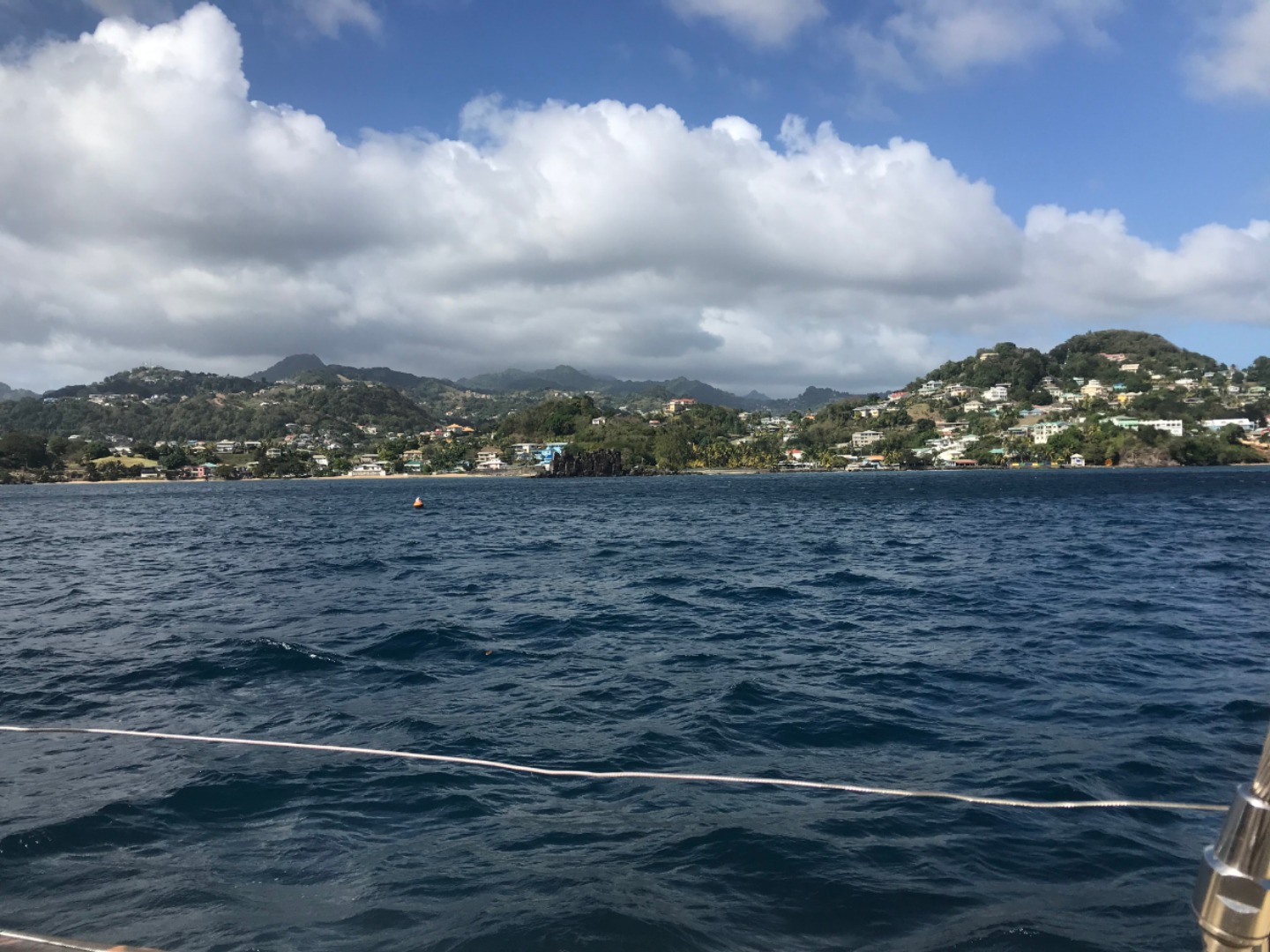 After fifteen-minute power naps, we mustered in the cockpit with plates full of pizza and got ready to move to Petite Bay. The journey was less than an hour, but we still made sure everything was 40/40. I taught Renee, Riley, and Izzy a new card game, and we successfully got through one round, but the wind decided it wanted to play with our cards as well and left us with only half. I then worked in the salon until we arrived and went up to find a lush paradise just a swim away from Argo. It felt as though we were anchoring in an island no human had ever explored.