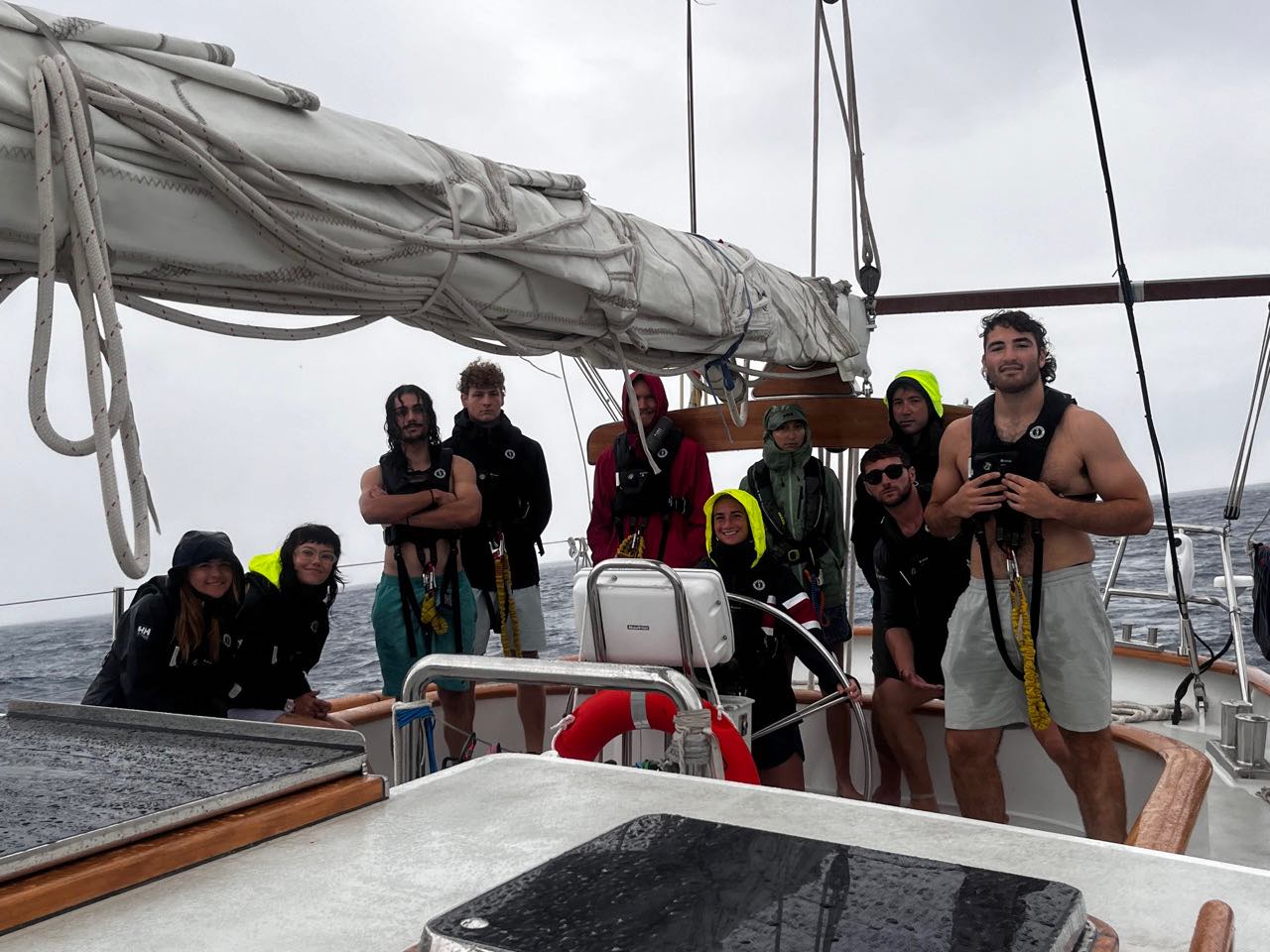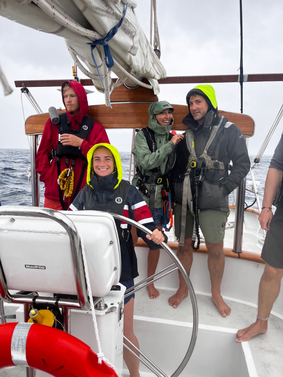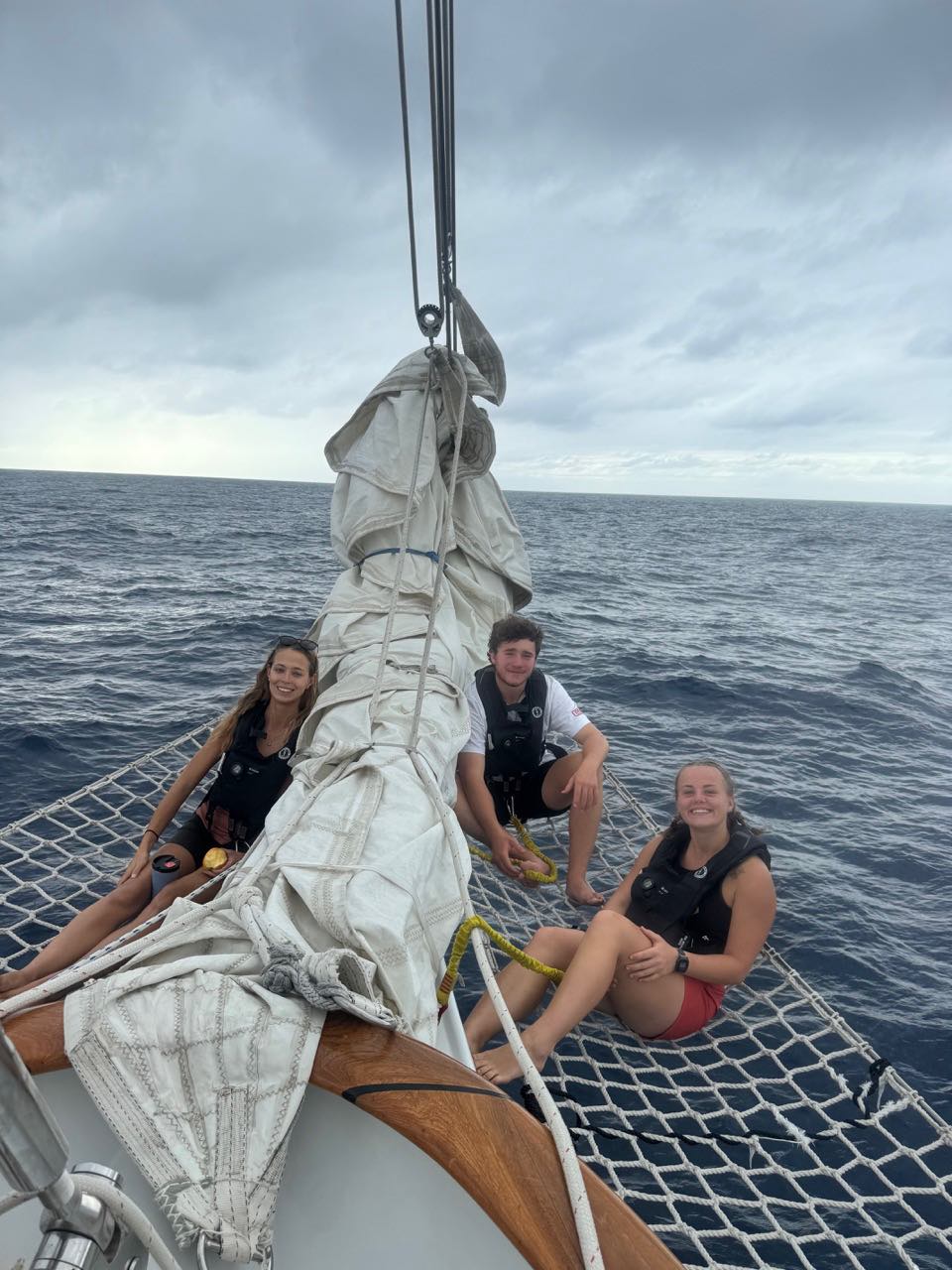 Once the tuna fiasco was over, everyone hung out on deck for a little while before dinner. Dan, Audrey, Jesse, Lukas, Mich, and Boston talked on the martingale until it started to drizzle. We all put on our rain gear and waited for dinner to be ready. With Eliss help, Claire made delicious matcha white chocolate cookies for dinner, which was a special treat. Thank you, Elis and Claire. We ended the day off with our circle of squeeze and our appreciation for the day. It was a good day to be in the middle of the Atlantic. (except maybe if you were a tuna)