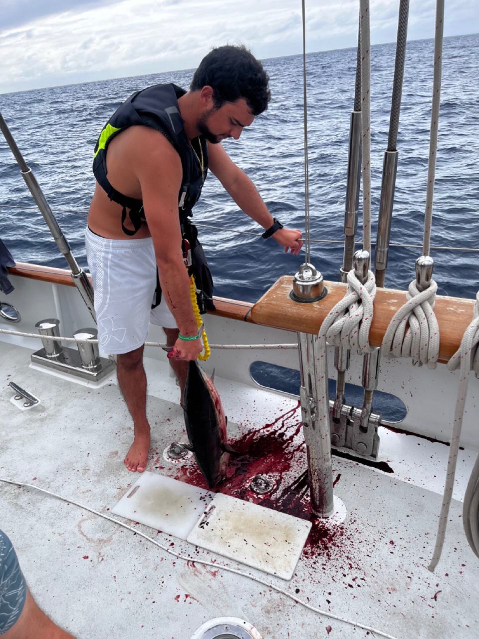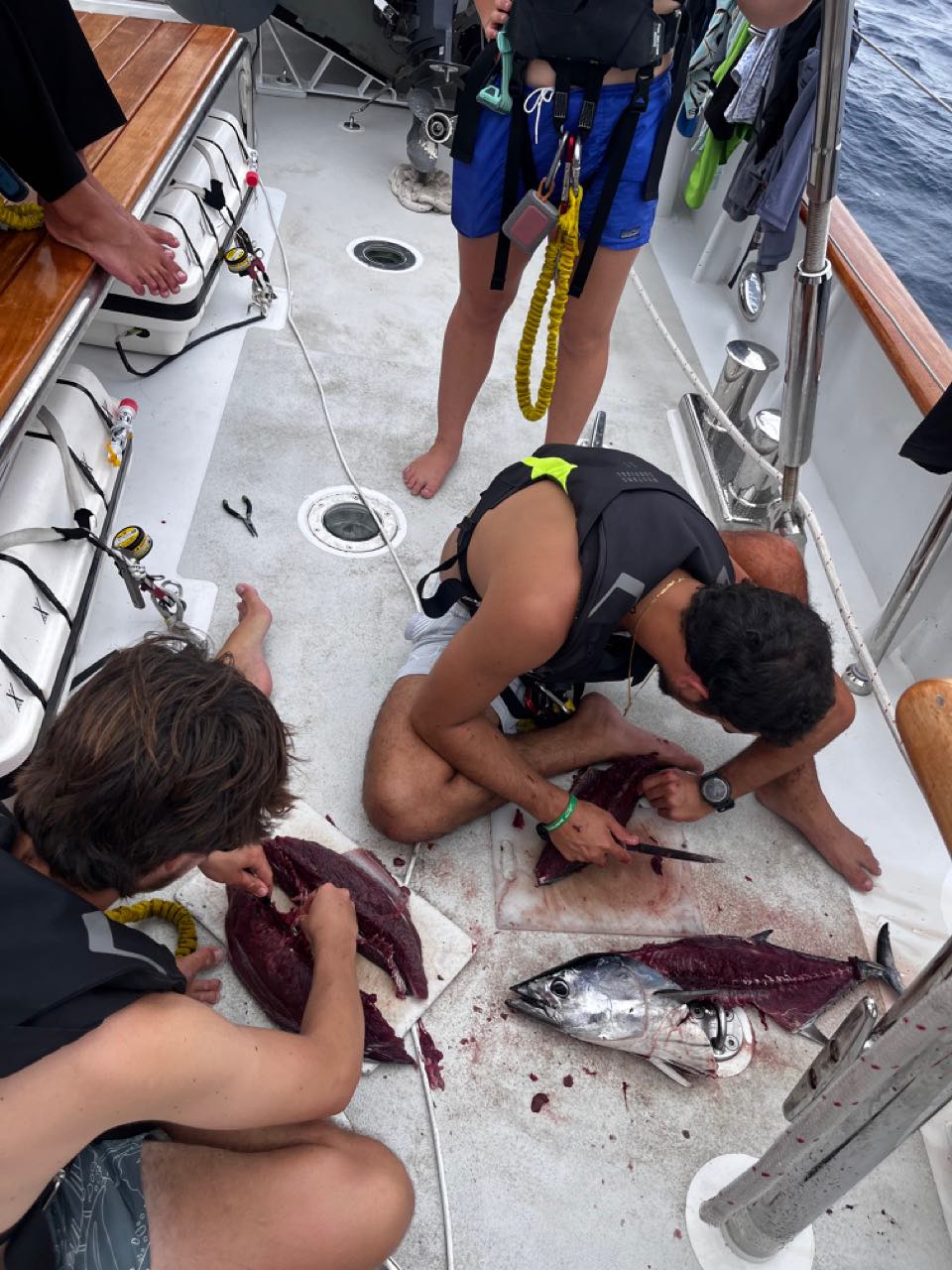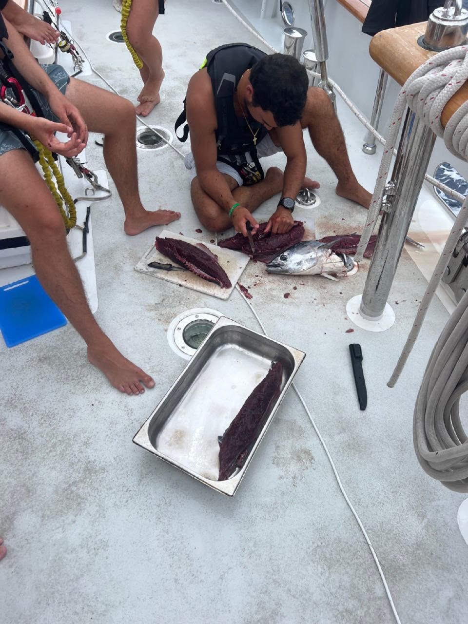 After lunch, we had oceanography with Mich and Seamanship with Mac and Claire. We were split up for seamanship, which left some of us up on deck still to hang out and be on watch. While some of us were working in the salon, Eduardo and Mac were fishing off the stern with their hand lines and caught a huge Skip Jack tuna! With a big audience of people, they cut up the tuna on deck while everyone watched their professional fisherman skills. Smash and Tom said we couldnt bring the tuna into the galley because it was too smelly, but fortunately, we werent picky, and we were a little impatient, so we ate the raw tuna for an hour with some lemon juice and sriracha. Who knew Theo could predict the future? As in Cats words, maybe we should ask Theo to dream about catching a tub of ice cream next, which I 100% agree with.