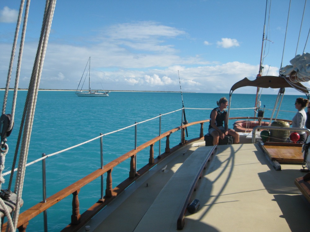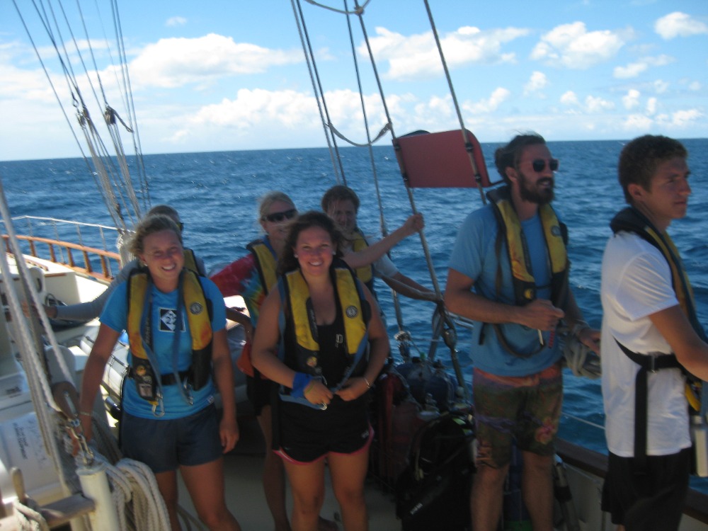 Arriving in Barbuda, we dropped sails and laid anchor just off a beautiful sandy beach and set about getting coursework done when our resident oceanographer Emma came running down the companionway yelling that her dive buddies had not surfaced with her and were missing, kicking off the first of our rescue diver surprise training scenarios. The students went into action, rapidly donning scuba gear, prepping oxygen and medical equipment, and preparing the boat to receive patients. With the direction of spotters and an expanding square search pattern, the missing divers were brought to the surface and hauled up onto Ocean Star, where first aid was administered and emergency services were contacted. Nick, another staff member, played a panicked diver and gave two of the students quite the run for their money while trying to use them as flotation devices. With a true commitment to the bit, he kept up the facade while being hauled into the dingy, scuba tank and all and brought onto the boat, where he searched for his dive buddies and had to be further calmed and attended to.