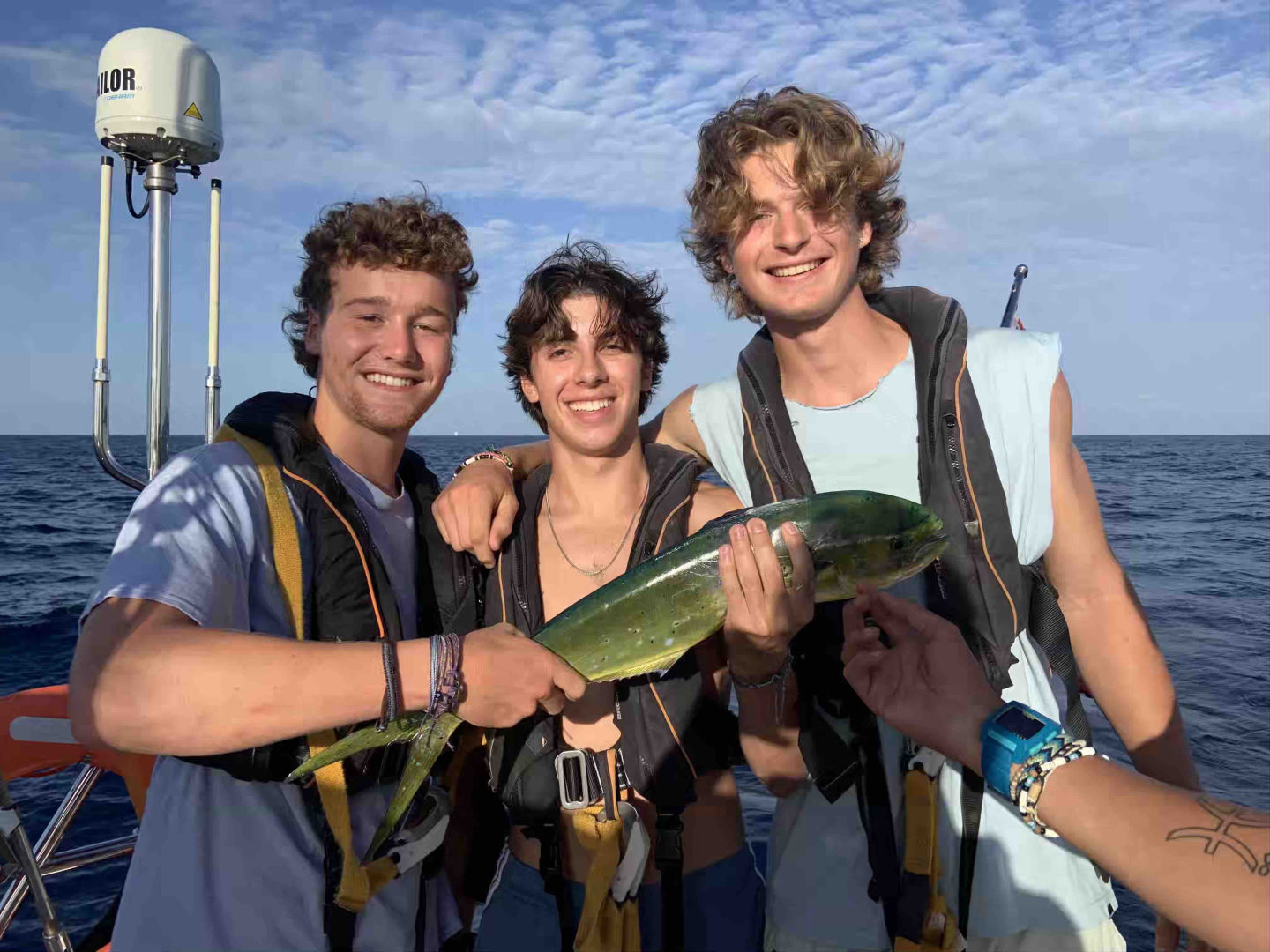 Fast forward to after our oceanography quiz and after nav practice (during which there was some studying, but also some lying on the floor bemoaning existence and people sketching out their home kitchen layouts). I had just gotten out of the shower and was about to take a nap before dinner when I heard absolute pandemonium up on deck, the level of which was akin only to when someone spotted glow-in-the-dark dolphins. So I stumbled out of bed, yanking on my PFD, and flew up the emergency companionway to hear the boys yelling, “Mahi Mahi.”