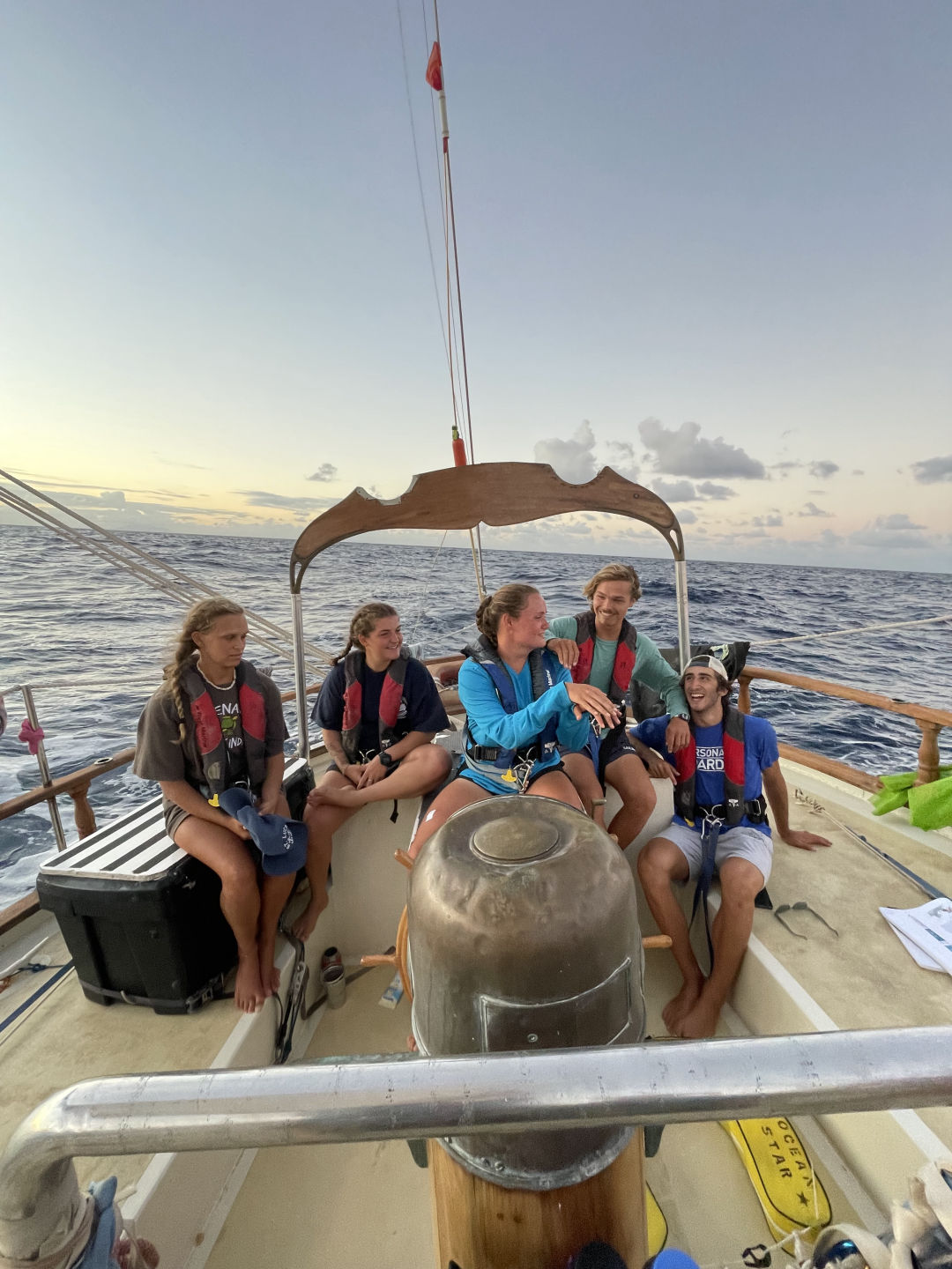 Photo 1: Leadership team. From left to right: Katie Palmer (Mate), Mia Bilezikian (Chief Mate), Kate Ryan (Skipper), Nicholas Kebo (Chief Navigator and author), Alexis Markakis (Chief Engineer).