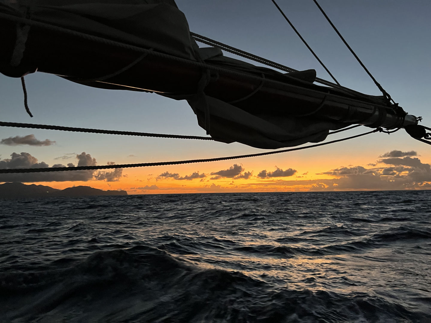 0300 – Watch Team 3 begins its 0300 – 0600 watch. In these three hours, we maintain course, and I speak roughly seven words in total. Also, the jib is now up. The sunrise is accompanied by a pod of dolphins as Watch Team 3 is relieved by Watch Team 1. I go to sleep.