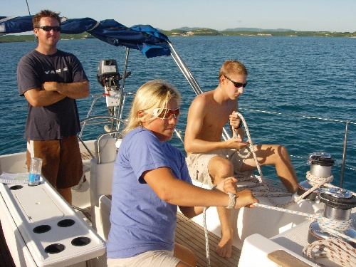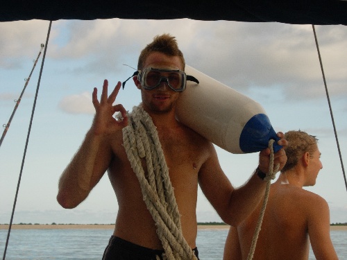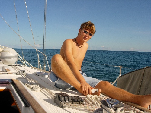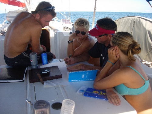After a scrumptious breakfast of oatmeal with raisins, we maneuvered Near Enough through the reefs around Green Island. Snoop’s sharp eyes from the spreaders helped with this close-quarter maneuvering. The motor to Barbuda was 35 miles. There was no wind, the sea was like glass, and we caught quite a few fish. None of them were large enough to eat, so were threw them back. In the afternoon, Boomer taught us some celestial navigation. Upon reaching Barbuda, we dropped anchor and proceeded to swim out a stern anchor to line up the bow into the swells. When running out the stern anchor, the crew of Near Enough chose the method of Bernard Moitessier of tying fenders to the anchor and chain, swimming it out, and releasing the fenders to drop the anchor. Unfortunately, the anchor was not set at the desired distance on the first attempt, so Boomer and I put our masks and fins on, and with the help of Drew and four fenders, we positioned the anchor more desirably. Dinner consisted of pasta and salad, followed by a cake for Chantale’s birthday. Happy birthday, Chantale!