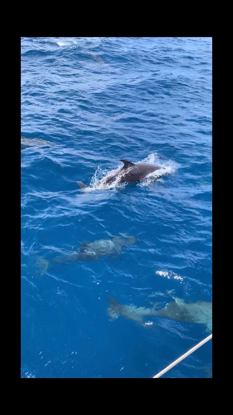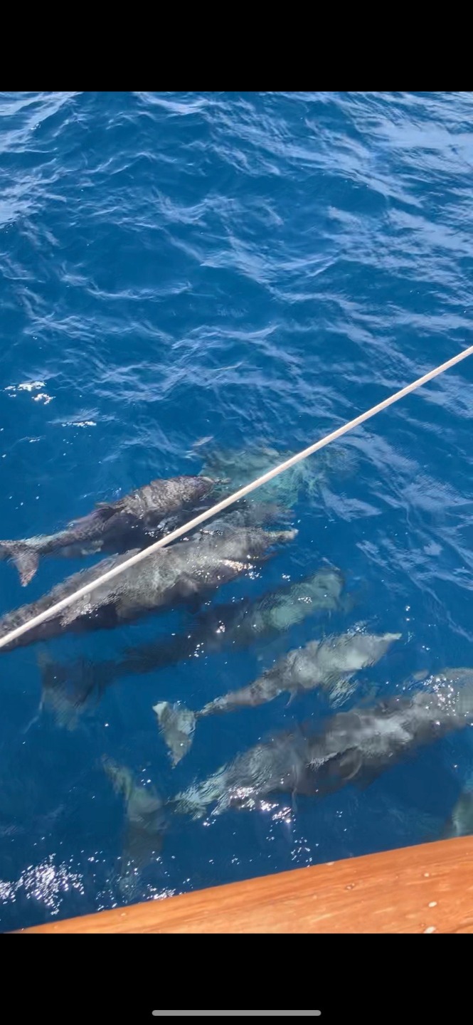 Pictured: Playful dolphins and David B at the helm during sunset.