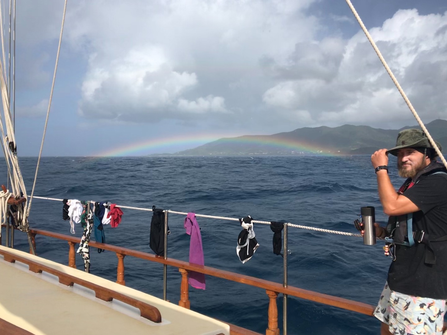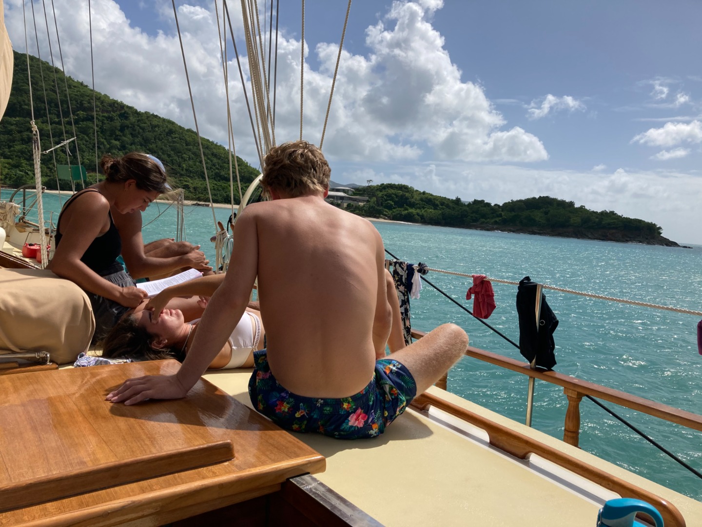 Calum started teaching us about courses to steer in Navigation Master for Seamanship. Course to steer involves how to determine the heading you need on your ship’s compass in order to reach a particular destination – taking into account the speed and direction of a current. We spent a good chunk of the afternoon practicing several courses to steer problems and how to plot these problems on our charts. Most of the shipmates had the rest of the afternoon free to study, write, swim, snorkel… Ben, Luke, Mike, and Will went for a swim over to the nearby beach to snorkel and explore a boat that had grounded. Calum, Zoe, Isabel, Ash, and I decided to spend this time working through some more Divemaster (DM) skills for their course. Calum, Zoe, and Isabel all demonstrated how to properly perform a buddy check and do a deep water entry. We all dropped down under the boat to watch Zoe and Isabel do their gear exchange. The visibility was too bad, so we cut the underwater skills short. Our three DM’s demonstrated how to switch between a snorkel and regulator, take off their BCD and put it back on, and properly check if you have correct weighting before a dive. We were all excited to spend some time back in the water and are eager to get in some actual dives now that we are back in Antigua!