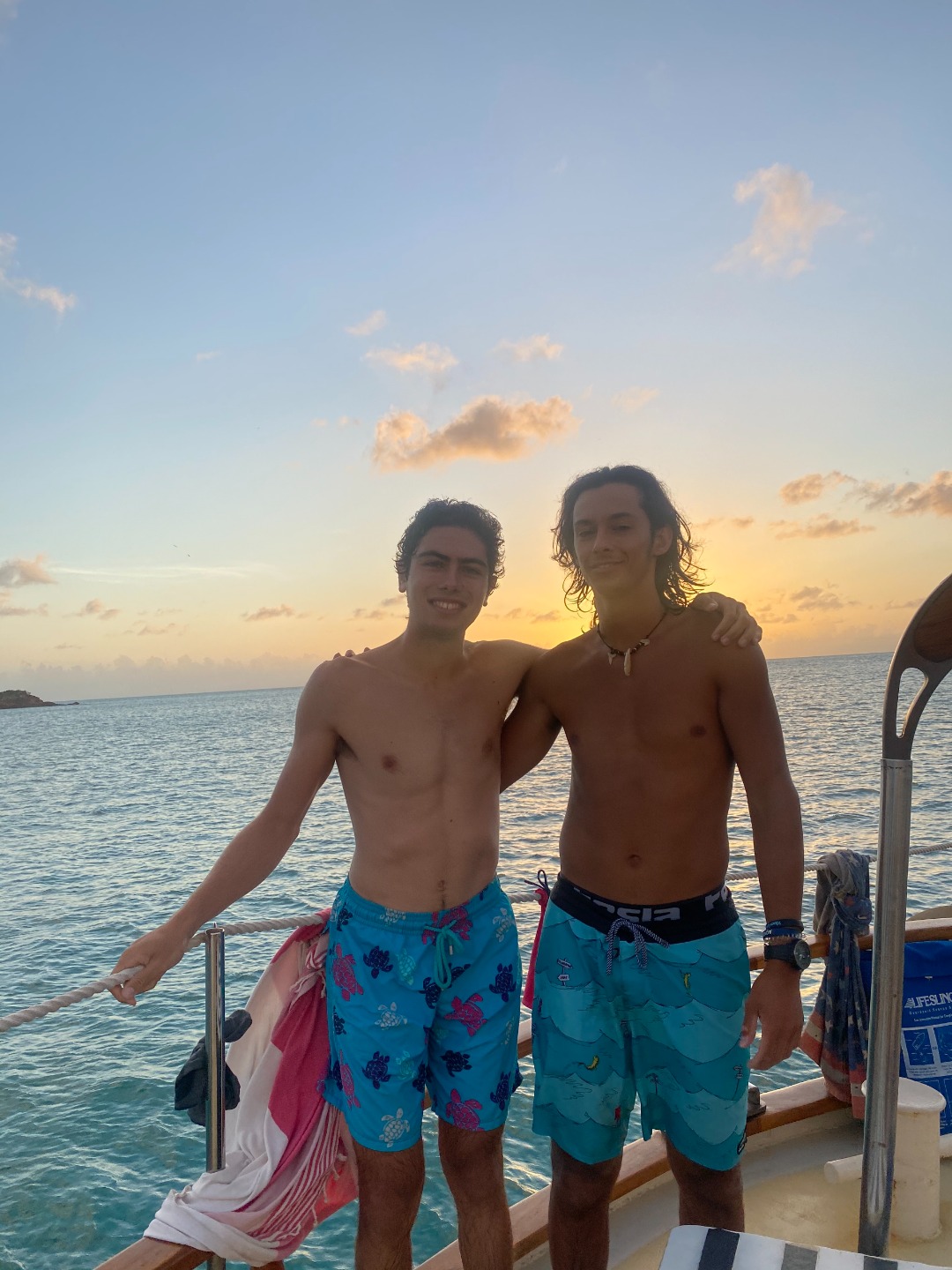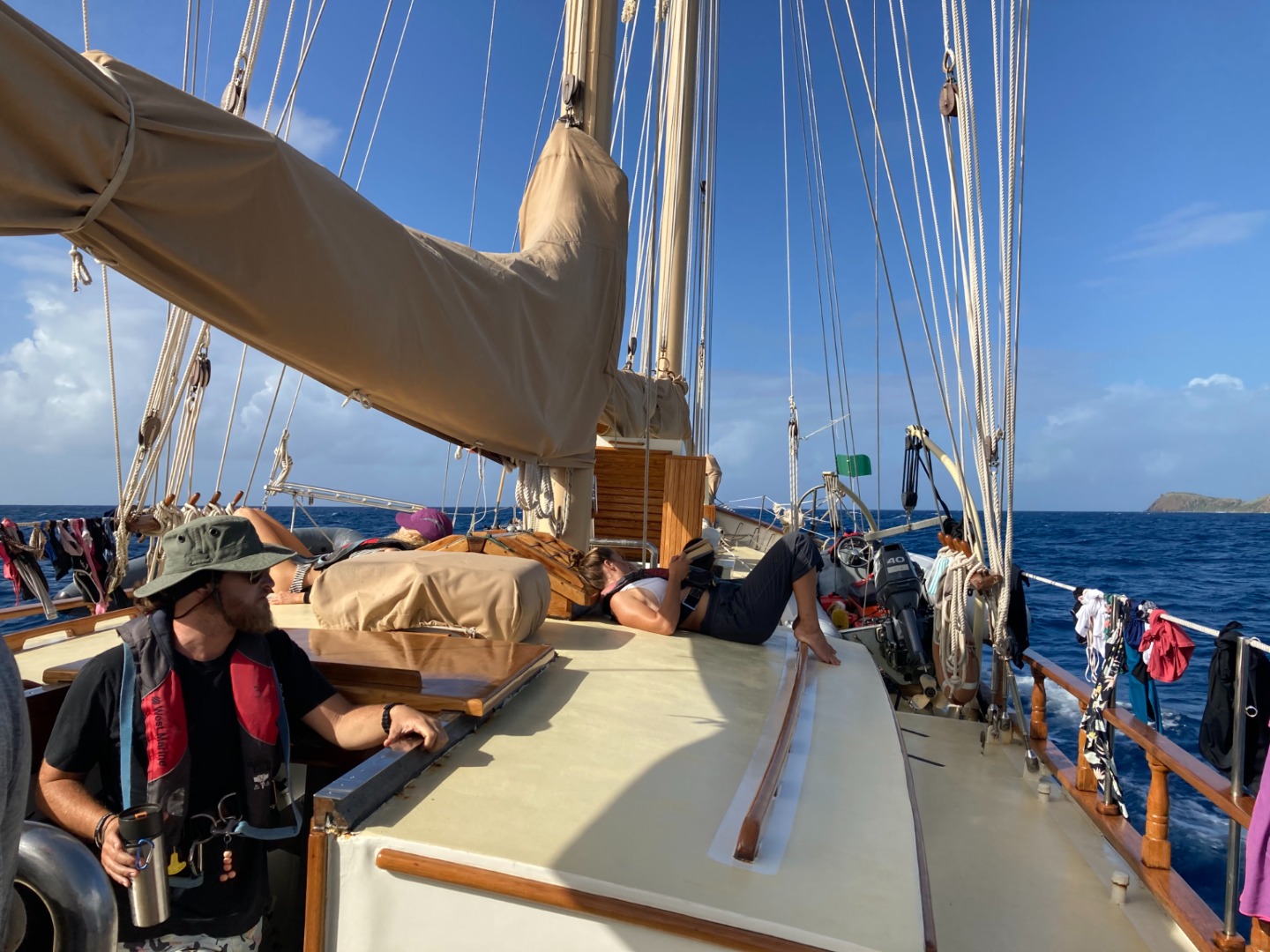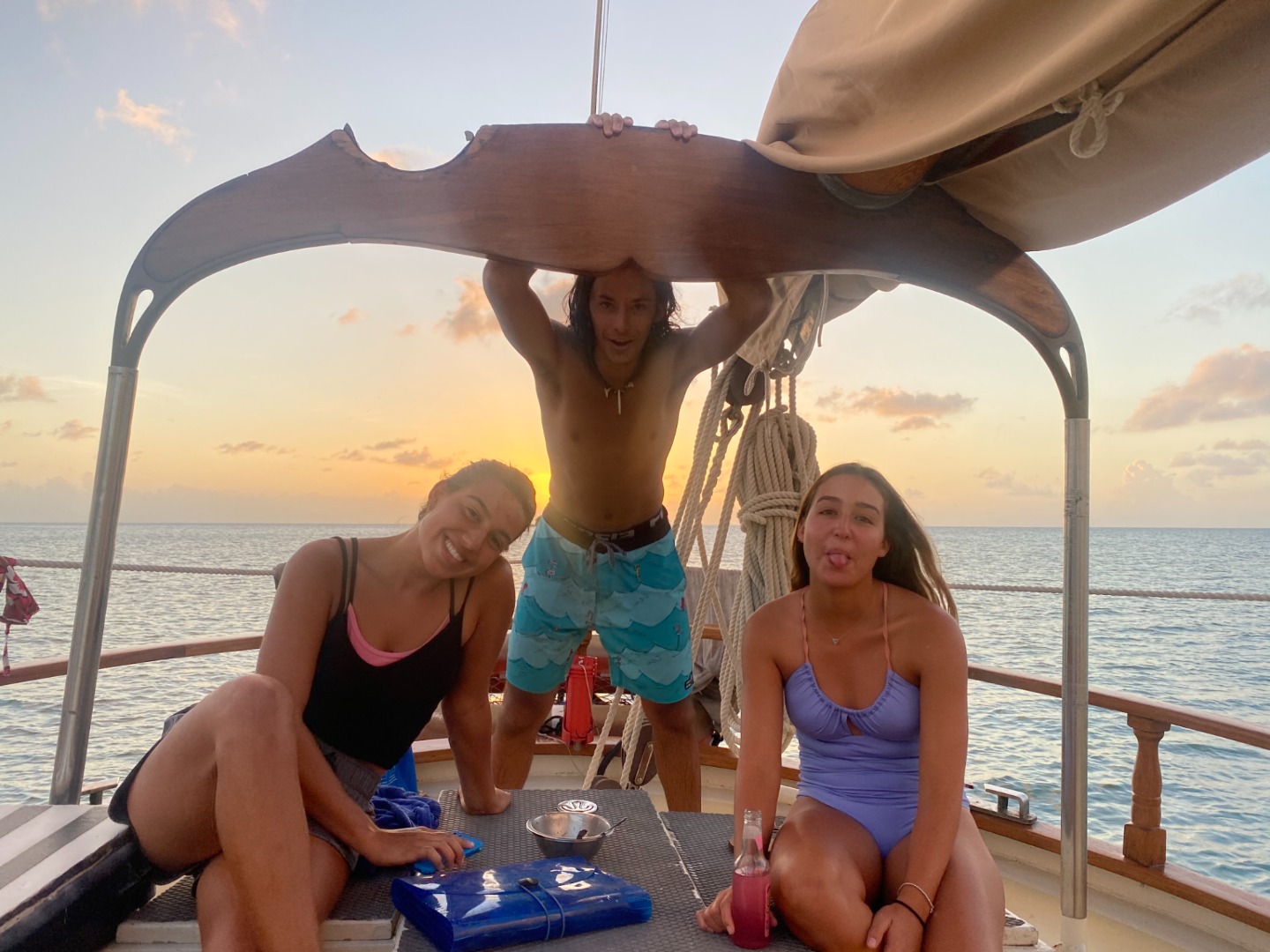 We fueled up to move out of Falmouth Harbour with chia seed pancakes and bacon this morning. After getting cleared in by customs and the health department yesterday afternoon, we decided to move away from the rolling swells in Falmouth to calmer waters. It took about an hour and a half to motor to Pearns Point, along the western side of Antigua. Ocean Star anchored in a small bay with turquoise waters and a small beach within swimming distance. Once the anchor was set, the shipmates took their final Oceanography quiz, which focused on marine management and climate change topics. While our chef team, Ruth-Riley, Mike, and Zoe, prepared homemade pesto pasta with chicken, the rest of the shipmates then began reviewing for their Oceanography final or writing their final Marine Biology paper about artificial habitats.