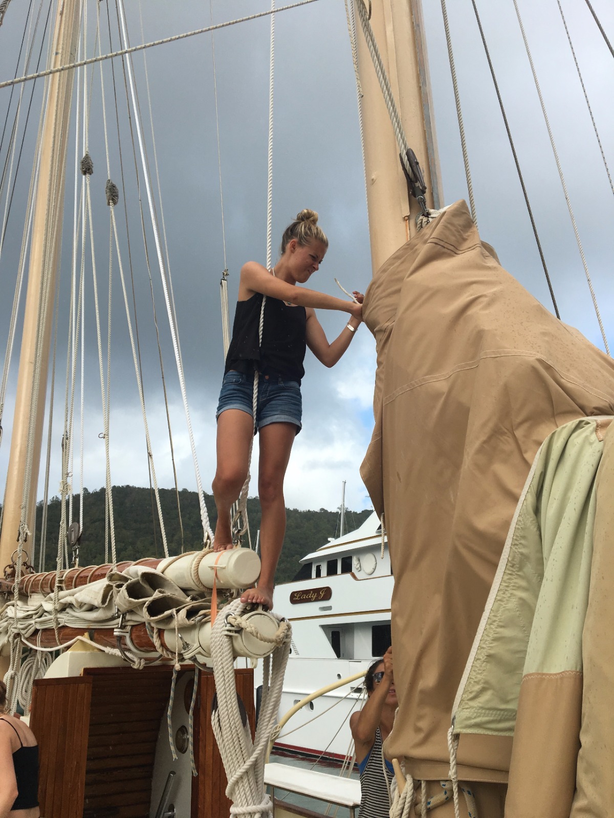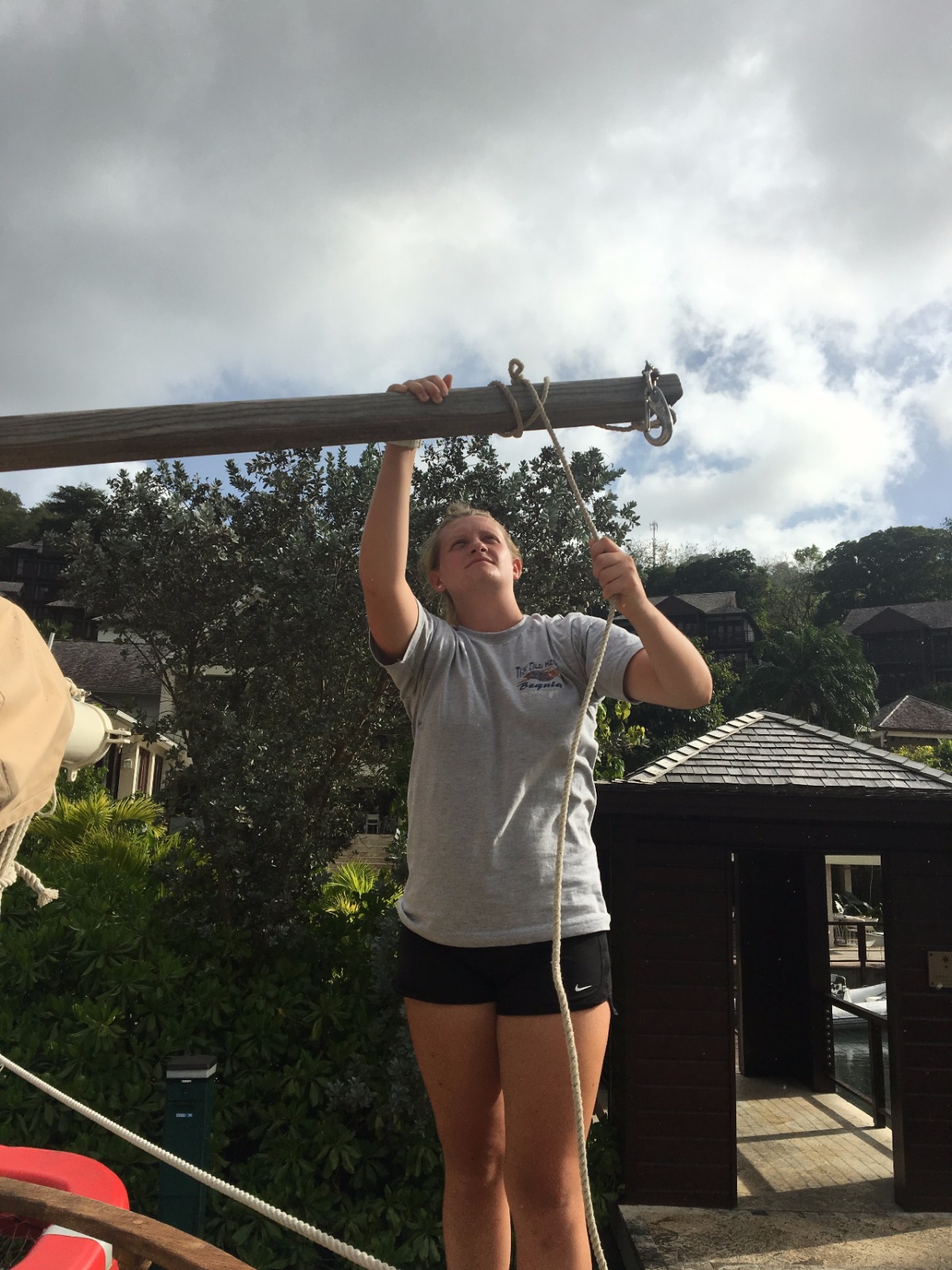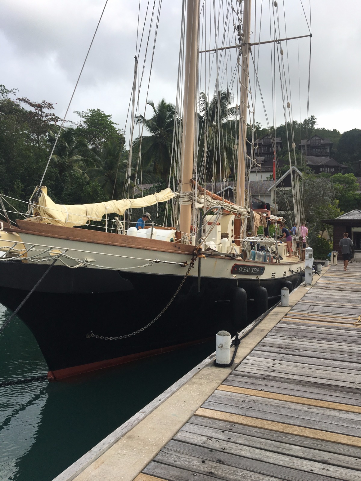 Here we are, day two of being in Marigot Bay, and as relaxing as these days have been, school stress is starting to build a little bit as we have our literature review for Oceanography due by sunset tomorrow. This morning started with the same rain-sprinkled skies, with rainbows popping up here and there. After finishing up a lecture on marine mammals, we had the afternoon to do what we pleased onshore. Some continued their relaxation by the pool, others worked on schoolwork, and some combined the two in one. After having lunch onshore and a few more hours to roam around, we returned to Ocean Star to move her onto the dock for refueling. After trickily maneuvering her next to the fancy yacht, Lady J, we were all happy to be safely secured to the dock. After the luxury of hot showers onshore, we indulged in tacos for dinner and slipped into cleanup before our last class for the day, seamanship. The night is about to be full of sleep for some, dock watch for others, and surely lots of essay writing for most.