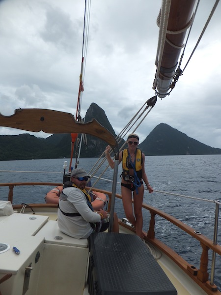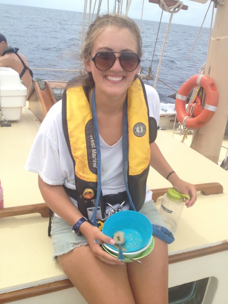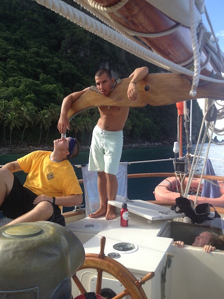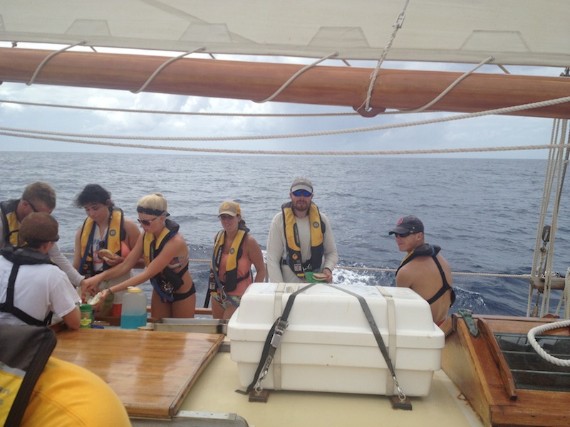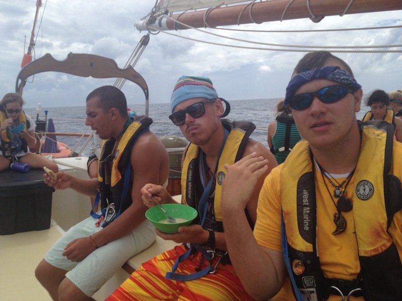 Today started off with a light breakfast and clean-up, which is normal for a day on Ocean Star. After breakfast, we had a leadership class and prepped for our passage. The crew and I needed some motivation to get the boat prepped as fast as possible. Just the thing presented itself: if we arrived in enough time, we would be able to enjoy shore showers! With that news, we raised the sails as fast as we could and got the boat underway. Brooke took the helm for the passage and got some practice tacking the boat (turning the bow through the wind). Most of us stayed on deck as deckhands and helped work the sails and coil lines. Will and Ben braved the climb to the crow’s nest; ironically, when they climbed up, the waves got a little bigger, and the wind blew stronger. Nick (our marine bio teacher) broke out the video camera and filmed our progress and how quickly we had gotten at working around the ship. This led to the interview of each student by, Bret.