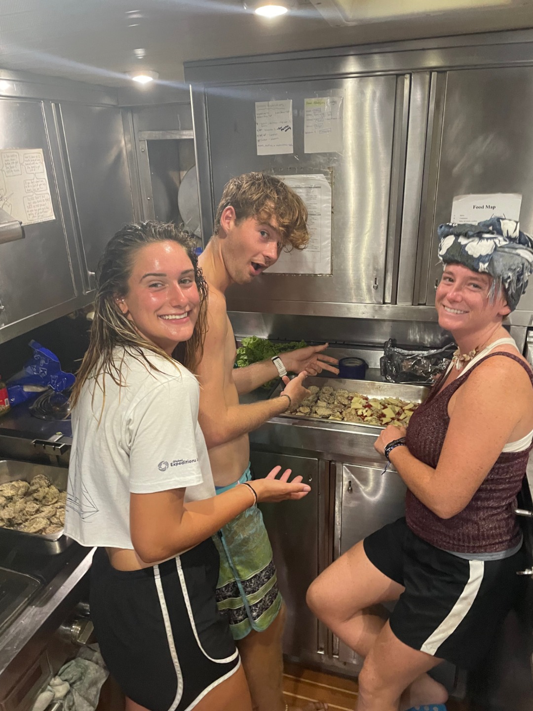 For lunch, D, Carly, and Matt were back at it again with Mediterranean wraps. Yum. Filled with fresh veggies and homemade tzatziki sauce, we faced a Marine Biology fish ID quiz (which I’m sure we will all soon find out we aced). After the quiz and a review class, we got some restful free time while watch team 1 (bowm Bowwm) was on, and finally, took our slippery, abrasive, and thrilling passage deck showers.