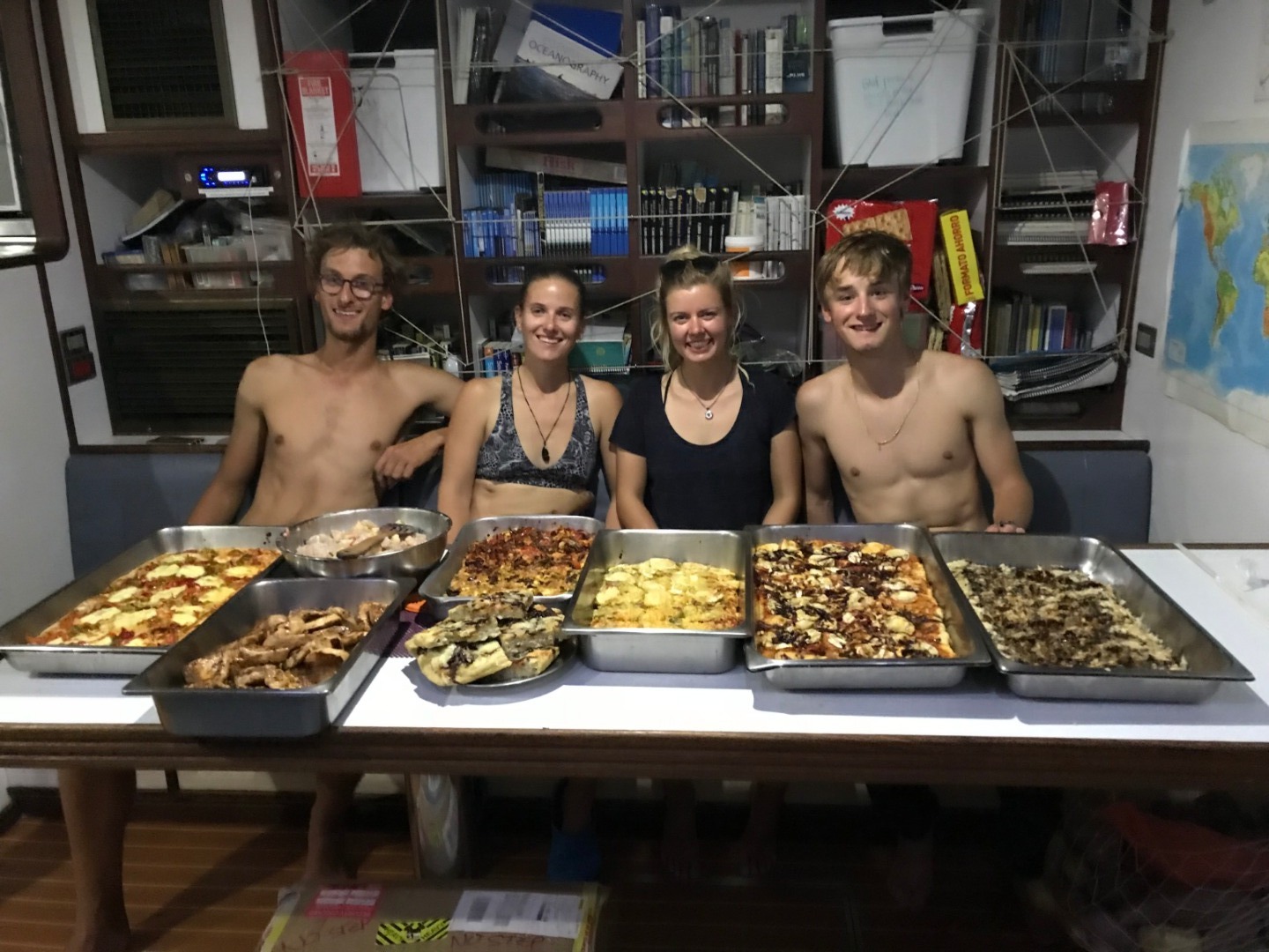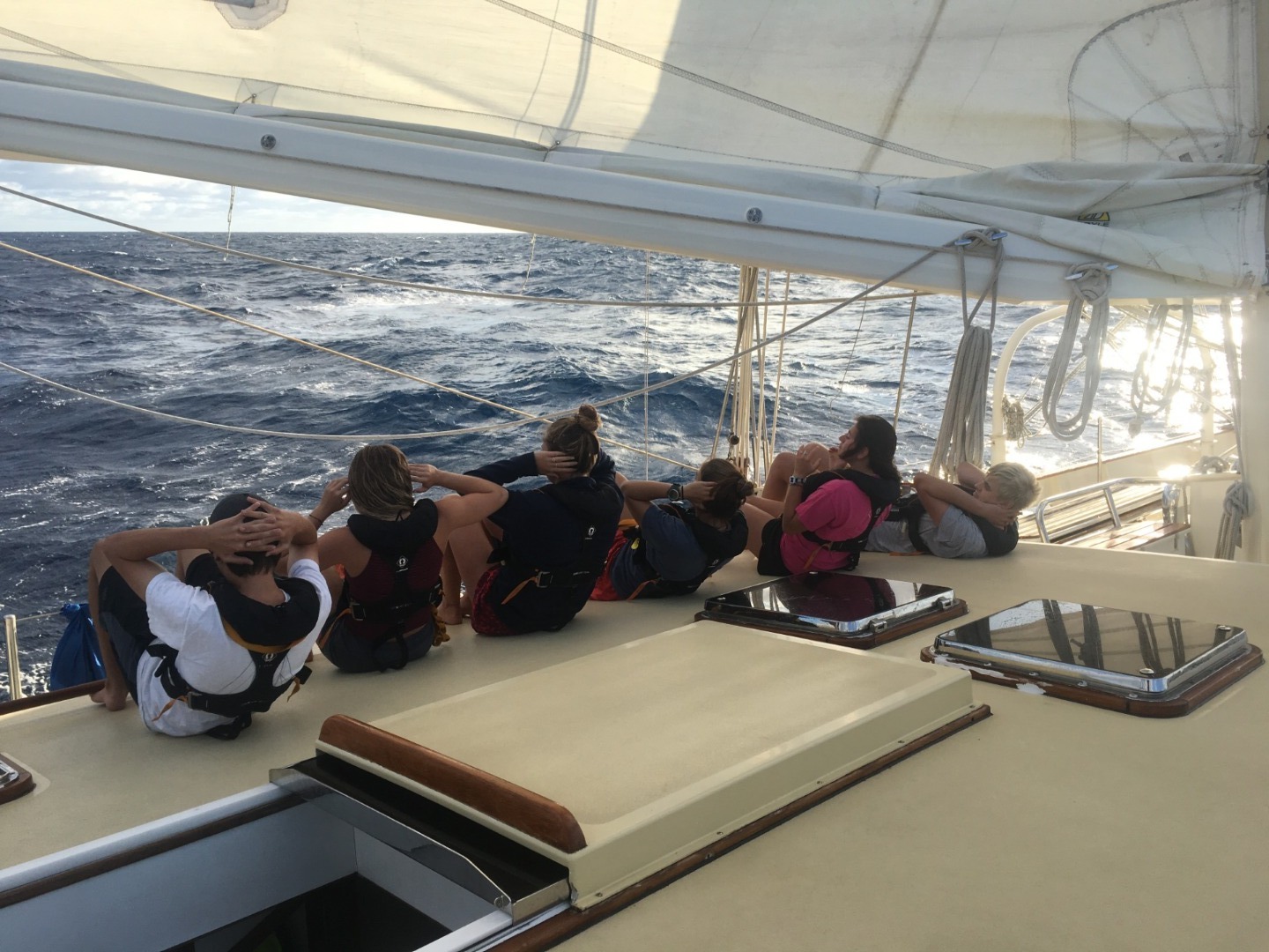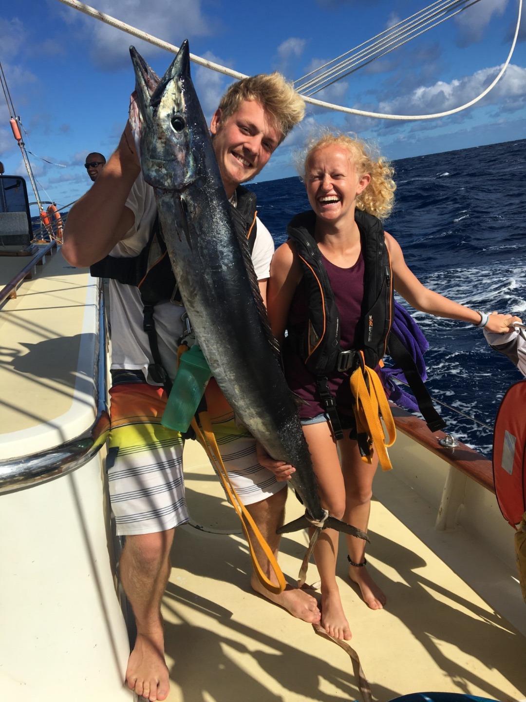 We started the day off with watches per usual, and as the sun came up, we were cruising around 10 knots! Who knew Argo could move so quickly. Watch team two had a great couple of pilates workouts, followed by watch team three, who worked on their tans while the sun was finally given a chance to shine through a cloudless sky. After some delicious risotto for lunch, we headed down for oceanography class only to be interrupted by Captain Wiggy himself. We all raced upstairs on deck to find a 5 foot, 35lb Wahoo that he had just reeled in. After settling down, we continued through leadership class and then had time for showers. I’m not sure if anyone has elaborated on our deck showers yet, but let me explain: we tie up a hose that spews saltwater out at very high water pressures, so high that almost every day, it finds a way to untie itself and flails around until someone can tame it long enough for the rest of us to shower. It’s honestly really comical and one of the funniest moments of the day. Then all of the action went to the kitchen, where head chef Amy was whipping up some amazing pizzas alongside Tina, who was creating an equally as delicious ceviche with our latest catch. Once everyone had filled their bellies over the top with pizza and fish, a pie was brought up made from fresh mangos and pears. Now I’m sure the entire crew will be sleeping well tonight after the feast we just had. Now onto night watches and many more days spent looking at the horizon enjoying sunrises and sunsets. P.S. Hi mom, I’m alive and doing well. I love and miss you.