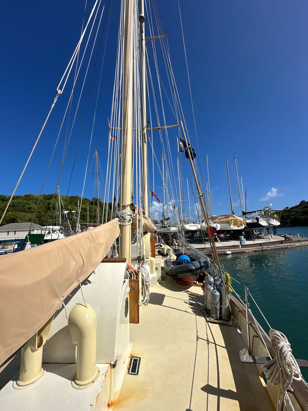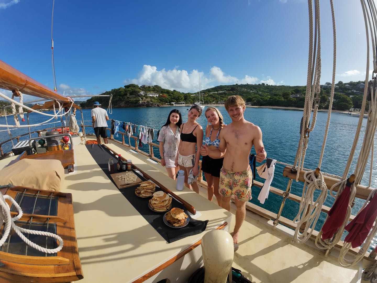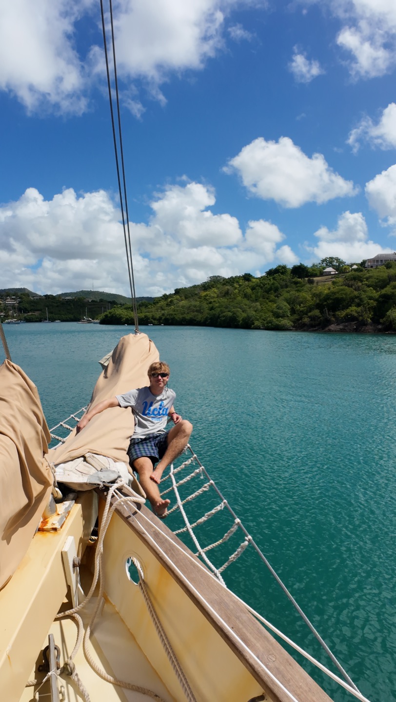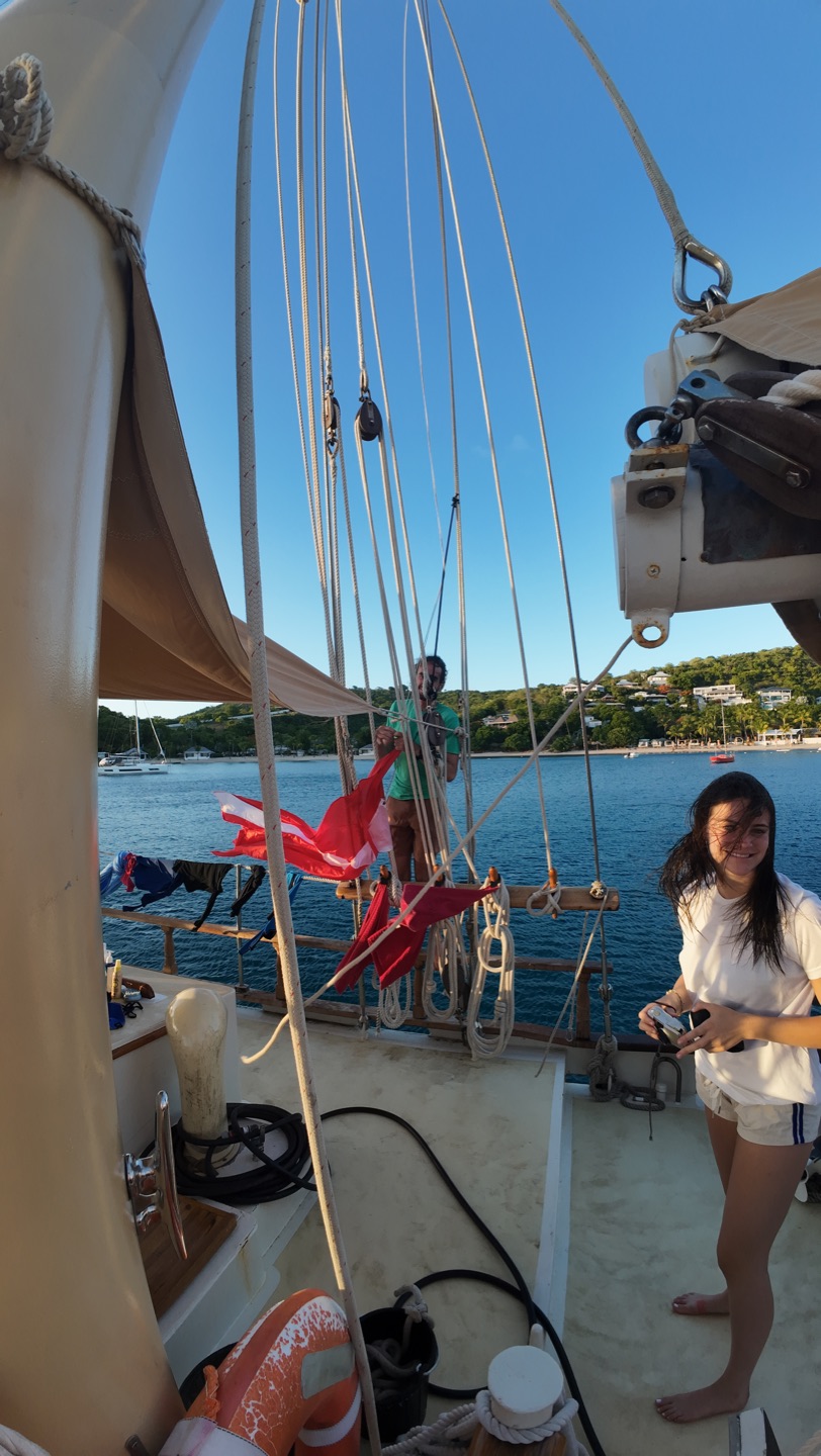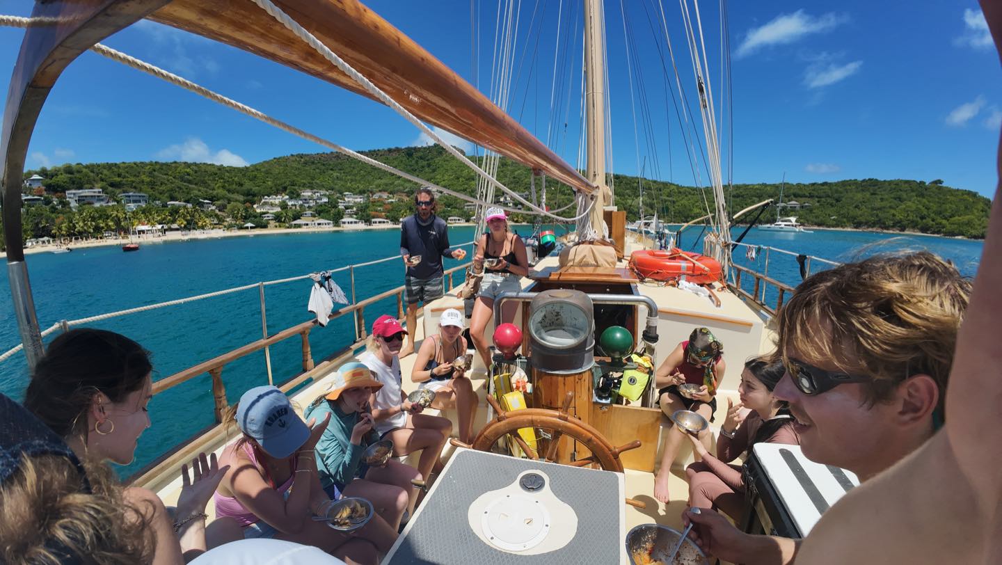 After our first night of watch shifts, all of us tired students got up bright and early. Today’s breakfast was pancakes with bananas. Even though they were a little messy, they were still pretty good. After breakfast, the certified divers suited up with the kits we made earlier this morning and got ready for our first fun dive. We all worked together to put the dinghy in the water. After we put all of our equipment in the boat, we drove off to the dive site. Doing the fun dive was really cool. We descended into clear water with great visibility. The dive was amazing, we saw an octopus, some crabs, the coral nursery, and we even did some cool tricks underwater. When we were finally done with the dive, we made our way back to the ship. The uncertified divers were ready to get in the water with their gear for the first time. While they were doing that, my group and I started on lunch. Lunch today was kind of a free-for-all, as most of us were in the water. After lunch, the certified divers decided to do dinghy lessons, and Aidan taught us how to drive the dinghy. After that, we went to town. First, we saw the museum with lots of historical information about the harbor. Then we went to a restaurant and shared mango smoothies. Even though I don’t really like mangos, having a cold drink was really nice. We walked through town for a bit before meeting up with the uncertified divers. Who, by this time, had finished their dives. After lots of fun in town, we made our way back to the docks to be picked up. Finally, the day was almost over, we swam, showered, and got ready for dinner. Tonight’s dinner was noodle bowls, and they were so good. Tomorrow, we start classes, and I am so ready to begin. Goodnight!