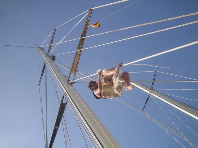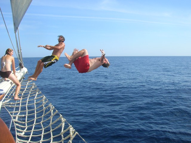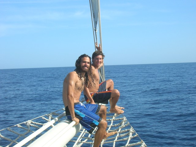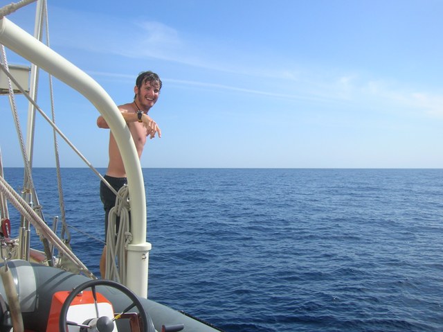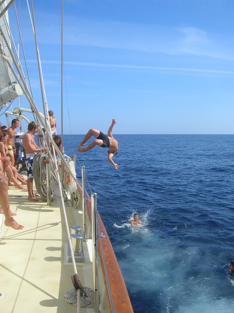 Today was a bright, sunny day underway. The wind has been light, and we have gone back and forth between motoring and sailing. We made one repair to the fisherman rigging in the morning and sent Evan up the mast to repair it. In the afternoon, we crossed the 3000nm mark on the trip, and about 6nm later, we entered into the tropics. The water has also gotten warmer, and the crew enjoyed our time to swim and do some backflips off the bow. Overall, it has been a great day.