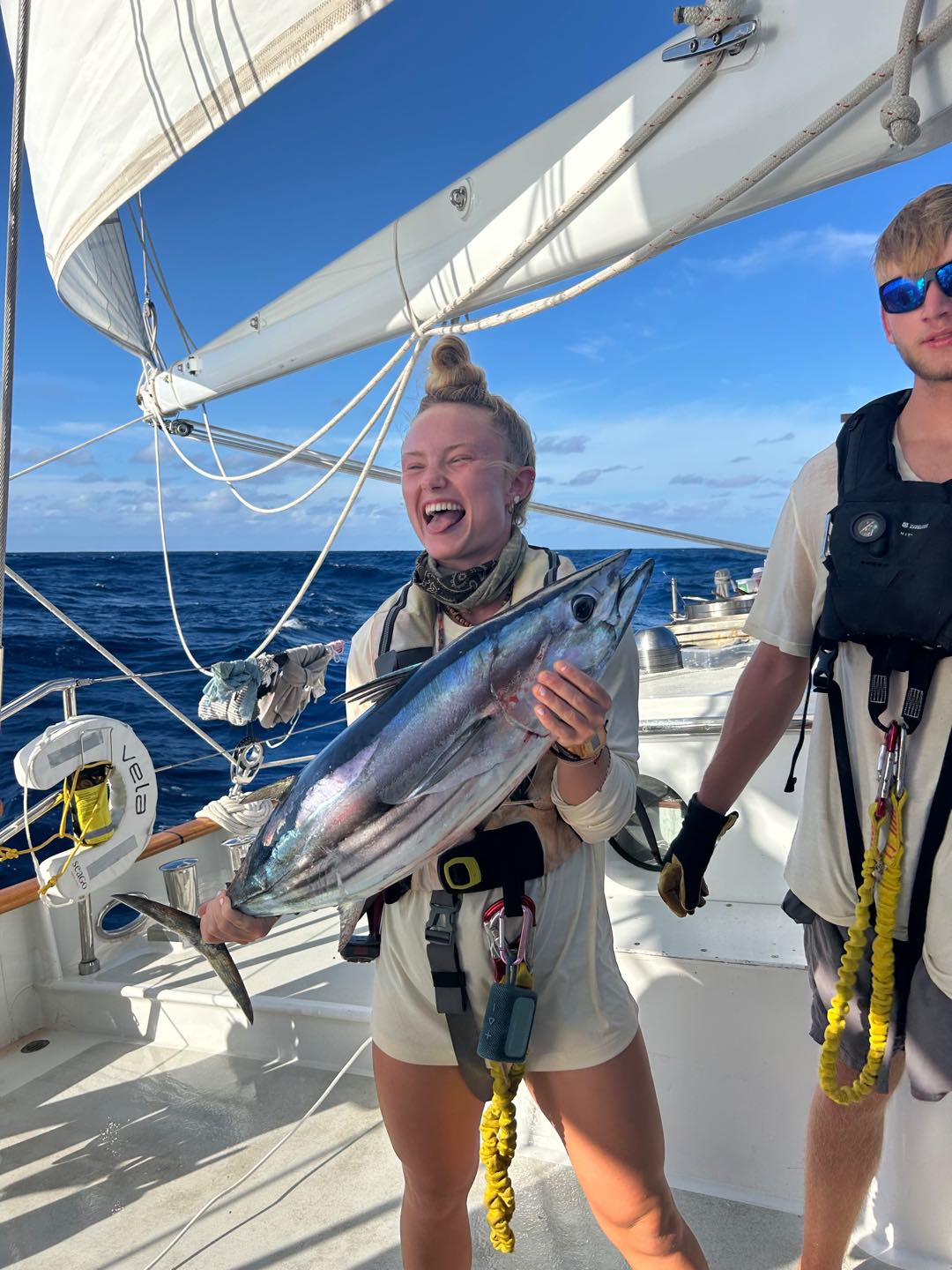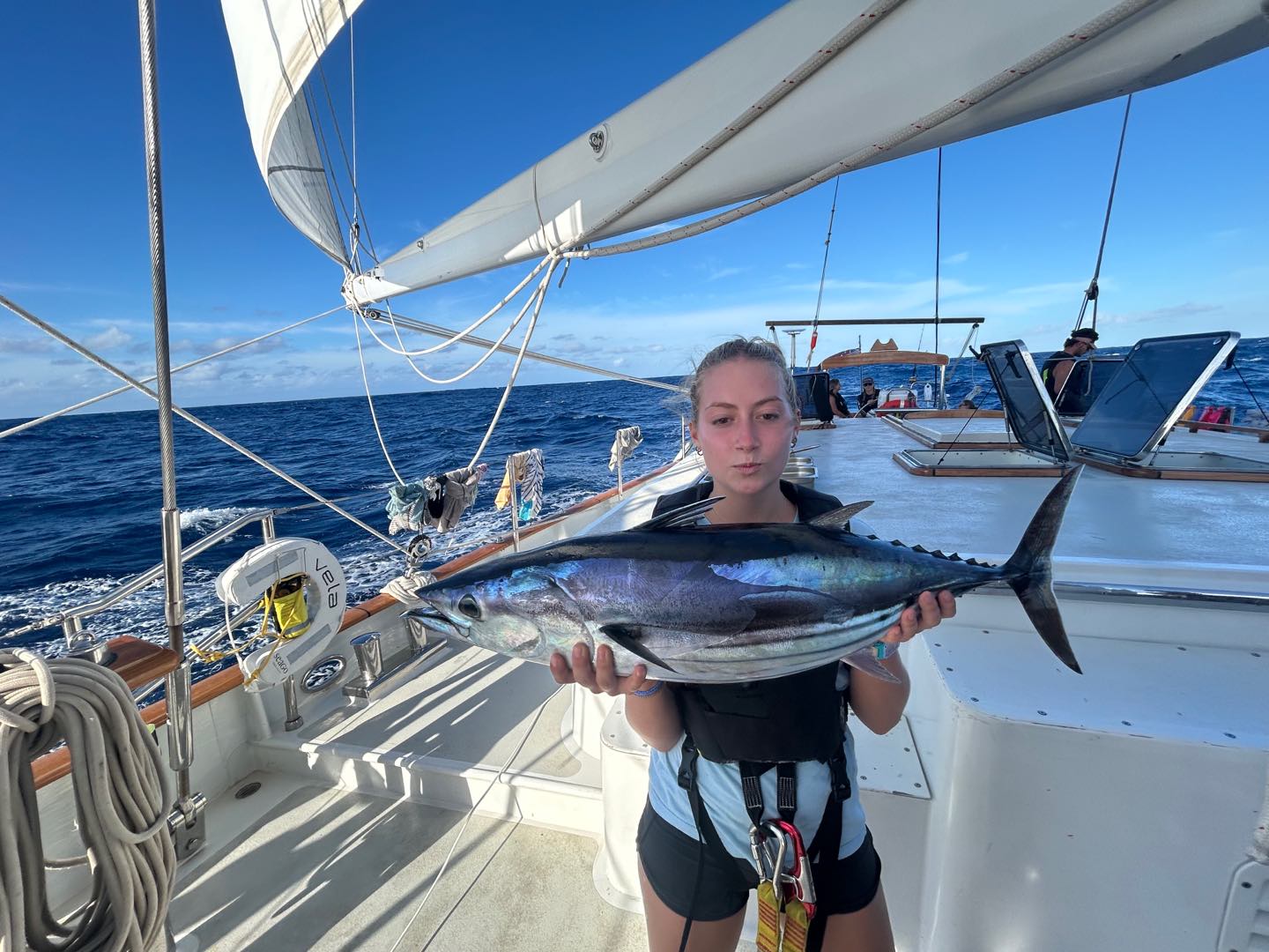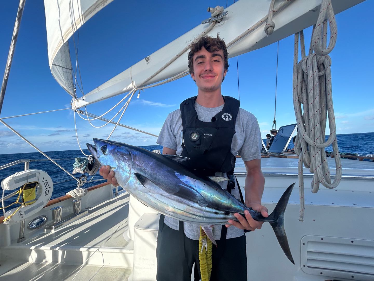 Once again, we have good news from the Seamester Fishing Team aboard Vela. After a passage of snapped lines and lost lures, we got some scores. Today, we redeemed ourselves after yesterday’s performance, losing a really beautiful Yellowfin Tuna just a second before I could get my hands on it. We decided not to gaff it aboard, it was a 30-40 pounder, but as we were raising it up from the water, the fish smacked the transom and came off the hookbig disappointment. Yesterday wasn’t all a failure, because the fellas reeled in a nice Skipjack while I was writing my exam. Around the same time, around 5:20, 2 hours before I wrote this, we got a bite and rushed up to feel a pretty heavy load on the line, but not much fighting. We could see about 300 yards out what looked like a small fish, planning on the surface. Maya L got on the rod and reeled it in, followed by Henry, Jake, Jay, Ben, and me. We got it real close to see it was a good-looking fish, then I got down, against my nerves, to pull up the line by hand. I was thinking It was gonna suck so bad if it gets off like yesterday, but I got it safely aboard. We took a look to see it was a real fat Skipjack, to which we named Maya, before Jake came down and knocked it out with the club. Ben, Henry, and I filleted it, and tomorrow I’m gonna sear the steaks in sesame oil, then dish it out with soy sauce and rice, maybe. Regardless, we, the crew of Vela, have enjoyed a steady supply of Tuna, and more is yet to come. Personally, I’m really jonesing for Dorado, but I’m not complaining with the scores we’ve been ripping in. I’ll drop some pics in there too.