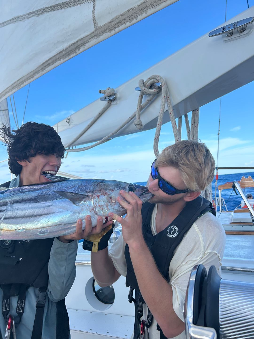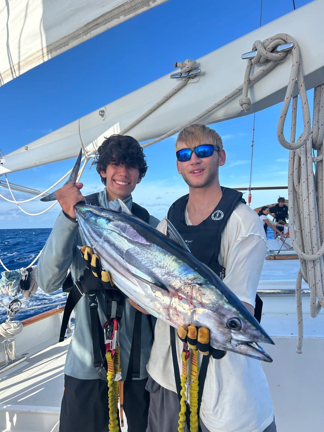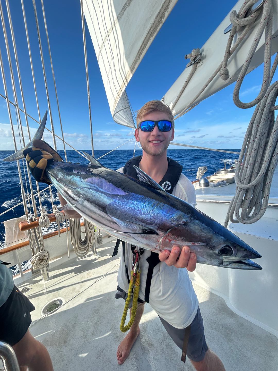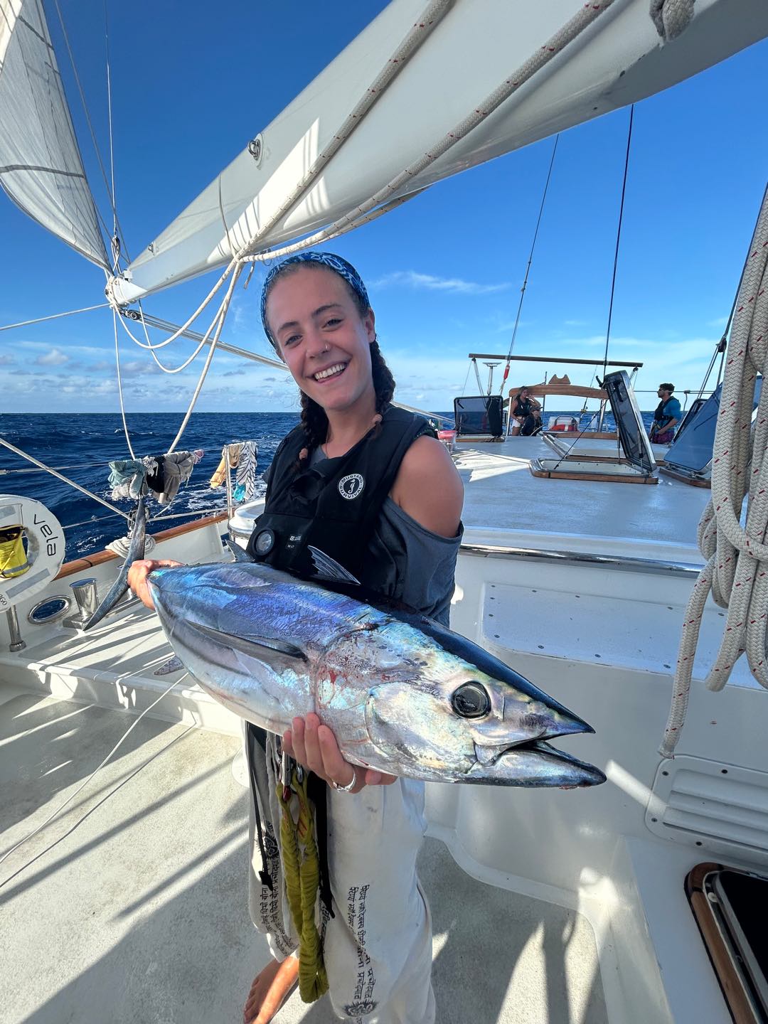 Once again, we have good news from the Seamester Fishing Team aboard Vela. After a passage of snapped lines and lost lures, we got some scores. Today, we redeemed ourselves after yesterday’s performance, losing a really beautiful Yellowfin Tuna just a second before I could get my hands on it. We decided not to gaff it aboard, it was a 30-40 pounder, but as we were raising it up from the water, the fish smacked the transom and came off the hookbig disappointment. Yesterday wasn’t all a failure, because the fellas reeled in a nice Skipjack while I was writing my exam. Around the same time, around 5:20, 2 hours before I wrote this, we got a bite and rushed up to feel a pretty heavy load on the line, but not much fighting. We could see about 300 yards out what looked like a small fish, planning on the surface. Maya L got on the rod and reeled it in, followed by Henry, Jake, Jay, Ben, and me. We got it real close to see it was a good-looking fish, then I got down, against my nerves, to pull up the line by hand. I was thinking It was gonna suck so bad if it gets off like yesterday, but I got it safely aboard. We took a look to see it was a real fat Skipjack, to which we named Maya, before Jake came down and knocked it out with the club. Ben, Henry, and I filleted it, and tomorrow I’m gonna sear the steaks in sesame oil, then dish it out with soy sauce and rice, maybe. Regardless, we, the crew of Vela, have enjoyed a steady supply of Tuna, and more is yet to come. Personally, I’m really jonesing for Dorado, but I’m not complaining with the scores we’ve been ripping in. I’ll drop some pics in there too.