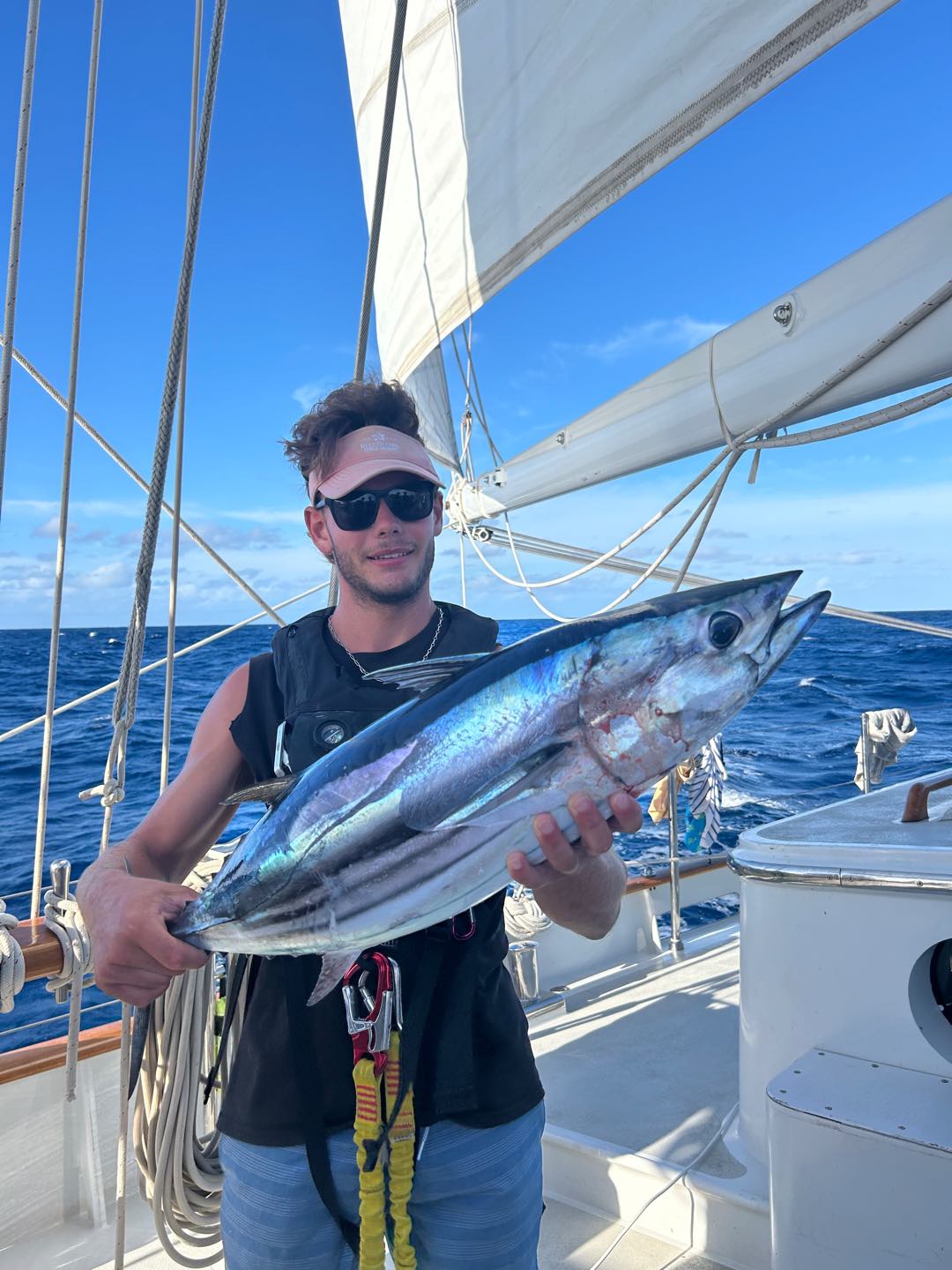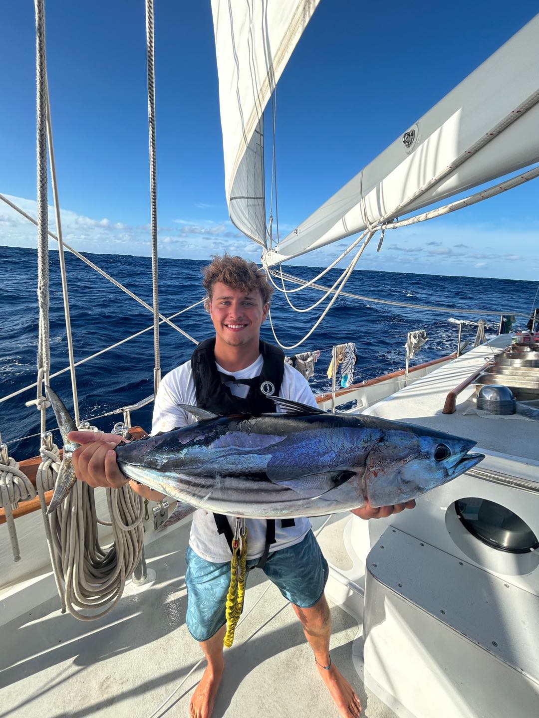 What’s up, Doctor Jim? We’ve been doing real nice on the fishing. I was wondering if we’re gonna be able to take the rod back home? Maybe I can carry it on the plane back, but Idk, it’s a really nice one. Anyways, I’ve been having a really amazing time out here, and being on the ocean is just really, really cool. I’ve come to like the night watches, the shooting stars, and the satellites passing overhead are really cool. While we’ve been sailing, there have been times when the closest people to us have been in orbit, which is wild.