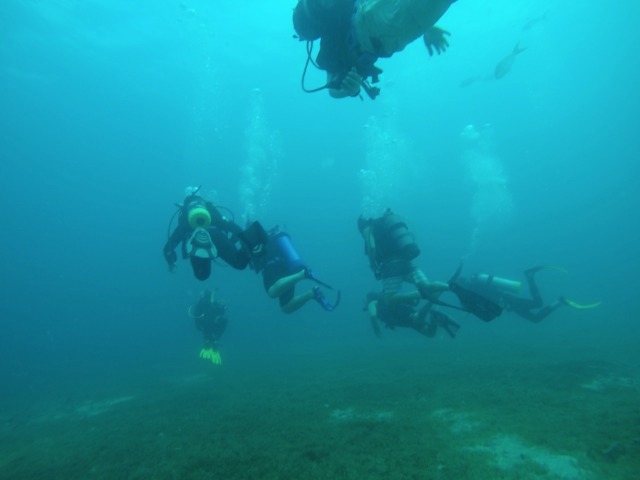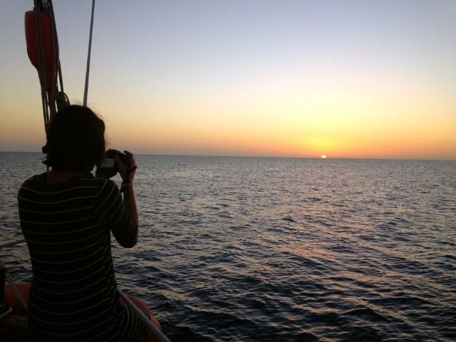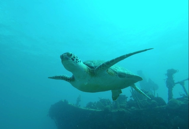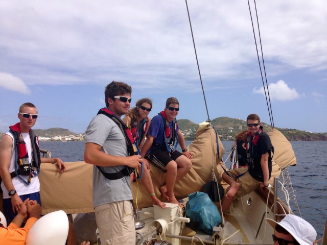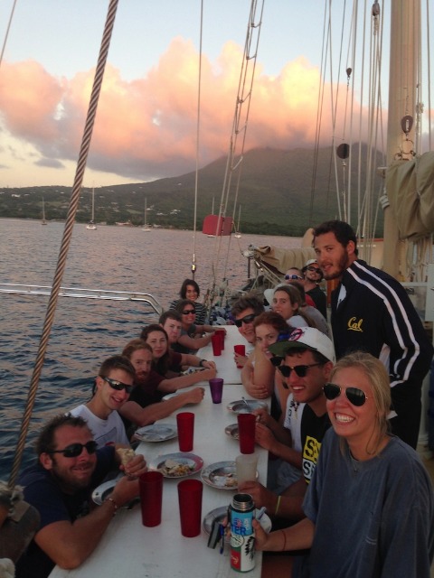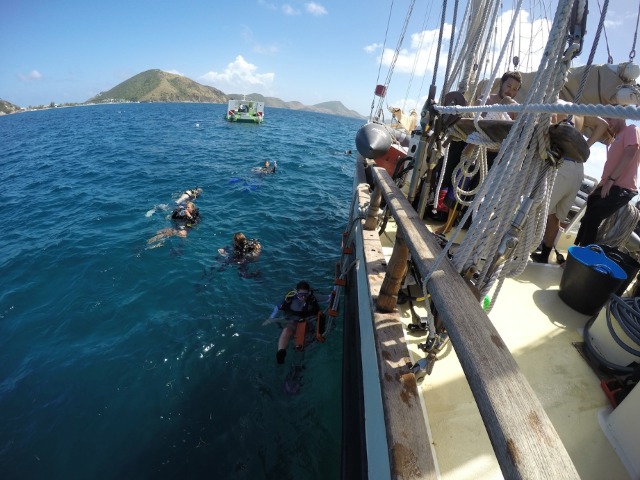 Today did get off to a little bit of a late start because we had underestimated the amount of time it would take for the banana bread to bake, but it was worth the wait for the delicious, warm breakfast that we got to eat. After breakfast and a marine biology class, we motored to a dive site where we got to dive into the sunken wreck of the River Taw. Not only was it an awesome dive where we saw a beautiful green sea turtle, but it was also the 4th and final open water certification dive. Finally, it was time to depart to Nevis, the island next to St. Kitts. When we got there, it was time for all open water students to fill out their logbooks for their first four open water dives, and we are now happy to report that they are done with their open water course! Lastly, we shook things up a little at dinner by sitting on the opposite side of the boat and enjoying some wonderful fish tacos while watching a beautiful Caribbean sunset.