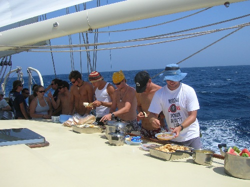 It’s been another blazing hot but awesome day. Although for being in supposedly some of the most shark and pirate-infested waters, I have yet to see either Last night was a busy one for bow watch- ships were flying past us from every direction! Unfortunately, this also means lots of radioactivity. I say unfortunately because 99.9% of what comes over the airwaves is completely useless and annoying noise and chatter. These seamen are like little bratty kids with walkie-talkies! Ah well, there are worse things to deal with in life, I suppose. OCE students finished up giving presentations on everything from sea turtles to red tides. Our reward: midterm tomorrow, which meant studying the rest of the day. We closed out the day with a relaxing curry supper cheffed up by Eliot and Abbey.
