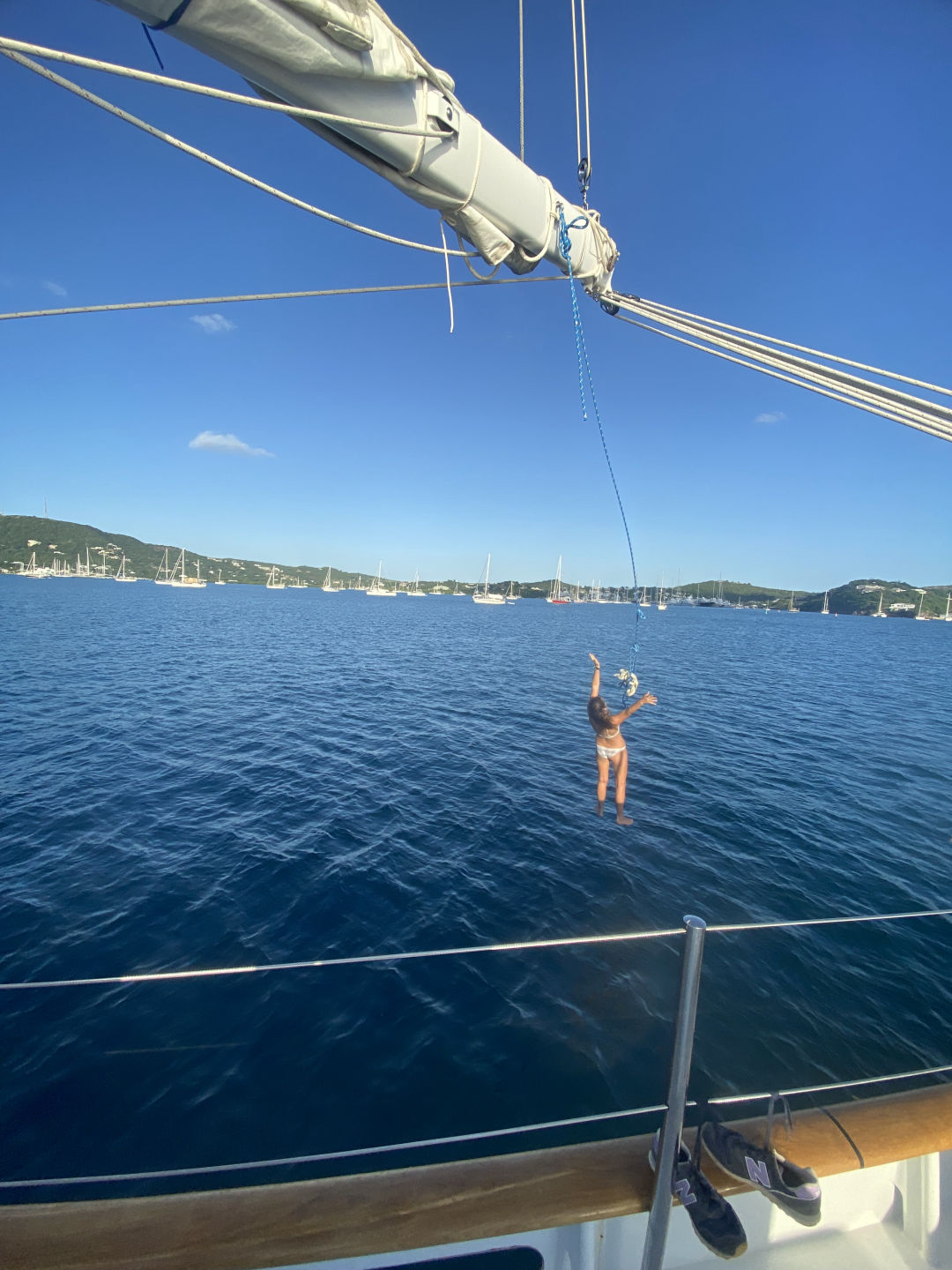 Our arrival in Antigua around lunchtime was a momentous occasion, evoking extremely mixed emotions from all. On the one hand, all of the knowledge and skills we learned over the course of the semester were put to use and demonstrated as we successfully dropped anchor after an entire student-led passage. We proved to ourselves that we are entirely competent sailors and really have come to work well as a team. On the other hand, this was our very last time dropping anchor all together on Vela. We were filled with a sense of pride, accomplishment, and sadness as we realized that this is officially the beginning of the end. Seeing as we still have about a week left together, though, we did our best to soak in the glory and embrace the time we have left together. We had all hands on deck to put the boat to bed as quickly as we could so that we could spend the day swinging off the starboard side of the boat on a boom swing. Tremendous fun was had, and only a few mild injuries were suffered, signifying a raging success according to our standards. Afterward, rescue diver candidates went for a dive to continue meeting requirements for their certification. By the time everyone had surfaced, the rest of the crew of Vela had made the swim over to Ocean Star, which happened to be anchored right next to us. We toured their boat and socialized with outsiders for the first time in nearly ninety days. After meeting them and talking for a bit, we got ready and met back aboard Vela for dinner and ice cream altogether. Some of the boys of Vela took this opportunity to exemplify peak riz, filling the starboard six stack and the salon with cologne in the process.