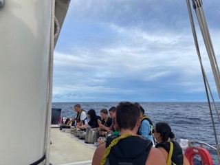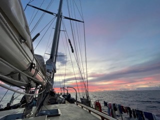 After yesterday’s fun equator day, we had a normal day today. A normal day for us = eating lunch in the rain, cleaning on a boat always in motion, having class in a sauna, doing boat checks every hour, having a squeeze session after supper, and cleaning again with a nice sunset (bright pink tonight !) You might not be able to experience our lifestyle of passage, but if you are searching for your next movie, you can watch “Chasing Corals” on Netflix, like we did in marine biology class today. Coral bleaching might not be a fun topic, but it is pertinent for us who have been and will be diving near reefs. The squeeze question tonight: tell a story about a scar you have. Everyone has had a life before the boat, and different stories to tell, some of us already have scars from this trip, which means life long memories.