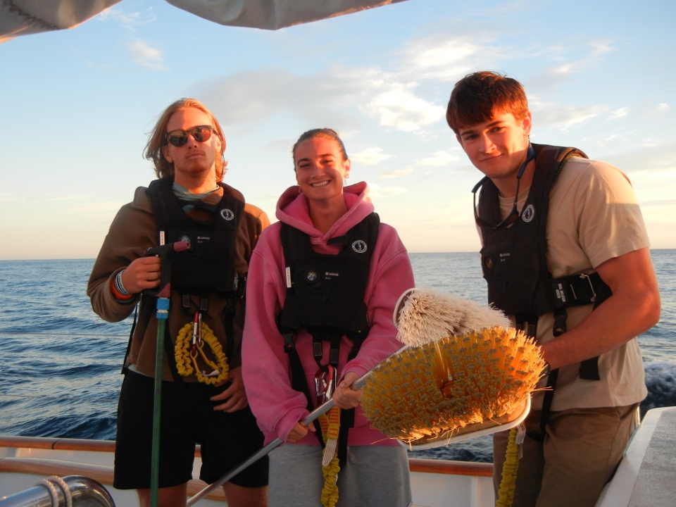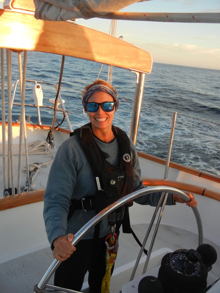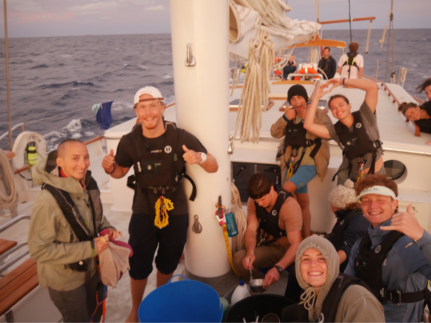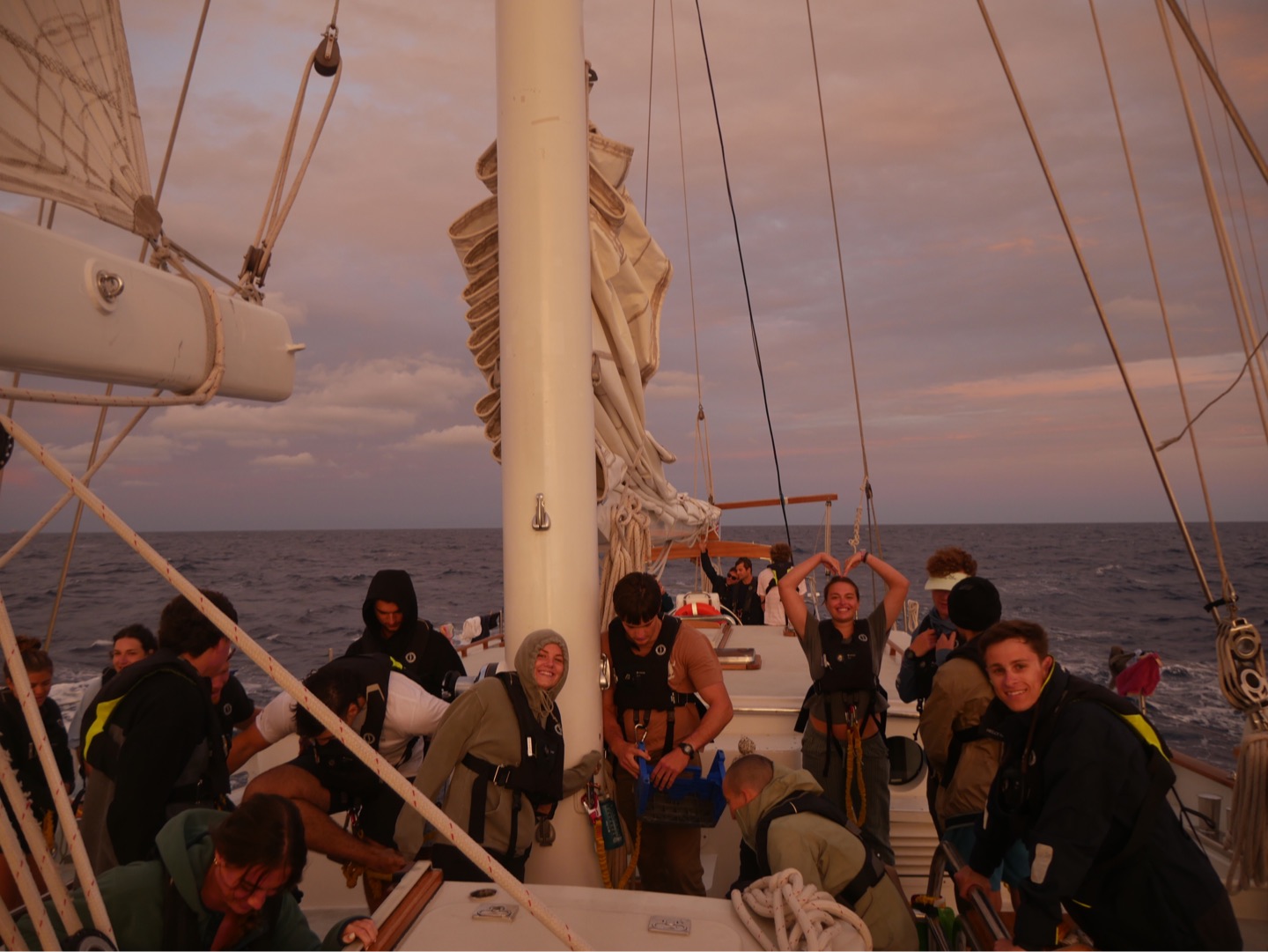 Everyone woke up to the smell of pancakes cooked by Grace C., Smash, and Mac R. Grace C. even hand-whipped the cream, which was delicious. Topped with dollops of fruit yogurt and fresh pineapple, it was my favorite breakfast of our voyage so far. After clean-up, we began passage prep, and the shipmates swiftly went through all of the tasks efficiently and collaboratively. Chloe and Jesse led the chore of taking sail covers off, which is a bigger job than one would think! James, Watson, Brendan, Dan, and Grace C. attached halyards to the sails, which is a really fun task. Eliza, Dan, Brendan, Emma, Ben, and I ran the jib sheets. Claire and Grace C. checked the steering to ensure proper functioning. Mac L. prepared the engine room and chart house, checking all machinery and electronics. Luke ensured that the salon and galley were 40/40, which means that nothing would fly out at 40 knots of wind or be heeled over at 40 degrees. On passage, we have already had some pretty swell days. Things can fly across from port to starboard, so this is an important task! Tom and Smash cleared us out of customs, and Lukas put everything away in the storage locker at the stern (the lazarette).